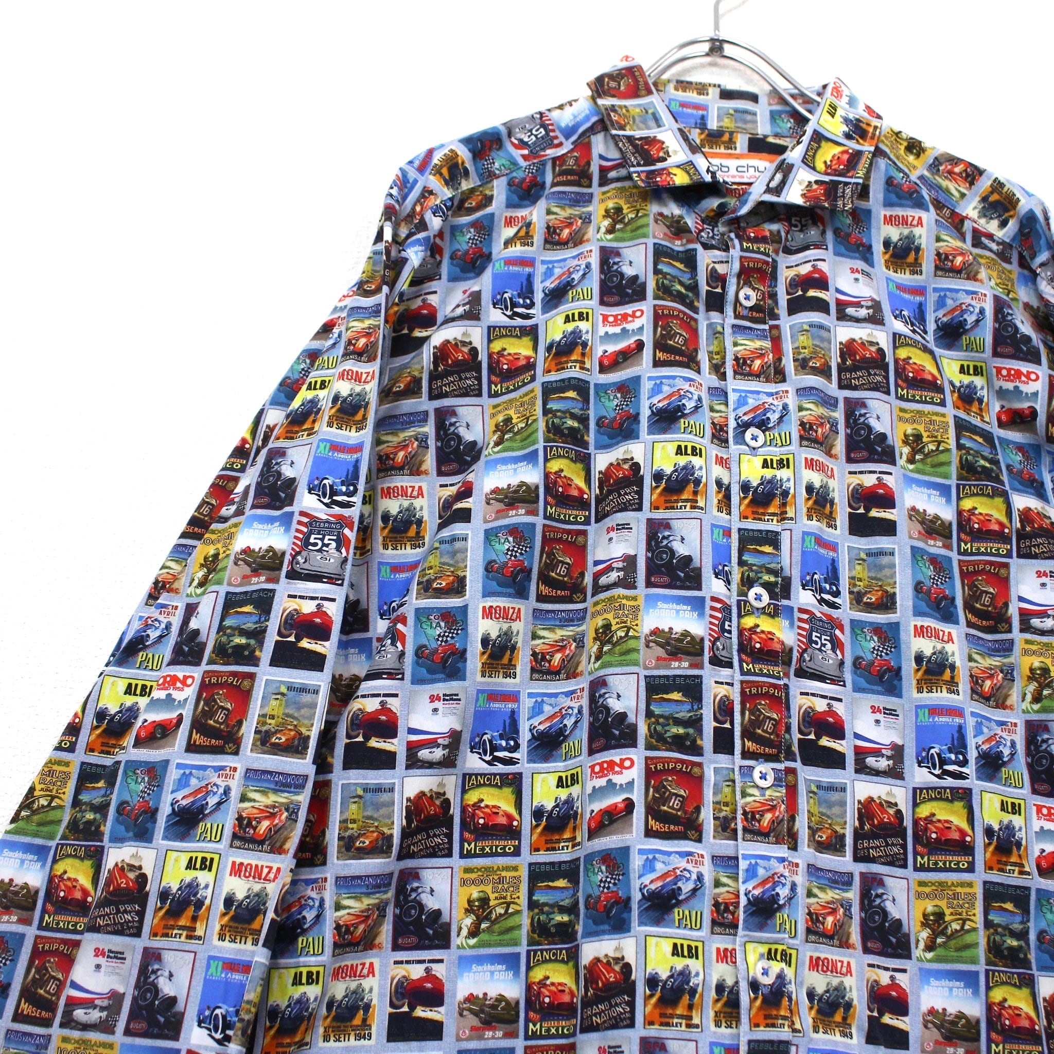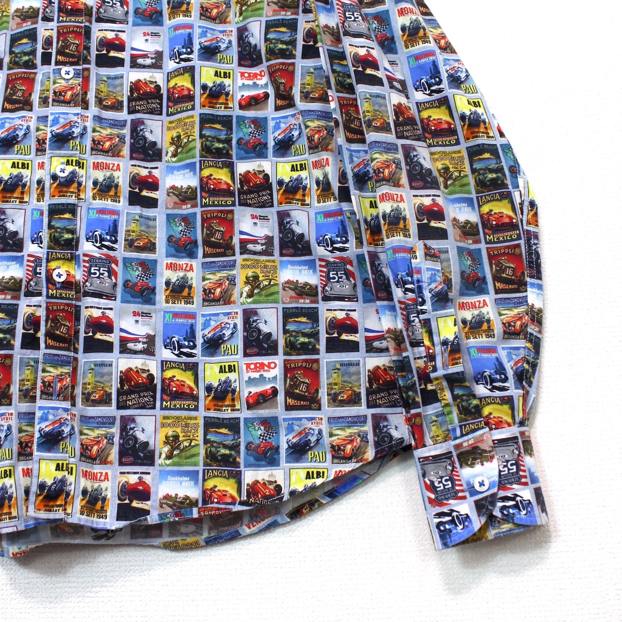 ボディ全体に、レトロな雰囲気を漂わせるスポーツカーのデザインをみっちりと載せた長袖シャツ。