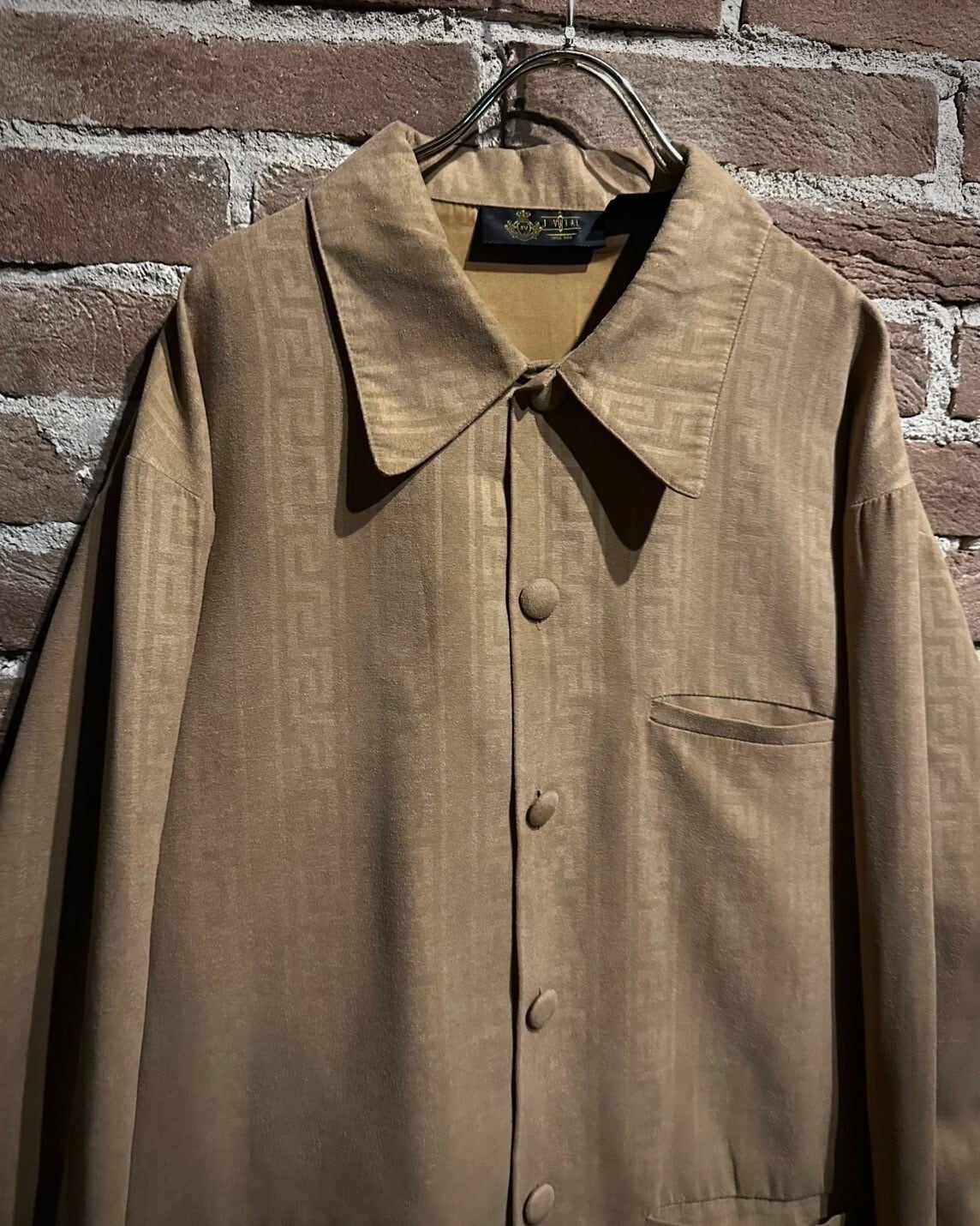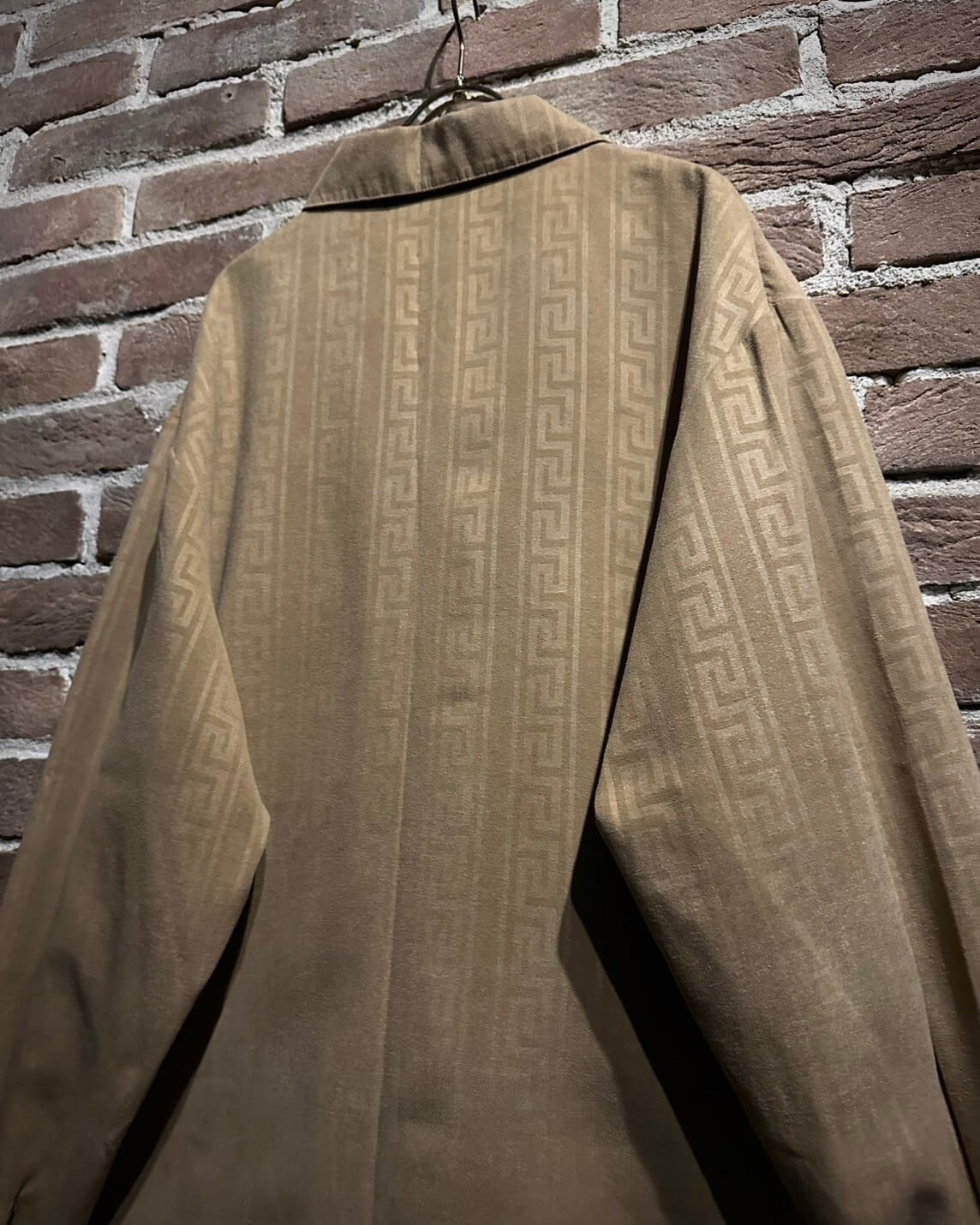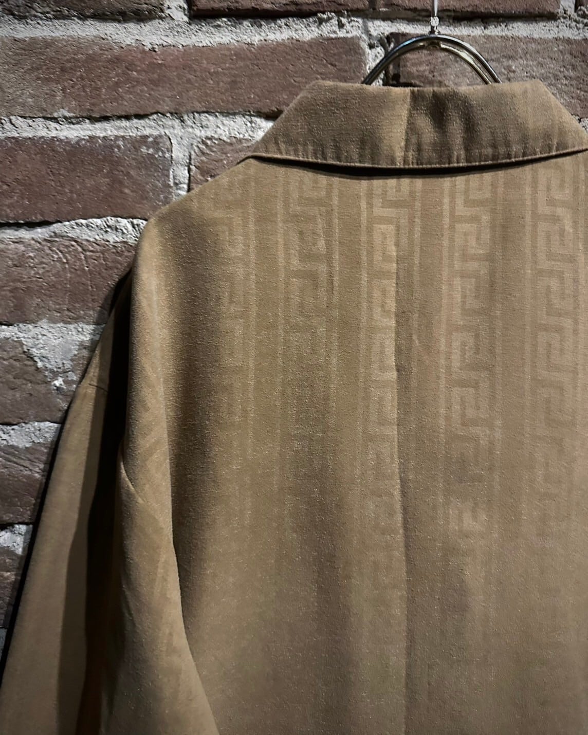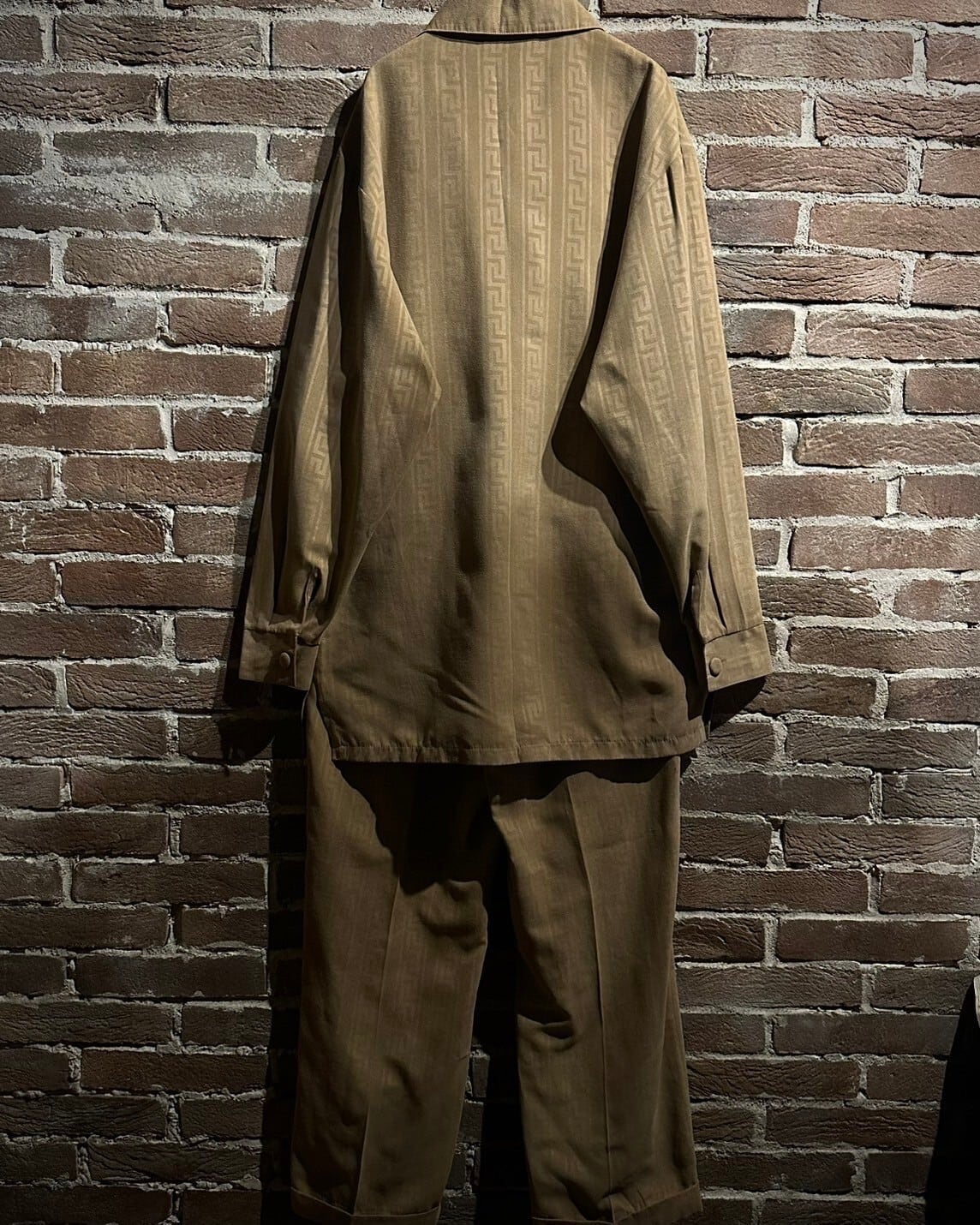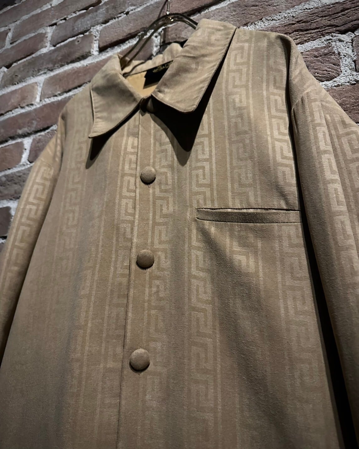 若干の起毛感があるベージュのボディに、ヴェルサーチなどラグジュアリーブランドのモチーフとしても用いられる"グレカ模様"を載せた、稀有なシャツセットアップの逸品。