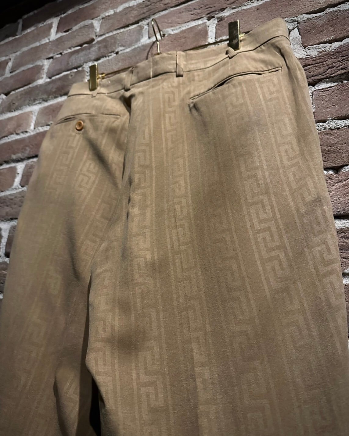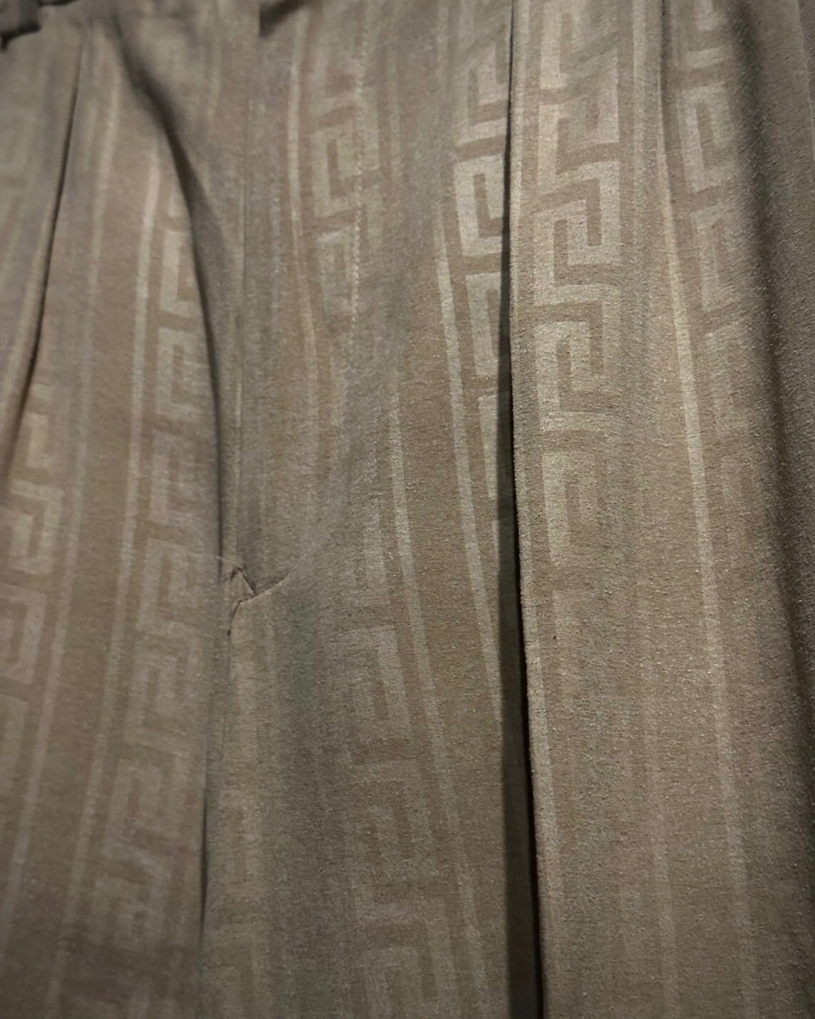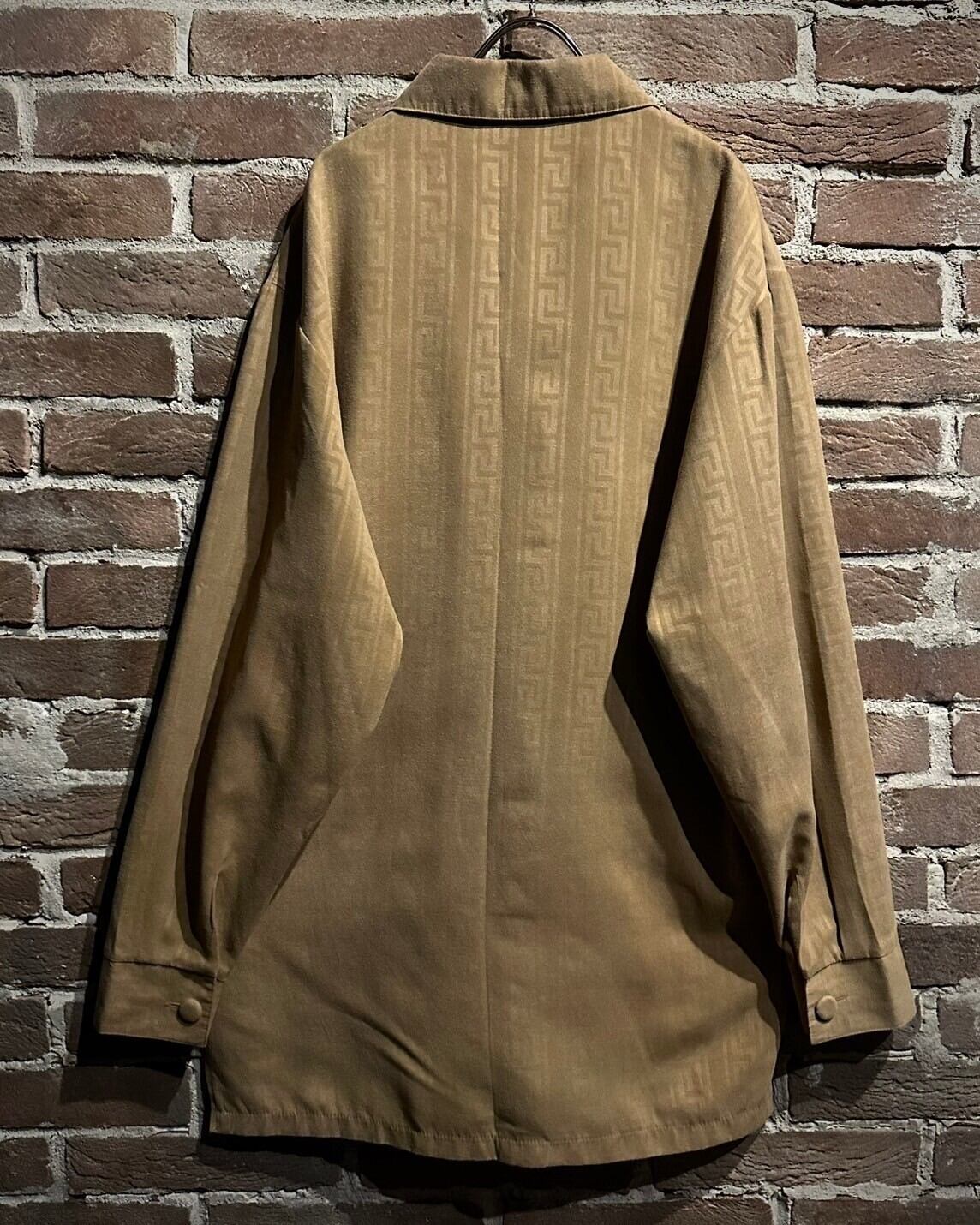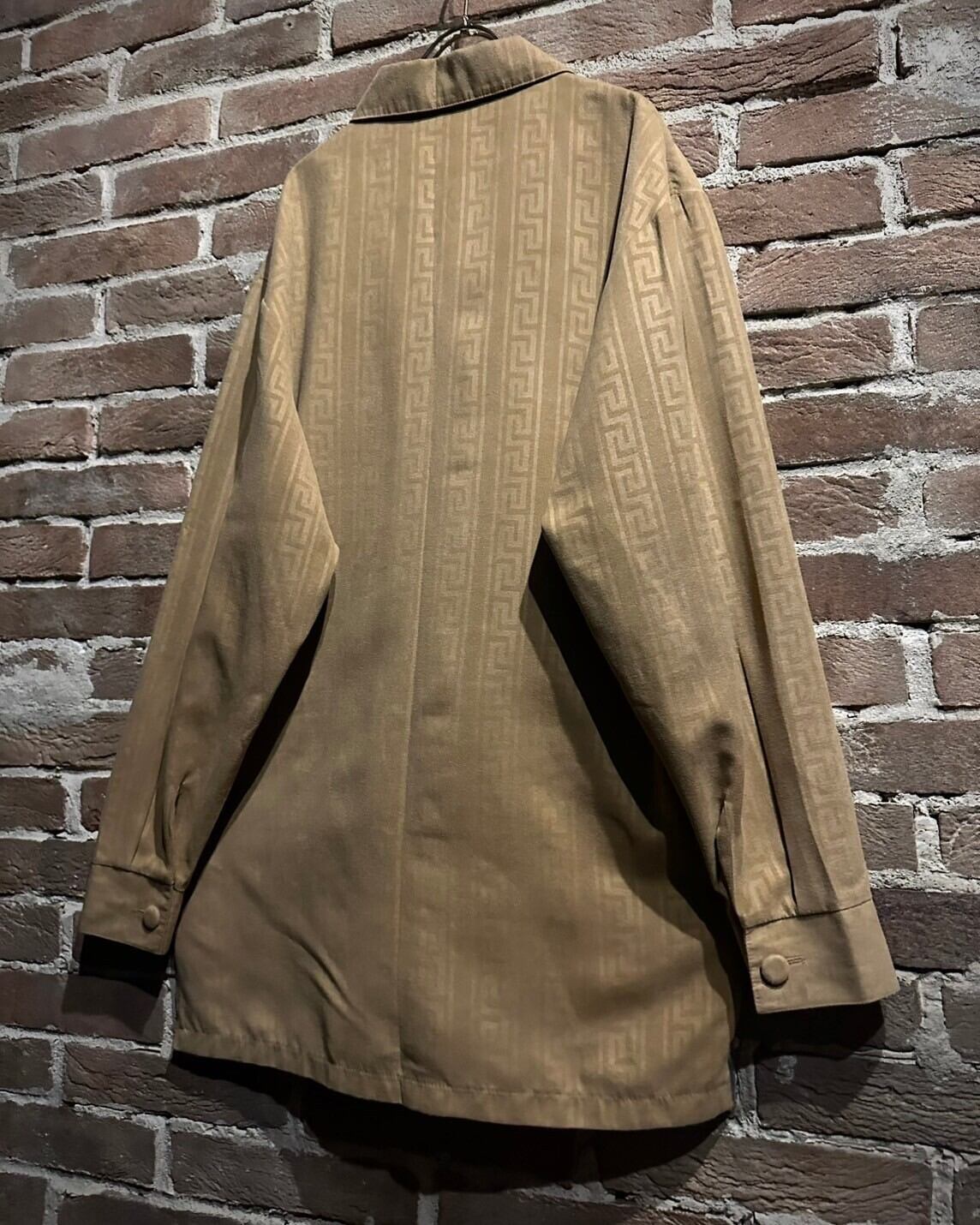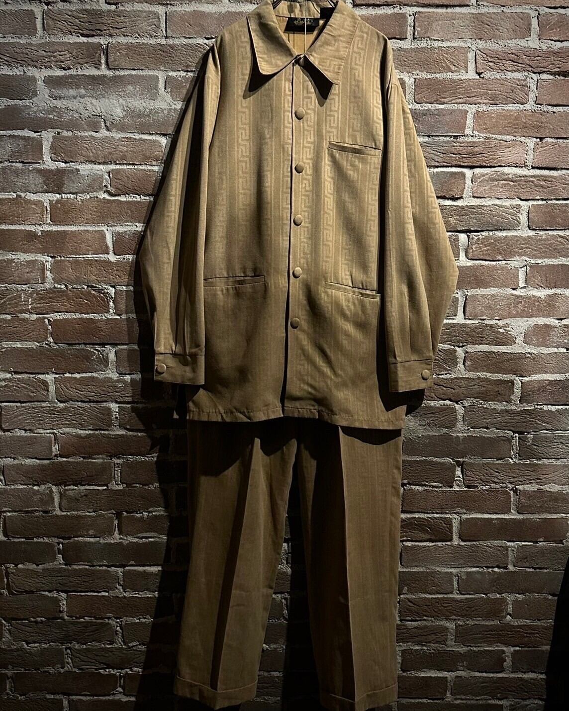 若干の起毛感があるベージュのボディに、ヴェルサーチなどラグジュアリーブランドのモチーフとしても用いられる"グレカ模様"を載せた、稀有なシャツセットアップの逸品。