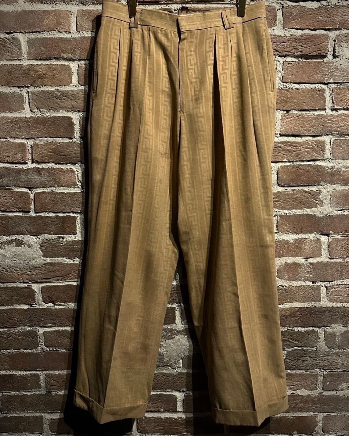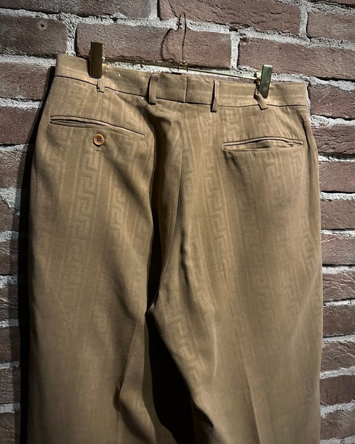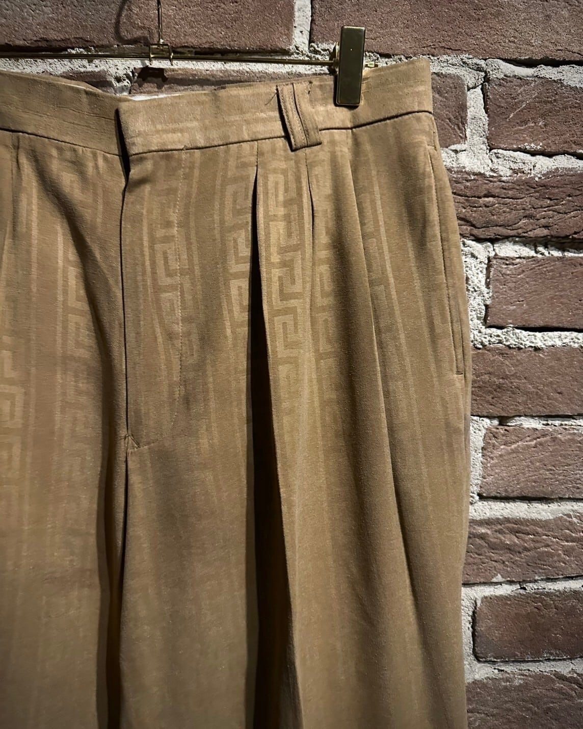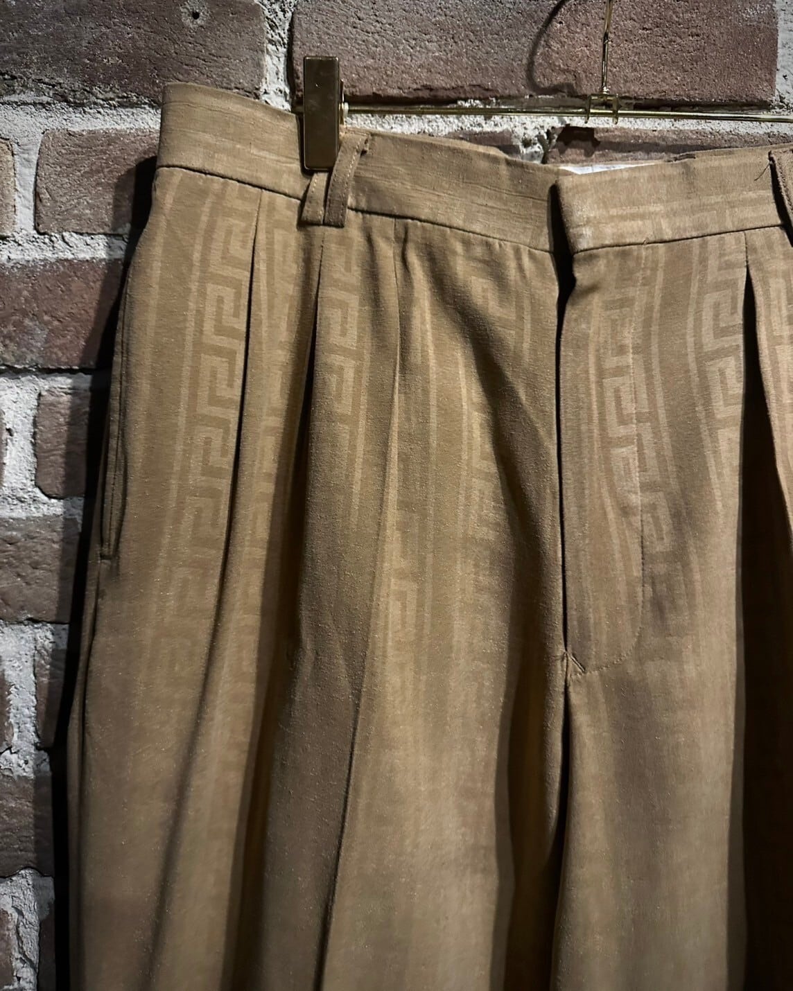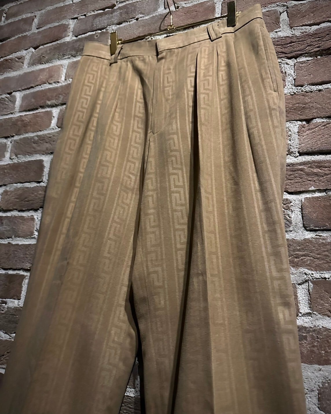 若干の起毛感があるベージュのボディに、ヴェルサーチなどラグジュアリーブランドのモチーフとしても用いられる"グレカ模様"を載せた、稀有なシャツセットアップの逸品。