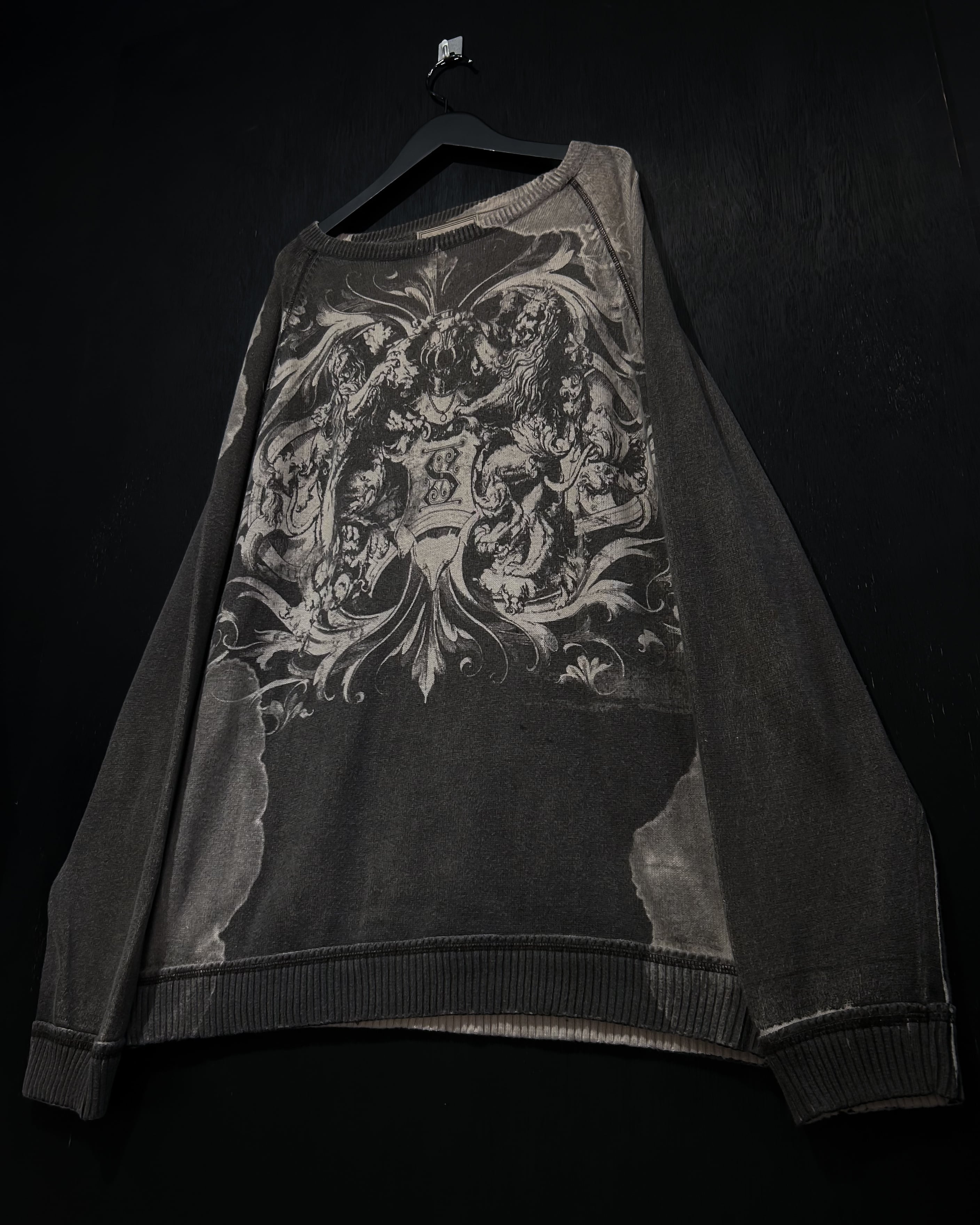 退廃感のある、フェードグレーのボディをベースに、荘厳かつどこか神秘的な雰囲気を漂わせるゴシックなデザインを載せたニット。
