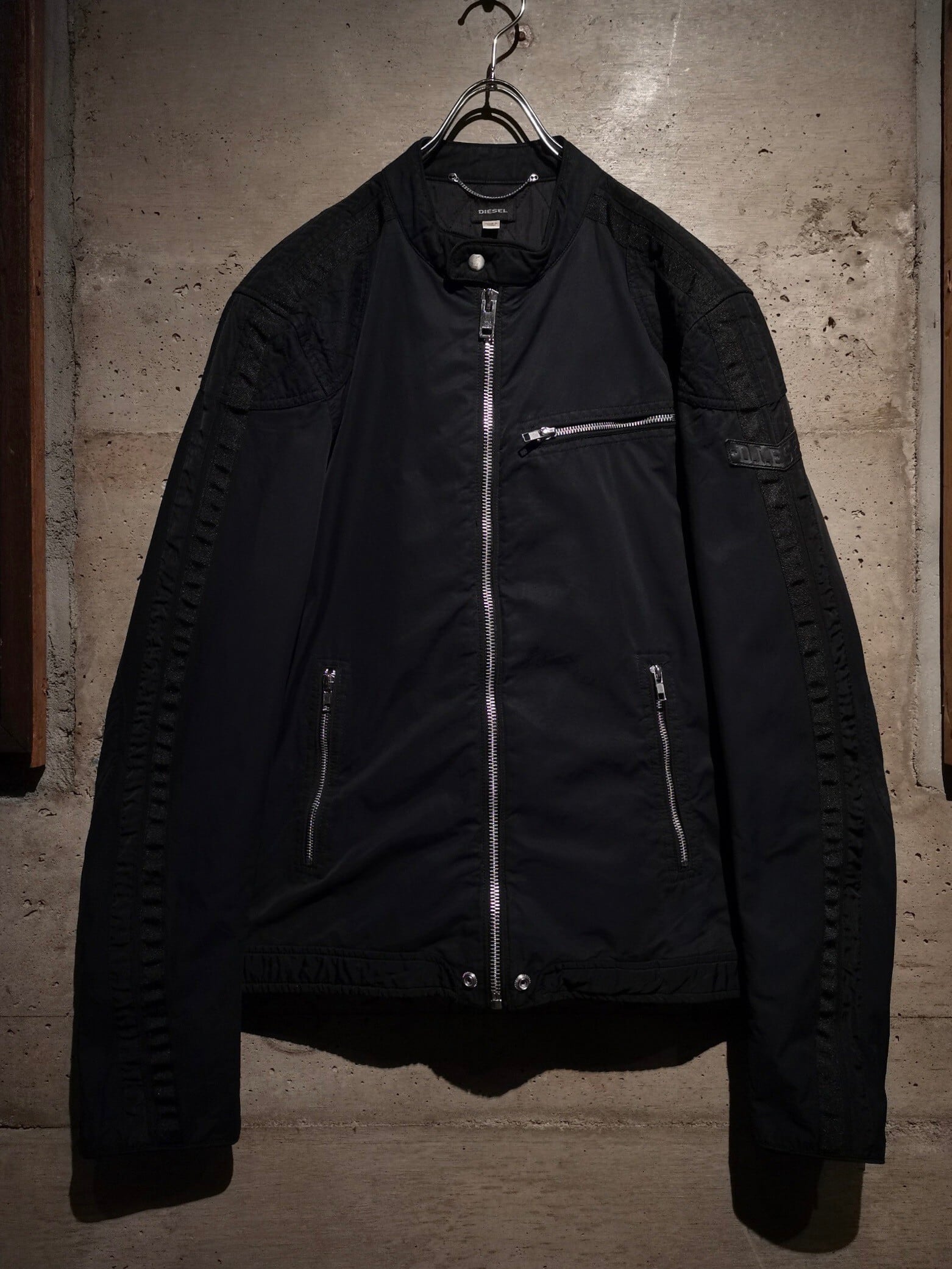 コットン×ナイロンを用いたタフな素材を用いてシングルのライダース型に落とし込まれた、"DIESEL"では稀有なテクニカルな表情を見せるデザインに仕上げられたジャケット。