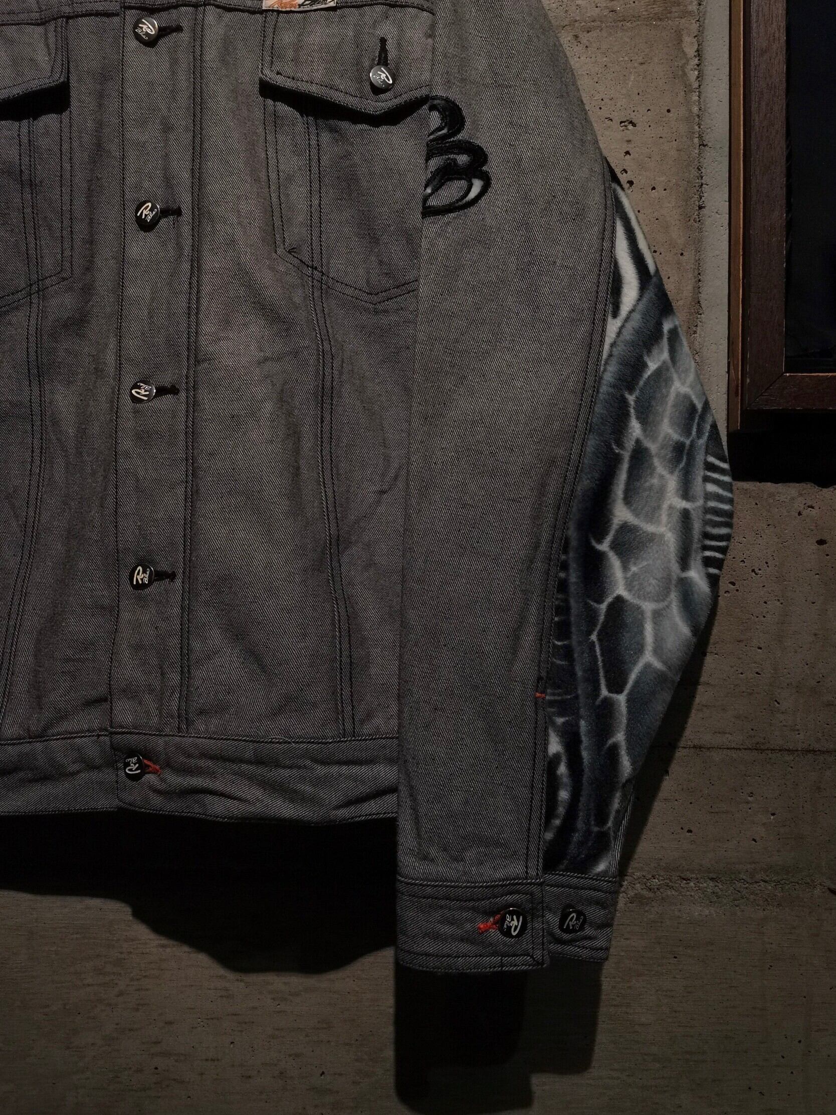 デニム地の裏面を使用したボディに、騙し絵のように描いたアニマルパターンを背面に切り替えた、インパクトのあるデニムジャケットの稀有な1着。