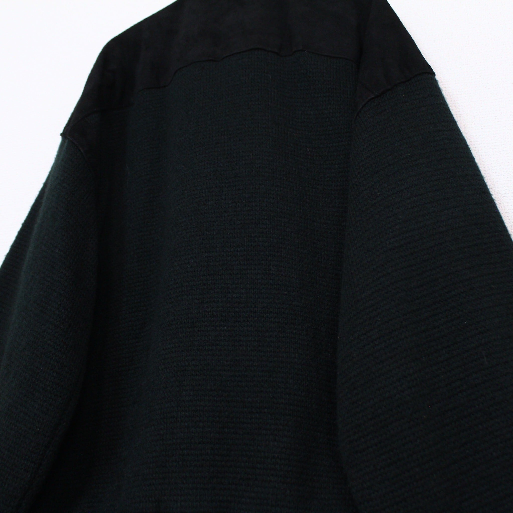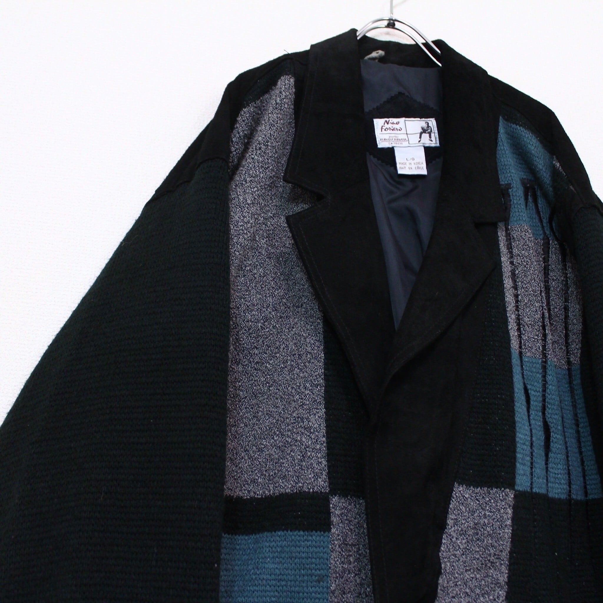 グレー、黒、水色をアシンメトリーに切り替えたボディに、左身頃に刺繍でラインのデザインをON。そしてラペルにしっとりと柔らかなスエードレザーを切り替えた稀有なニットジャケット。