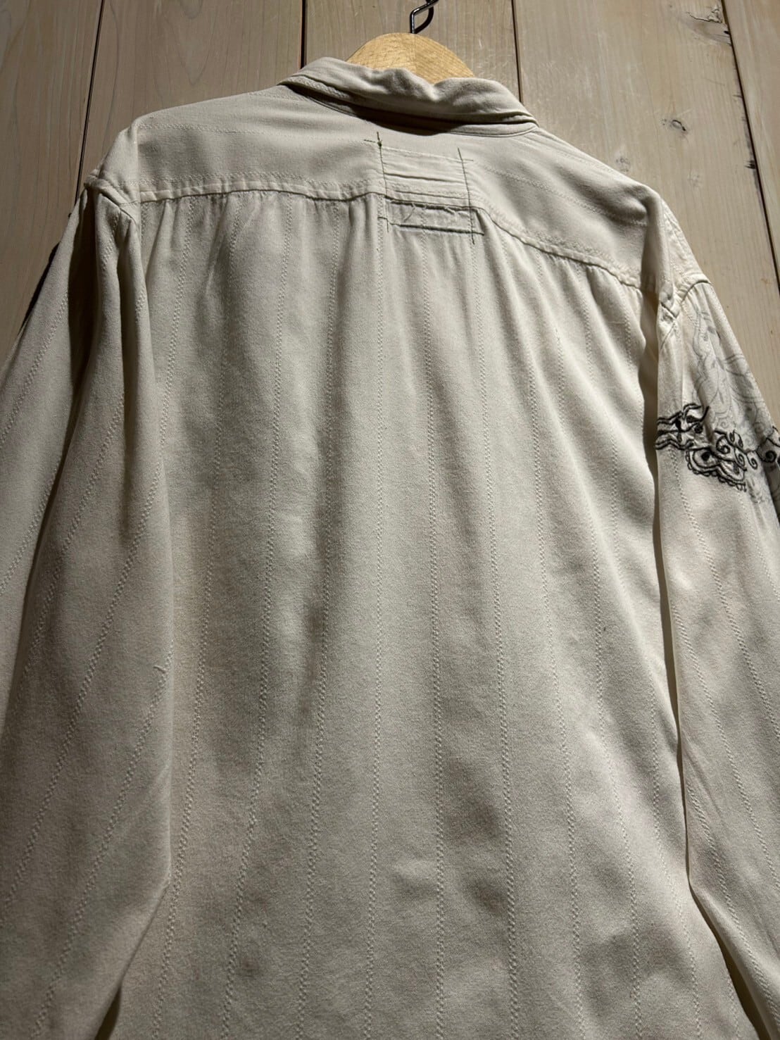 肌触りの優しいホワイトのボディに、肩、アームにペイズリー柄の刺繍を刻んだ長袖プルオーバーシャツ。