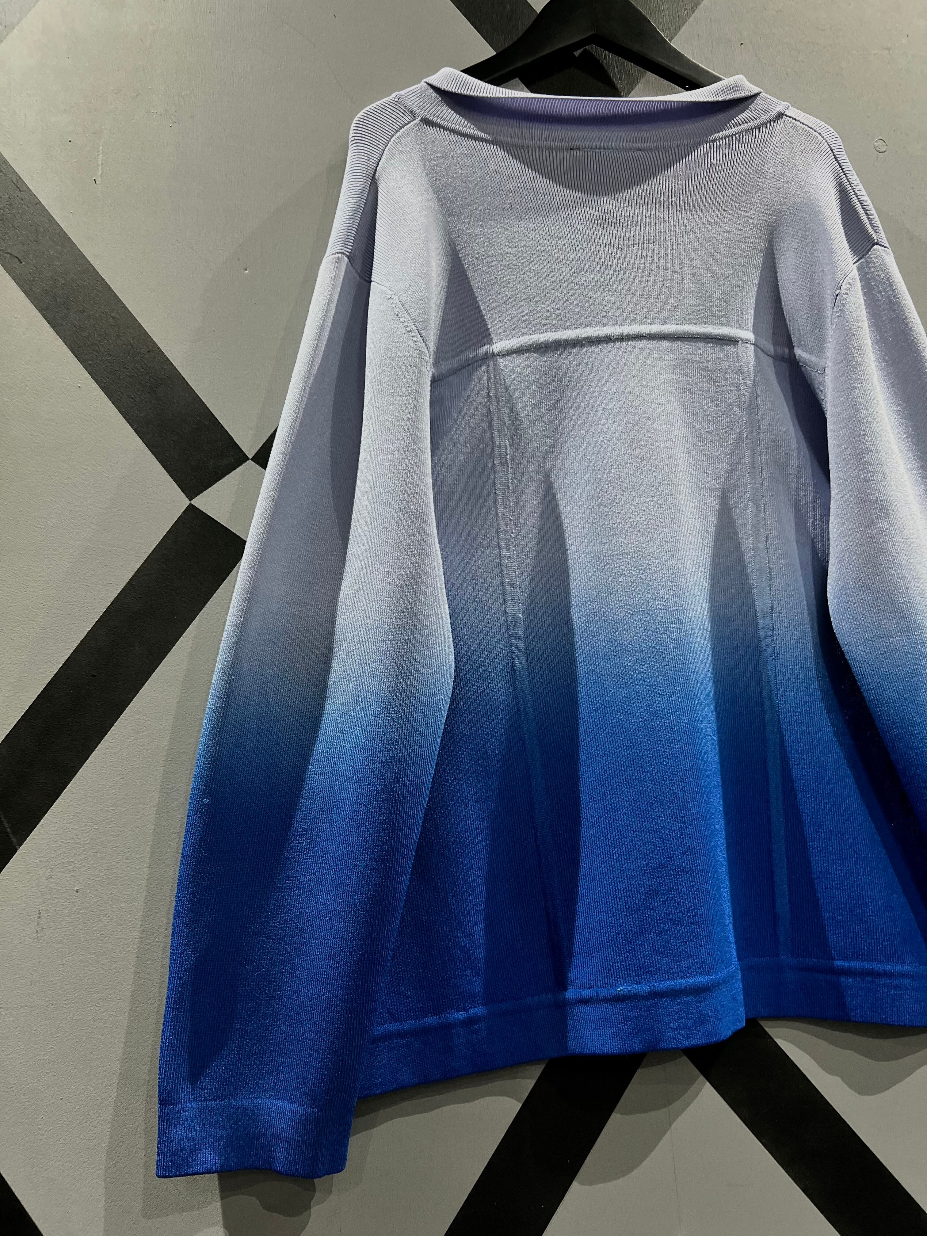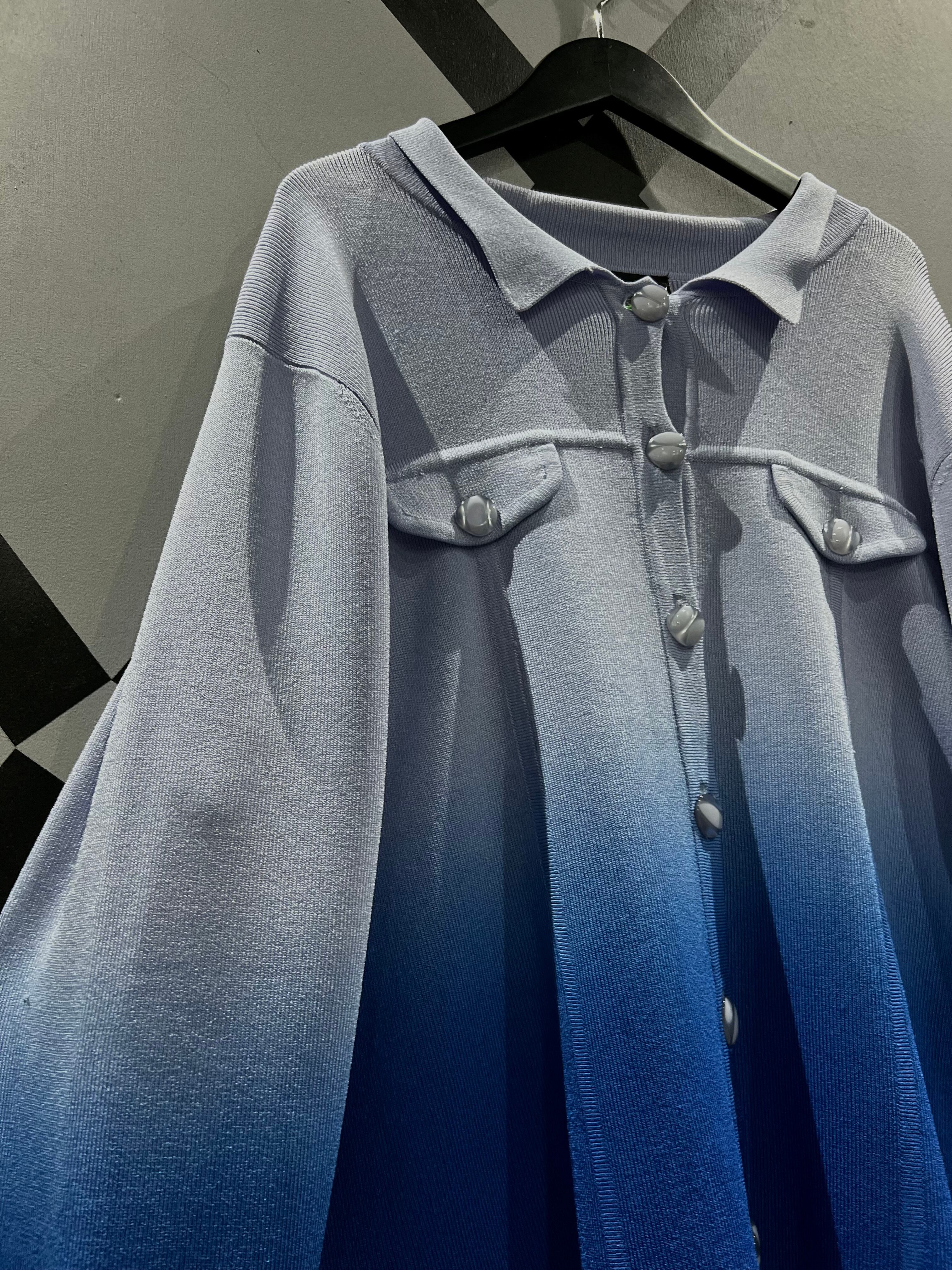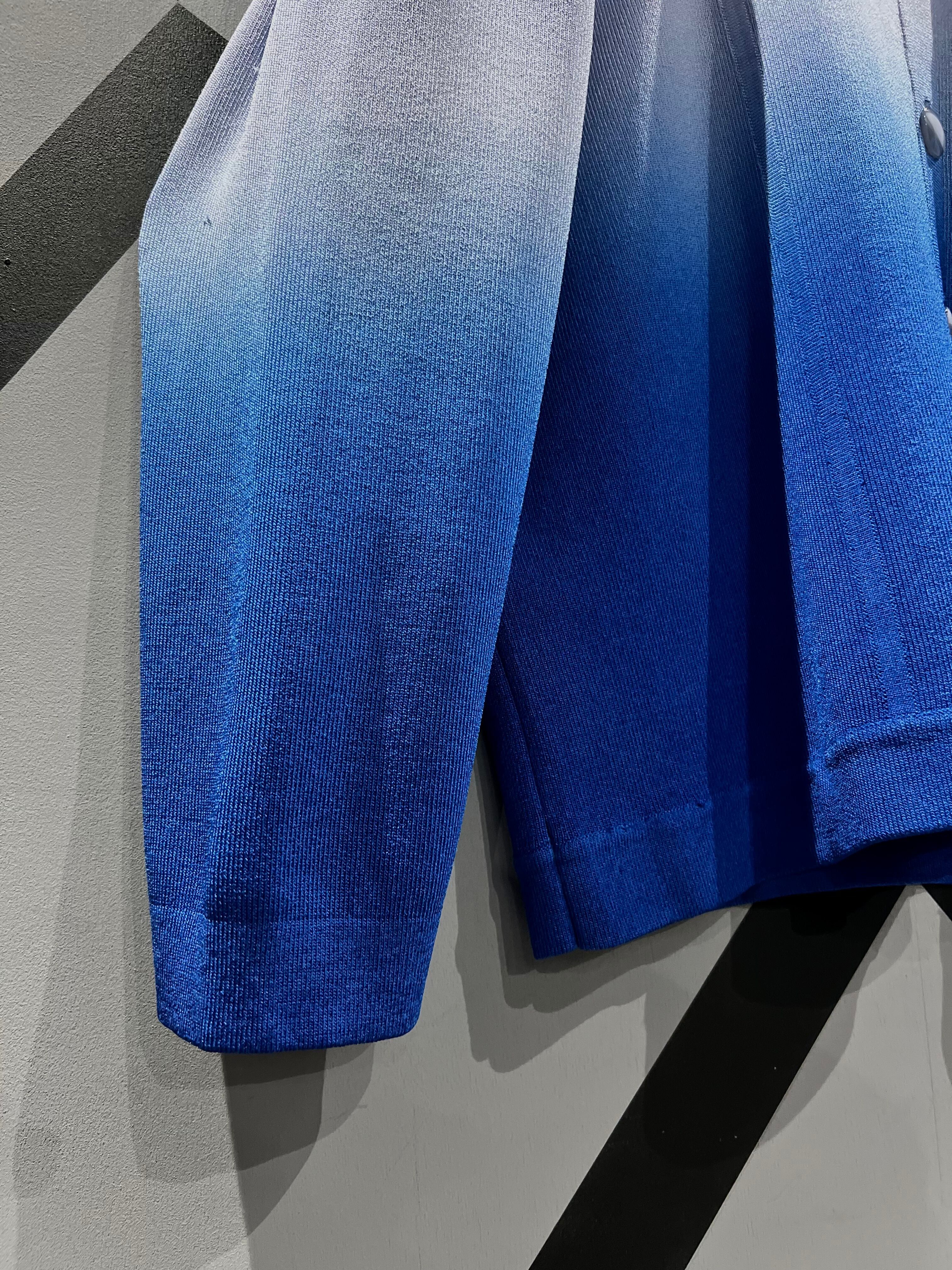 肌触りの滑らかなニットを用いて、水色から鮮やかな青色へと色が移りゆく、美しいグラデーションを載せたニットシャツジャケット。