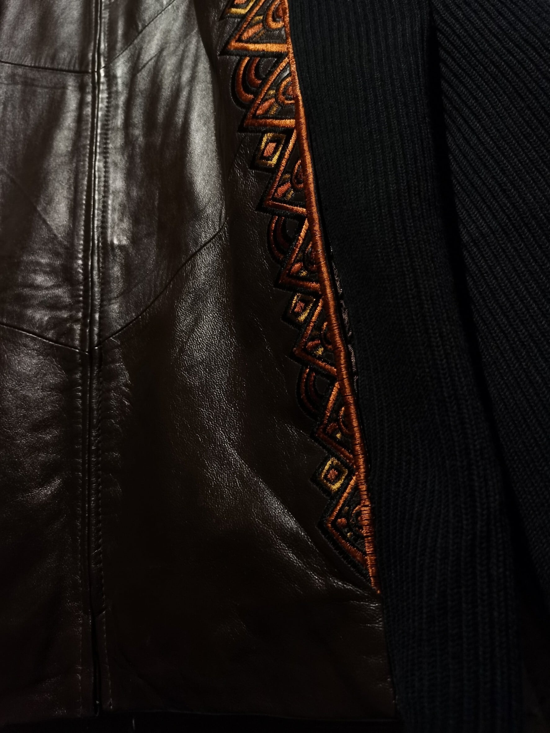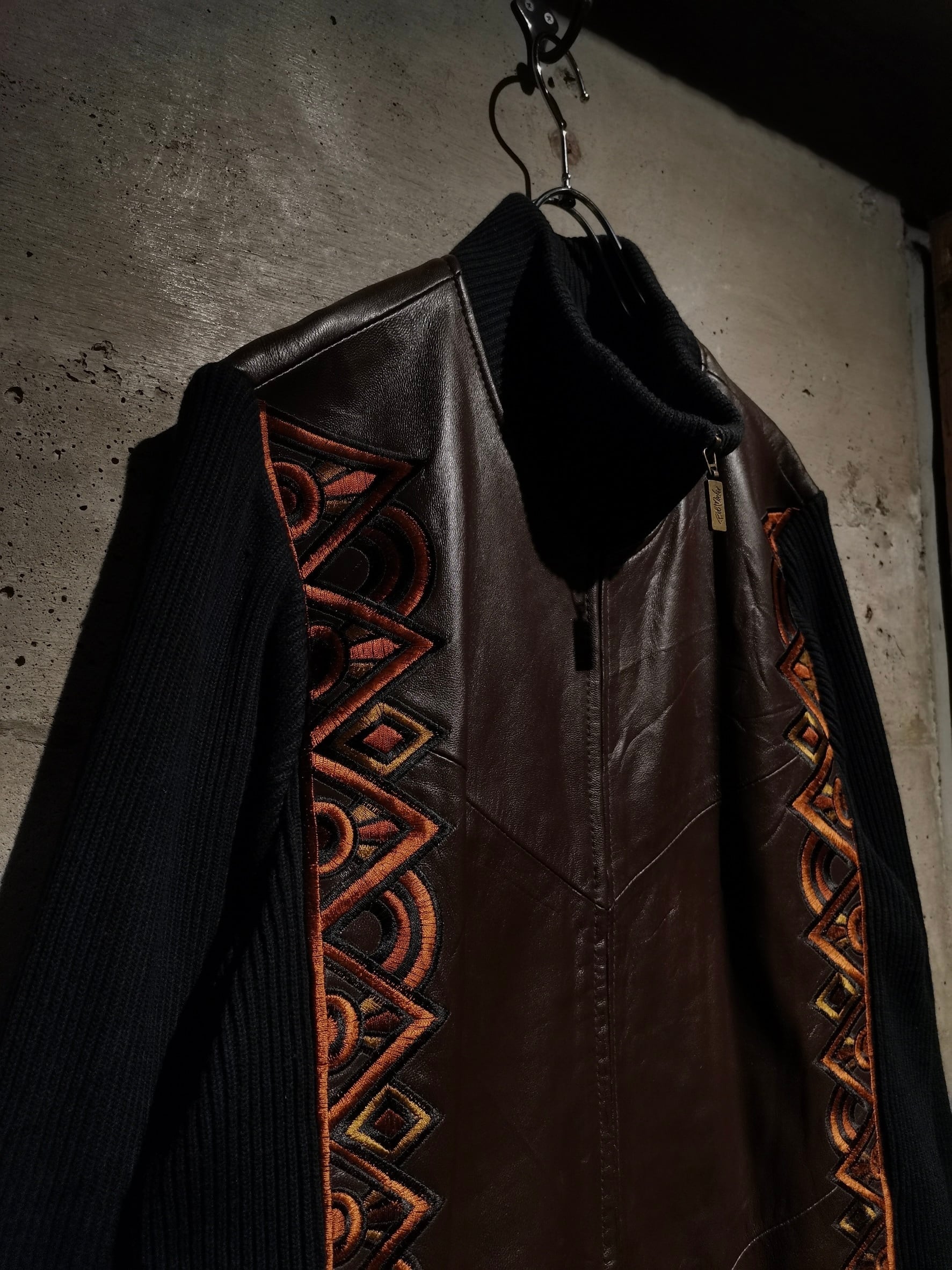 伸縮性のあるブルーのリブニットをベースに、ハリ、艶のあるブラウンレザーをパネル状にを切り替え。その上からこのブランドならではの繊細かつアーティスティックなフレーバーを漂わせる刺繍を刻み込んだドライバーズ型ニットジャケット。