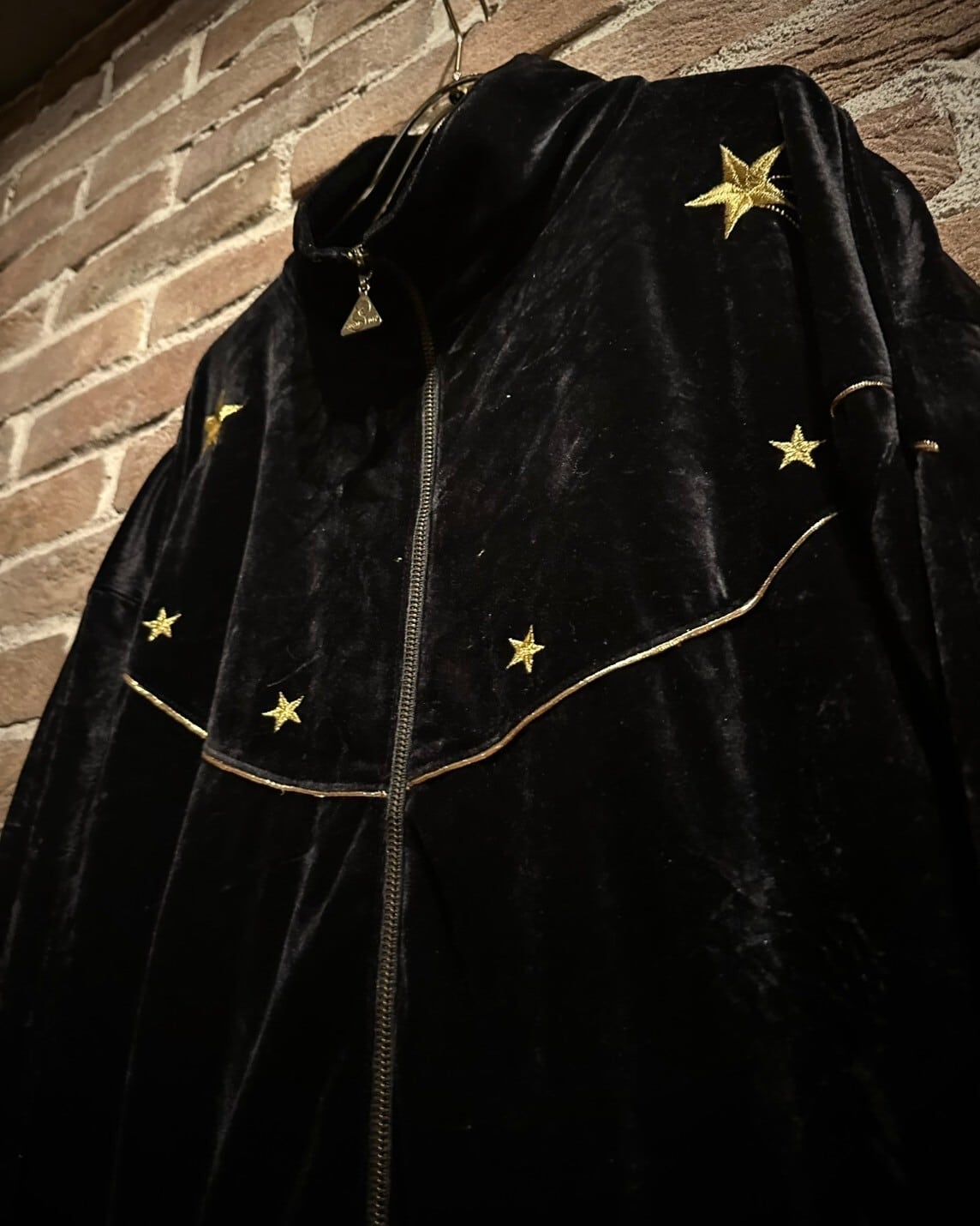 鈍い光沢を帯びた上質なブラックベロアをベースに、フロントに金糸で星の刺繍を刻んだトラックジャケット。