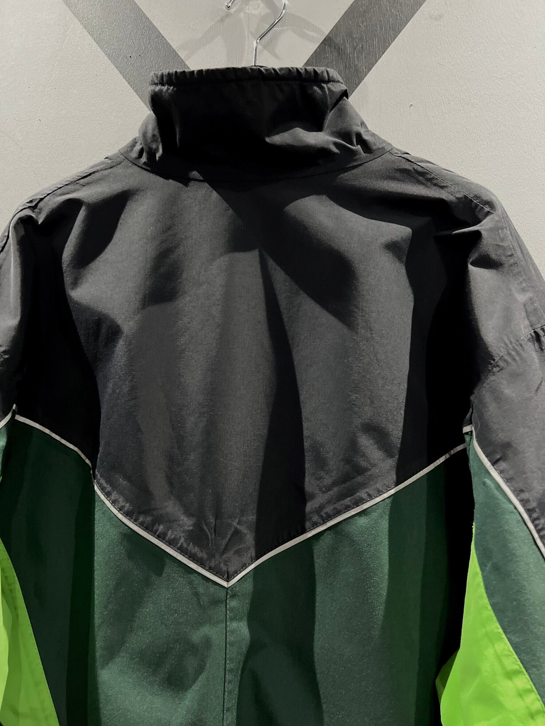 ハリのあるブラックベースのボディに、グリーン、ネオングリーンをエッジの効いた色の切り替え、右アーム、左胸にはブランドロゴの刺繍。