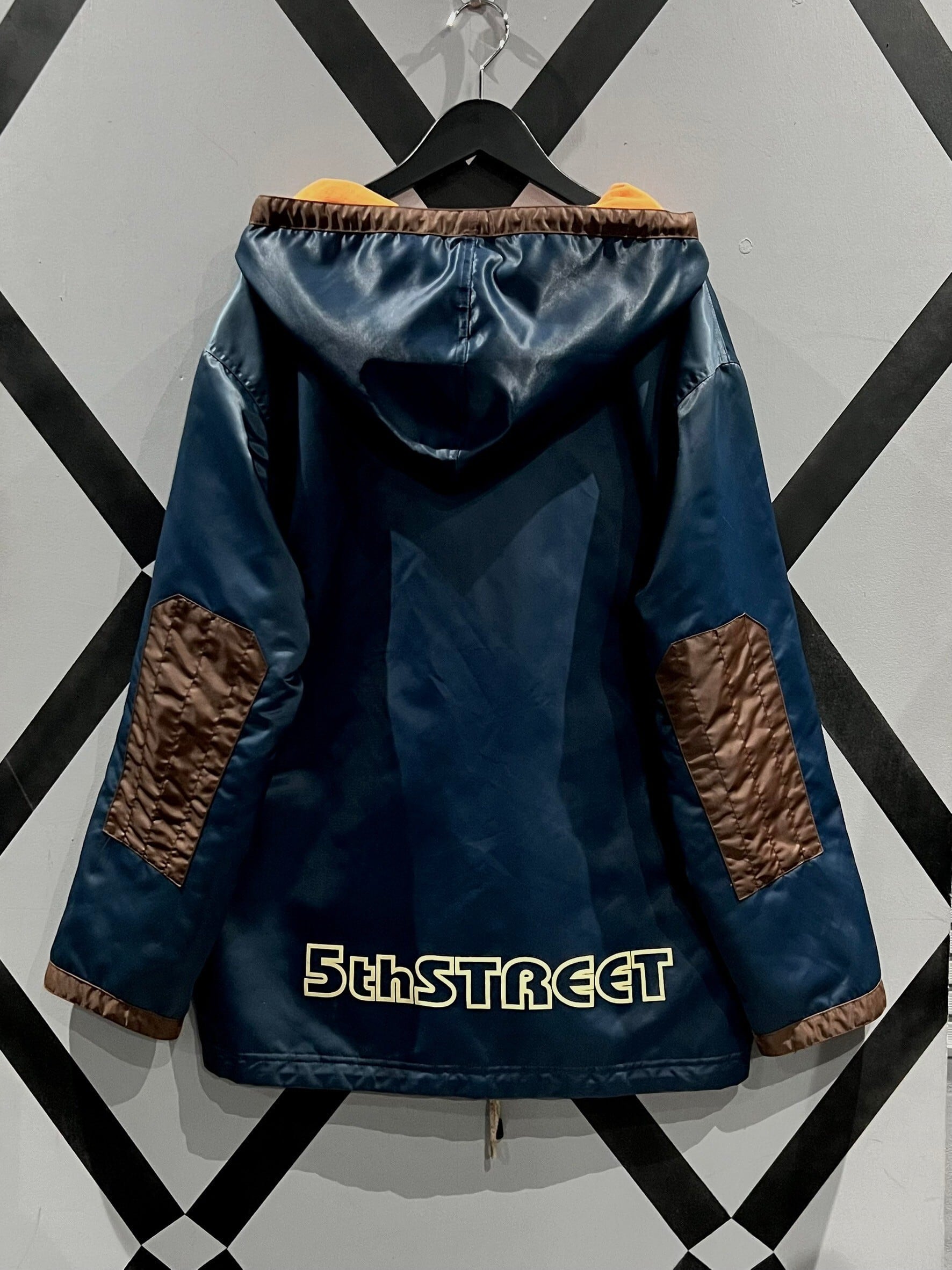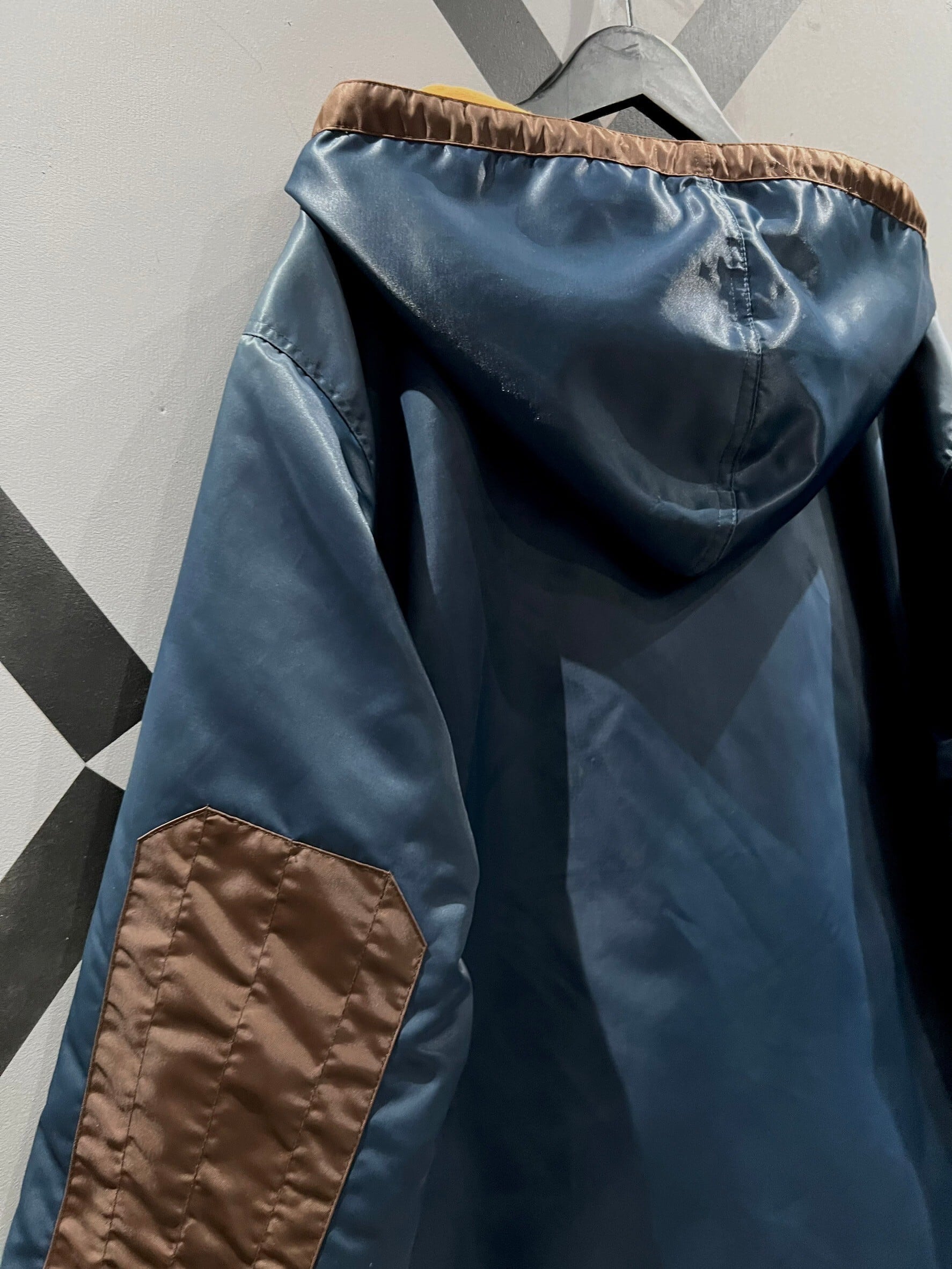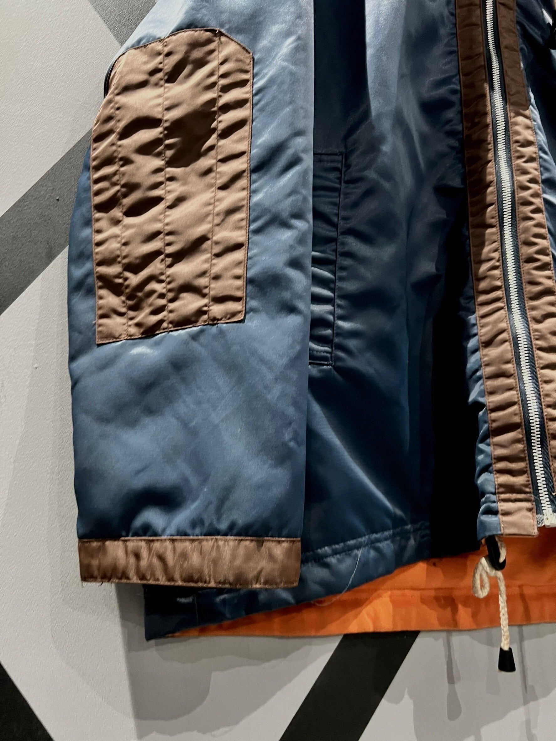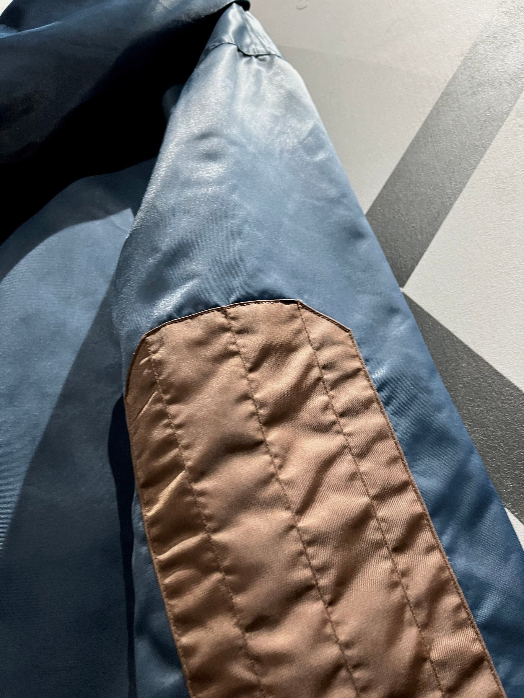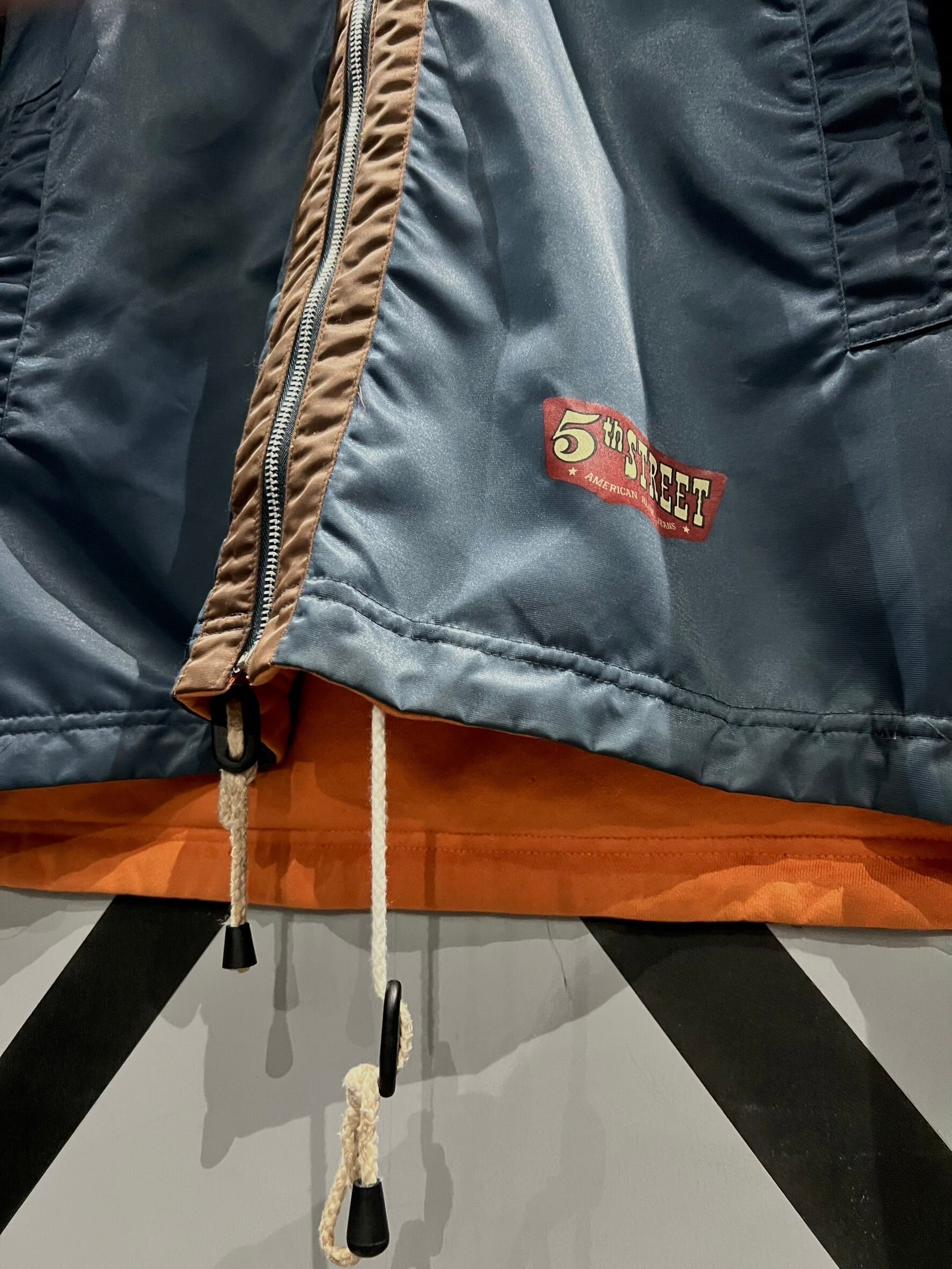 表面はネイビーのボディをベースに、前たてやエルボーパッチにブラウンを切り替えたナイロンのボディ、ガバッと裏返すと鮮やかなオレンジのスウェット面に早変わりする、稀有なリバーシブル仕様のジャケット。