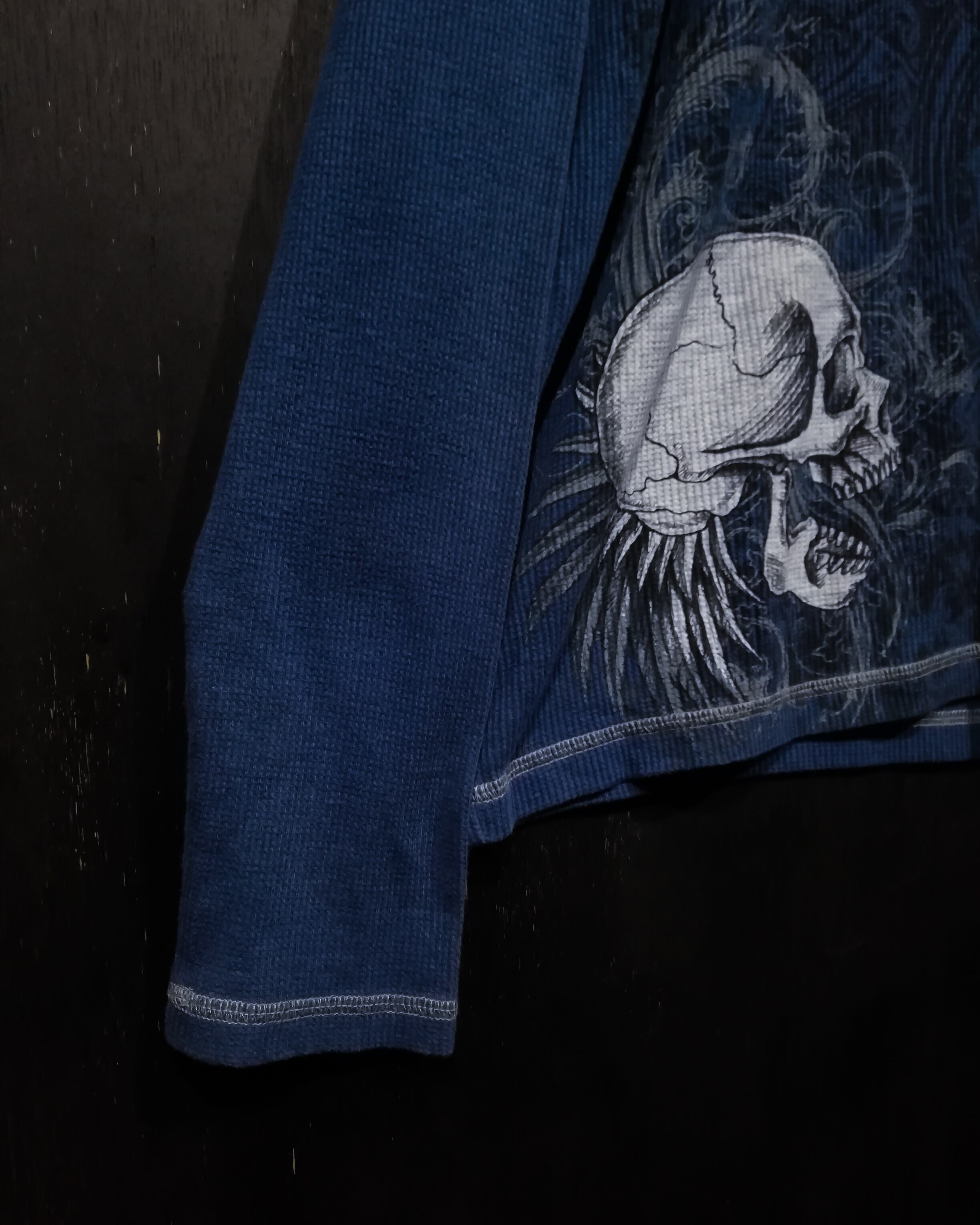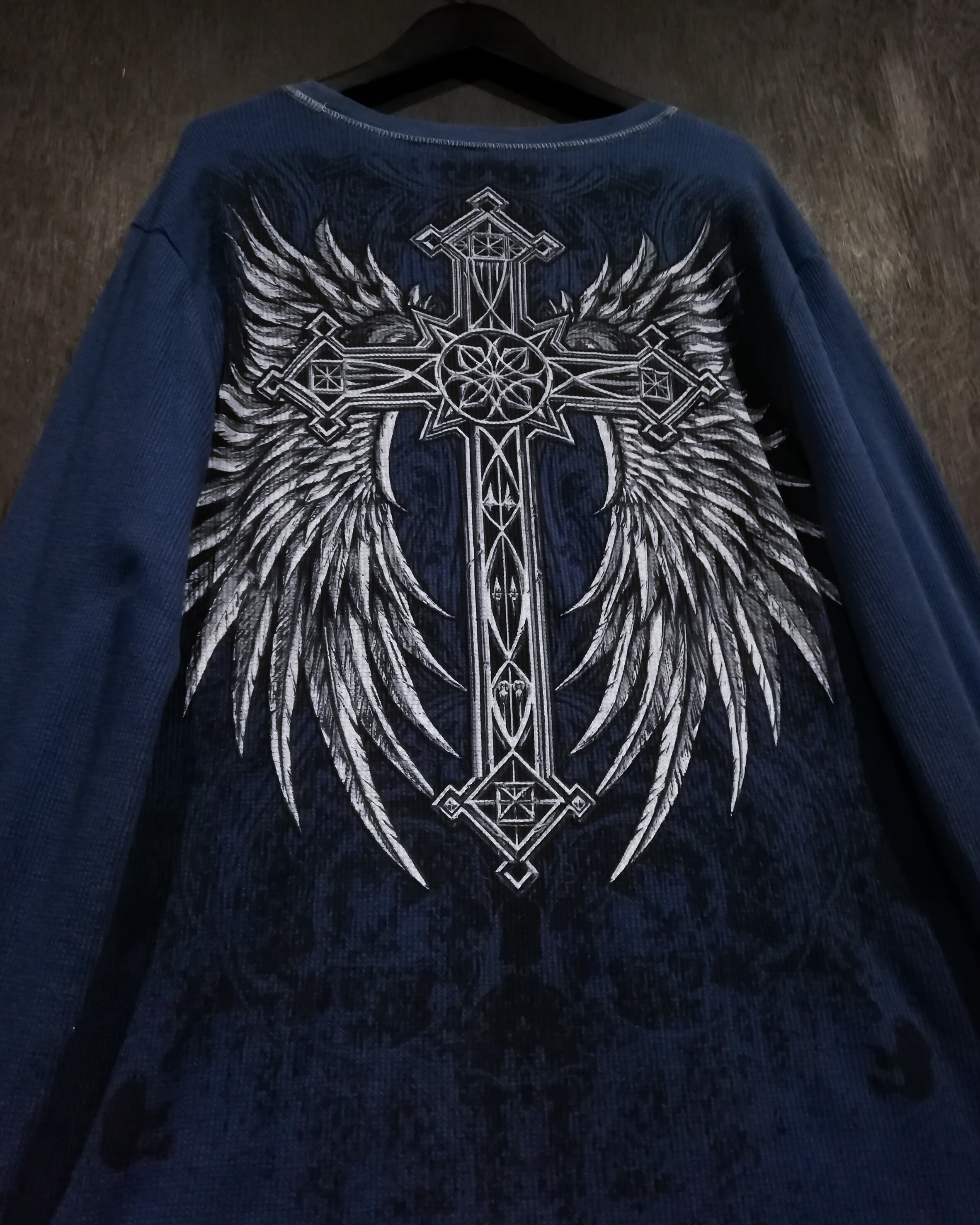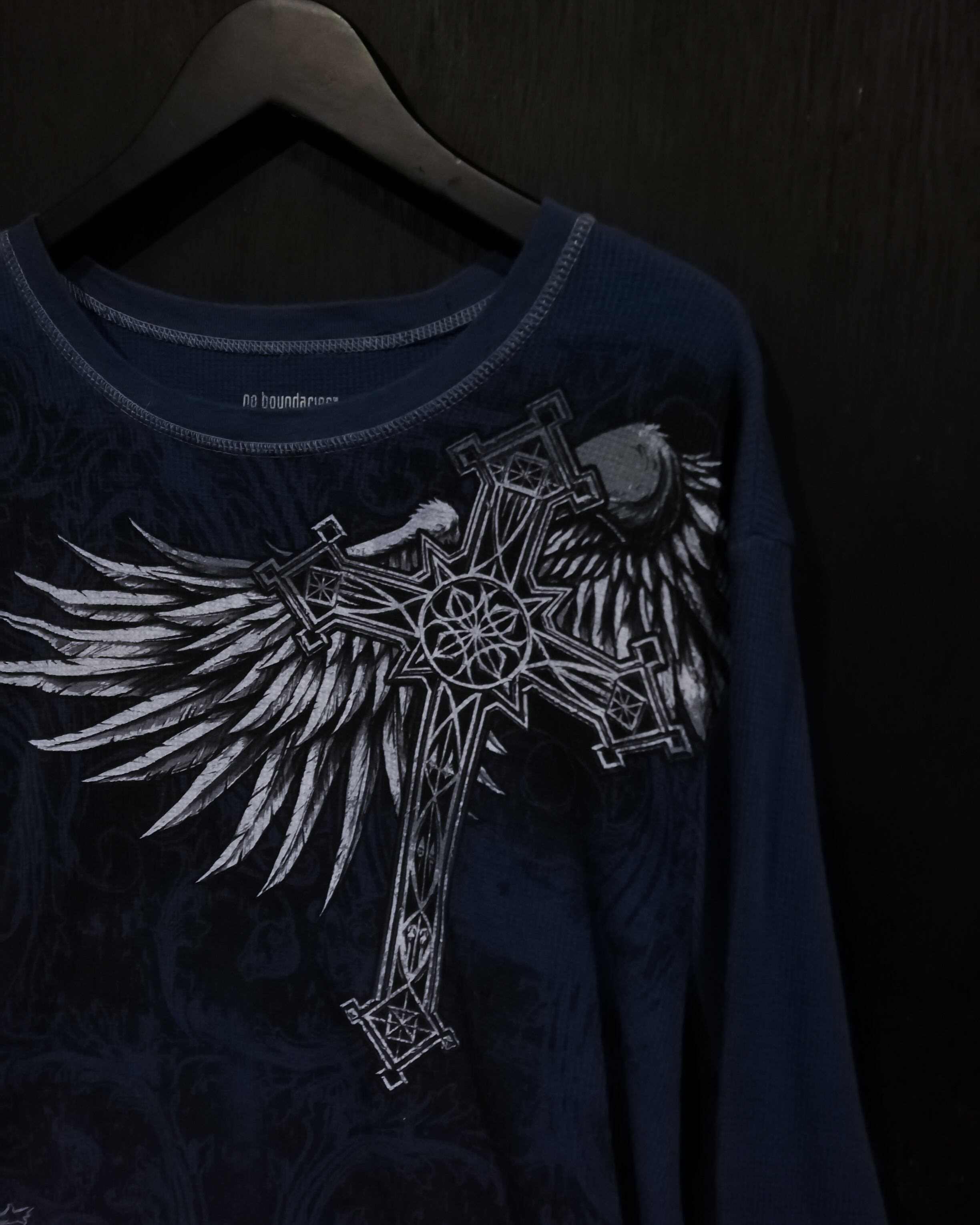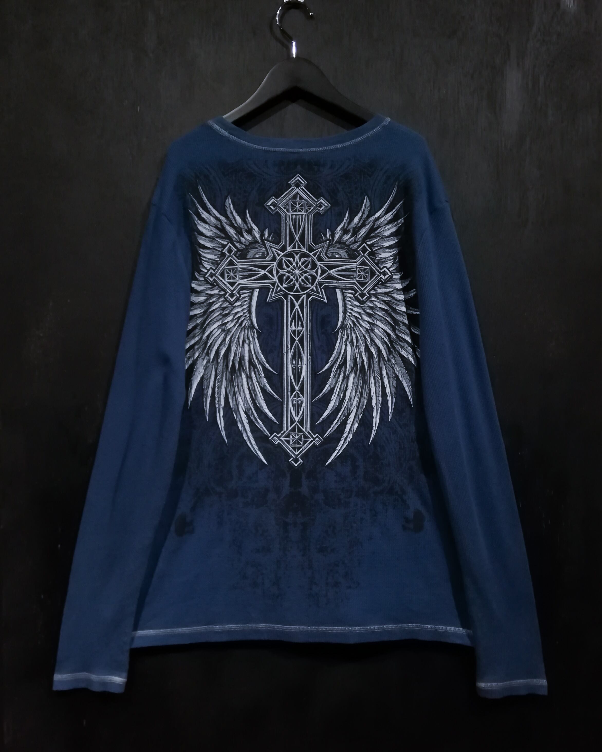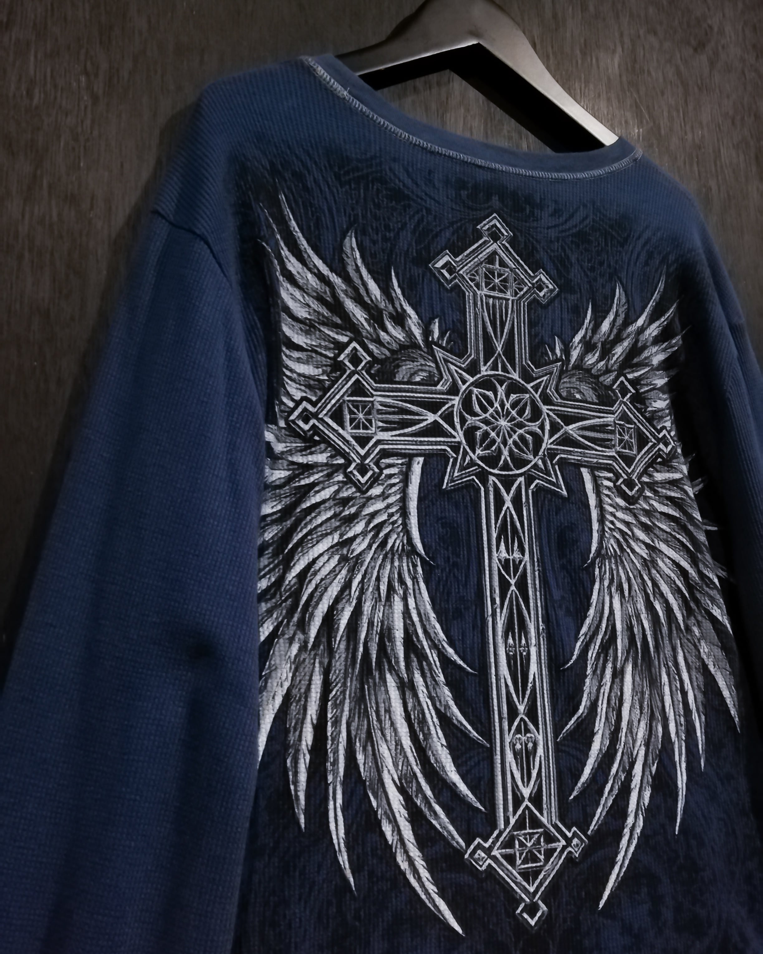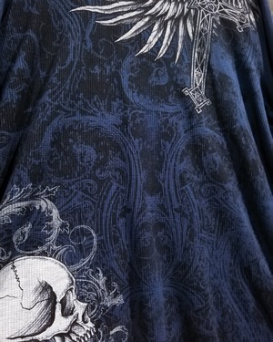 ブルーのサマール生地をボディに使用し、スカルや翼、クロスなど存在感を魅せるゴシックなプリントを前後に載せたロンT。