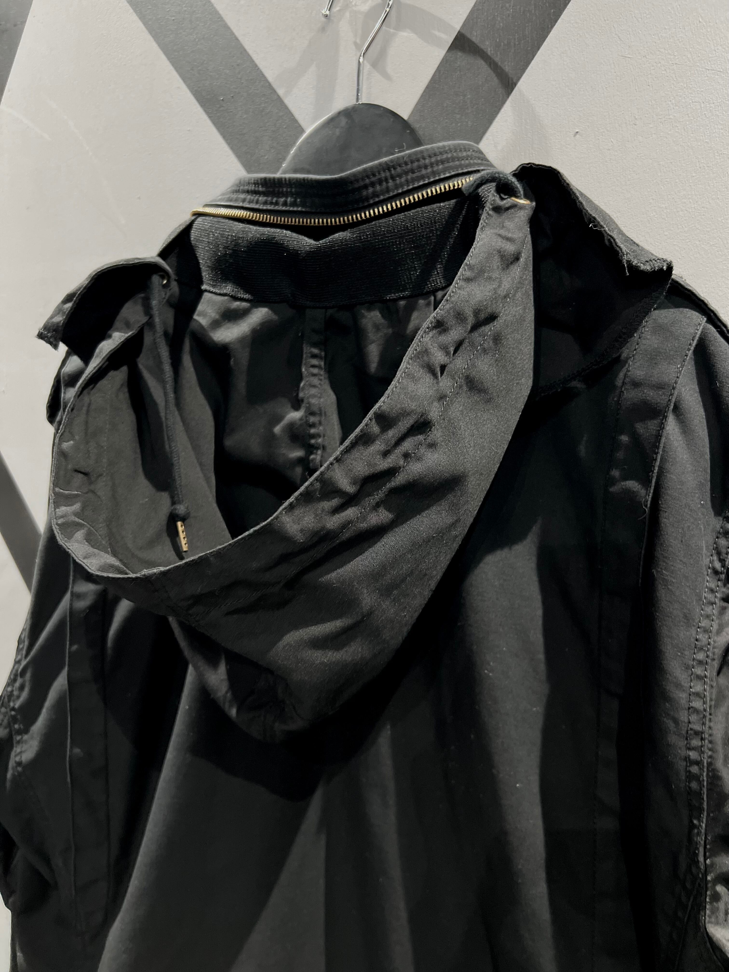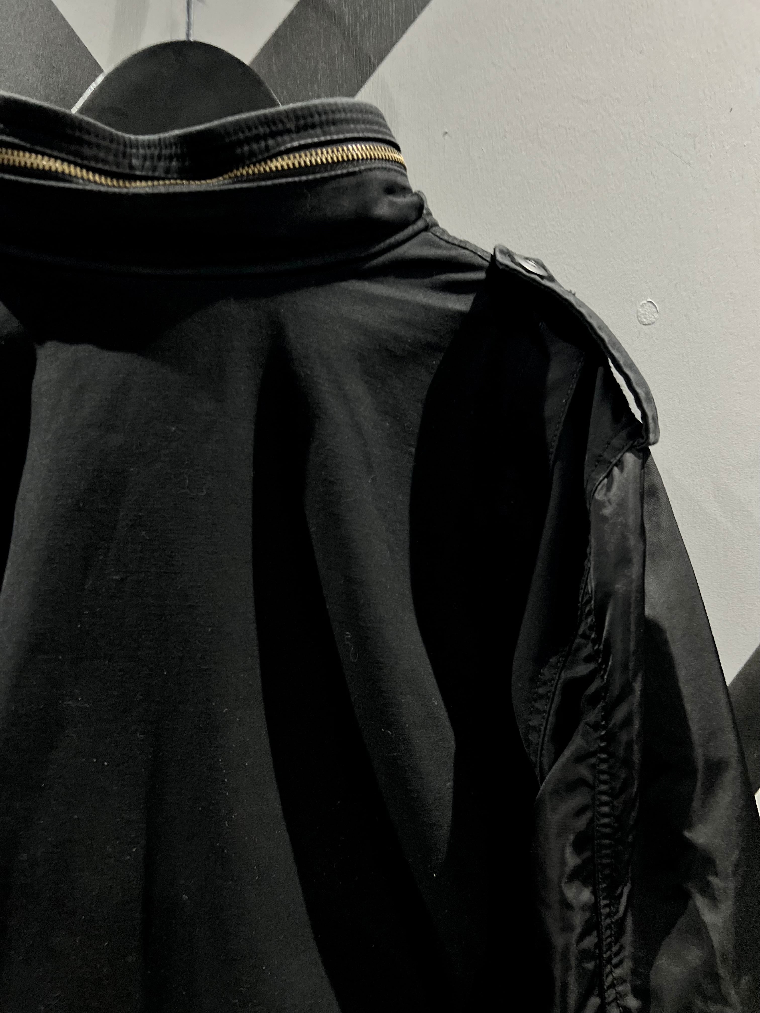 タフなブラックのボディに、アームにはツルッと滑らかな光沢のある異素材を切り替え、フライトジャケットをドッキングした様なデザインに仕上げた稀有な1着。