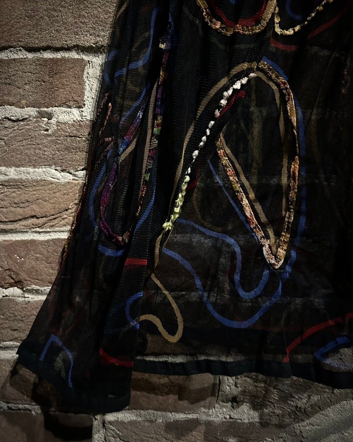 柄模様の周りにはベロアの様な起毛感のあるテープでさらに装飾を施し、立体感を演出。シアー特有の透け感、装飾が相まって雰囲気をムンムンに漂わせる仕上がりに。