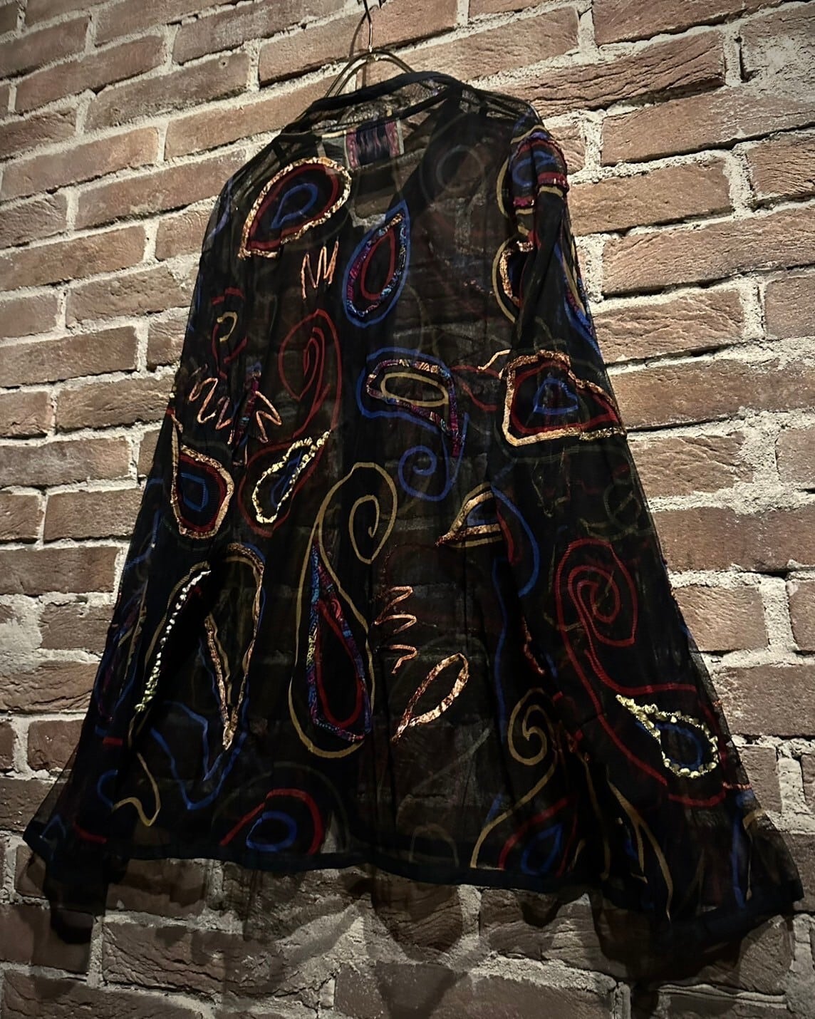 透け感の美しいブラックシアーに、アーティスティックなペイズリー調の柄を赤、青、黄色の多彩な色遣いで載せた長袖シャツ。