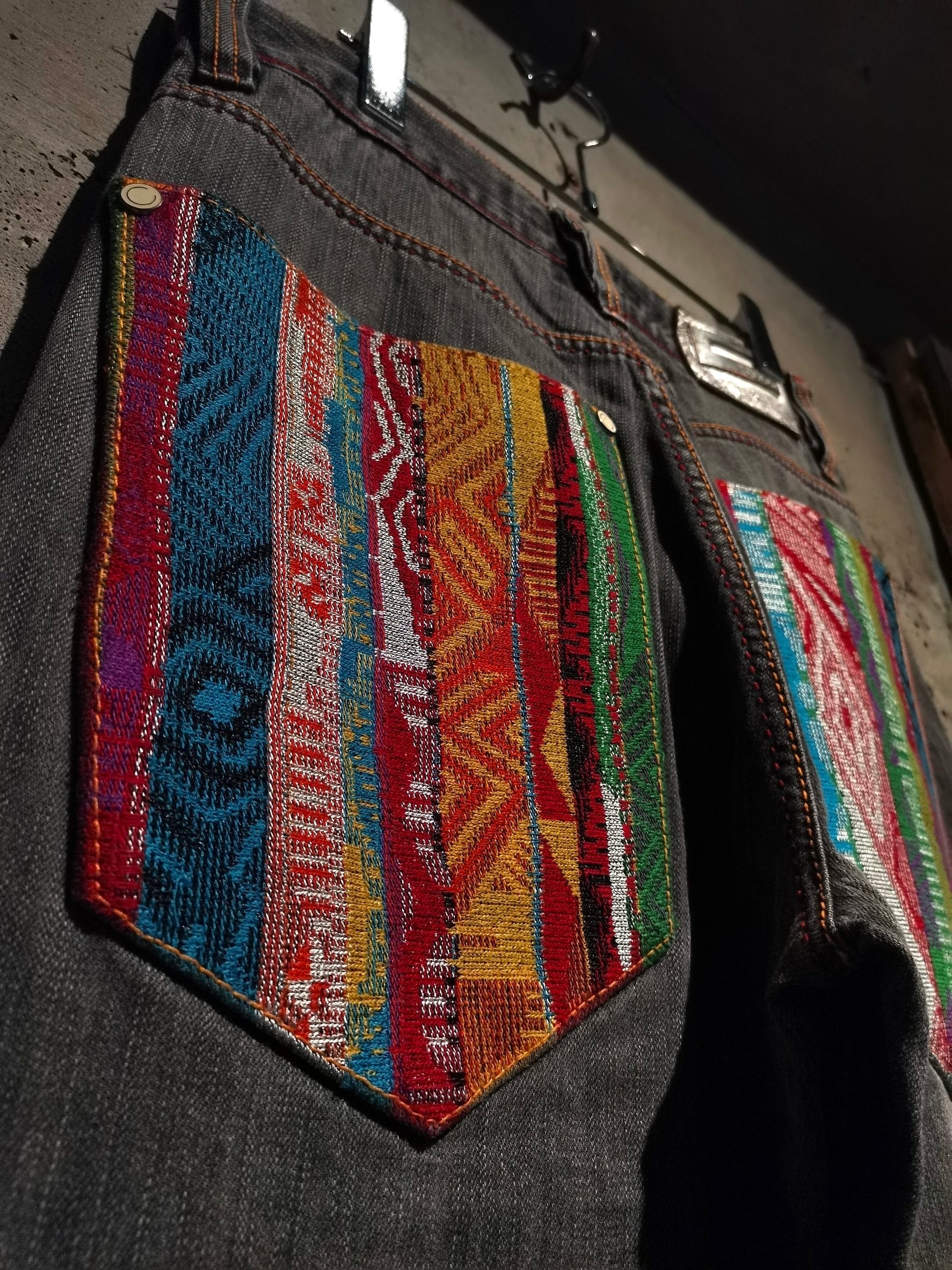 美しいフェードの効いたグレーのボディをベースに、多彩な色遣いの刺繍によって、同ブランドの代名詞である"3Dニット"を彷彿とさせるデザインを、バックポケットやコインポケットに刻んだ逸品。