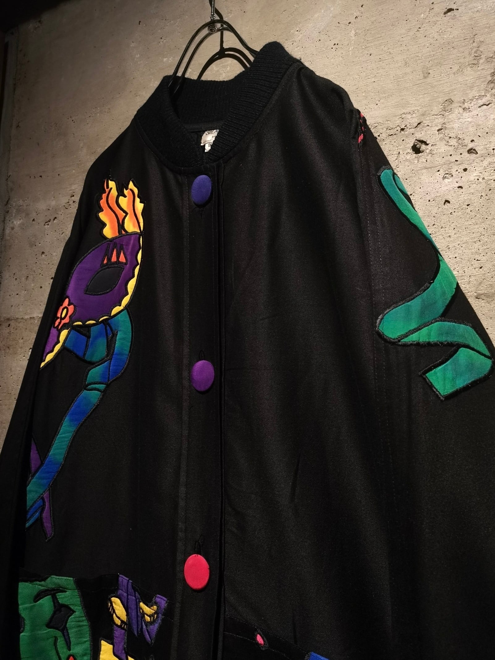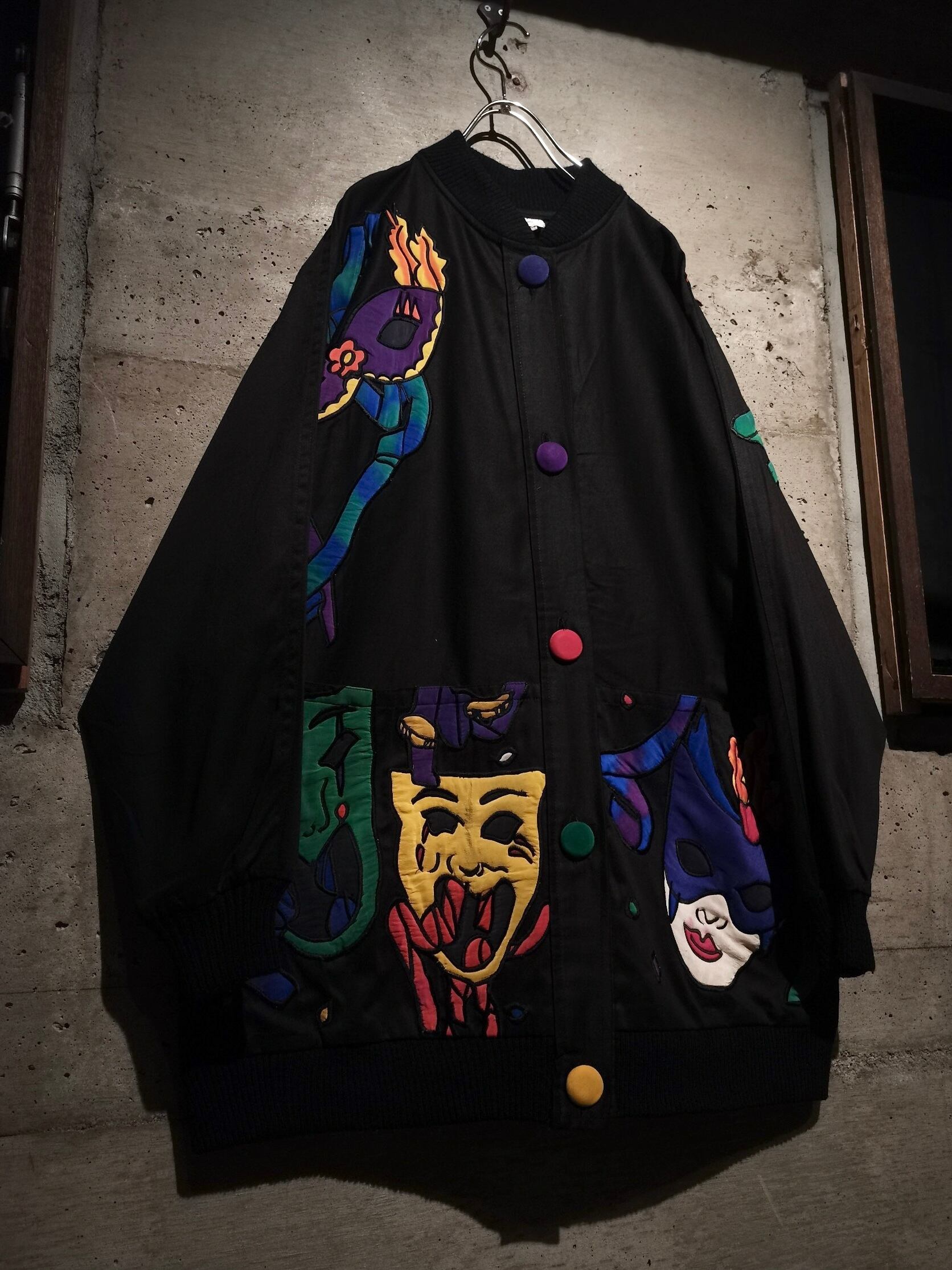 微光沢を帯びた黒のボディに、独特な雰囲気を醸し出す"仮面"のデザインを、多彩なカラーリングのパッチで表現したジャケット。