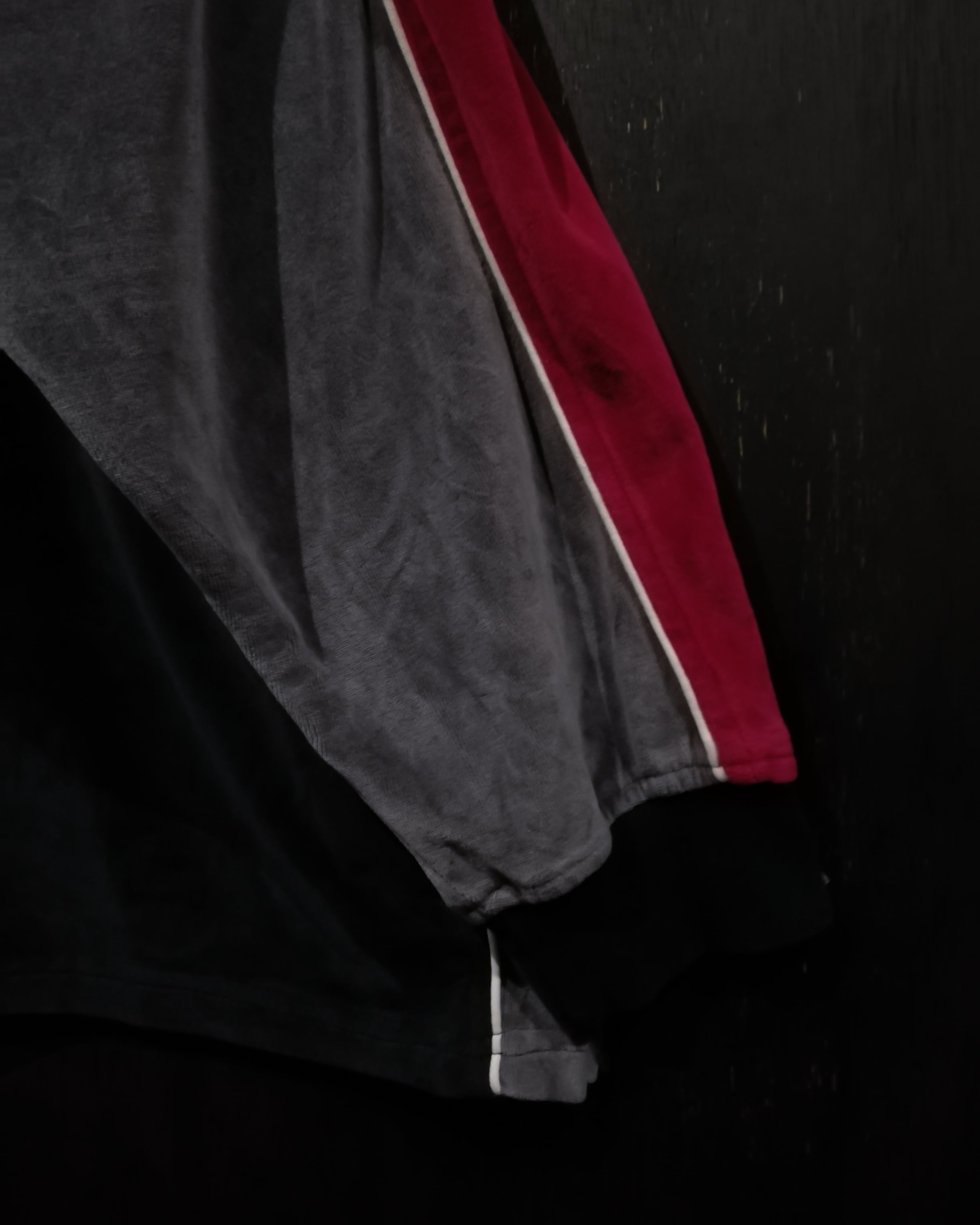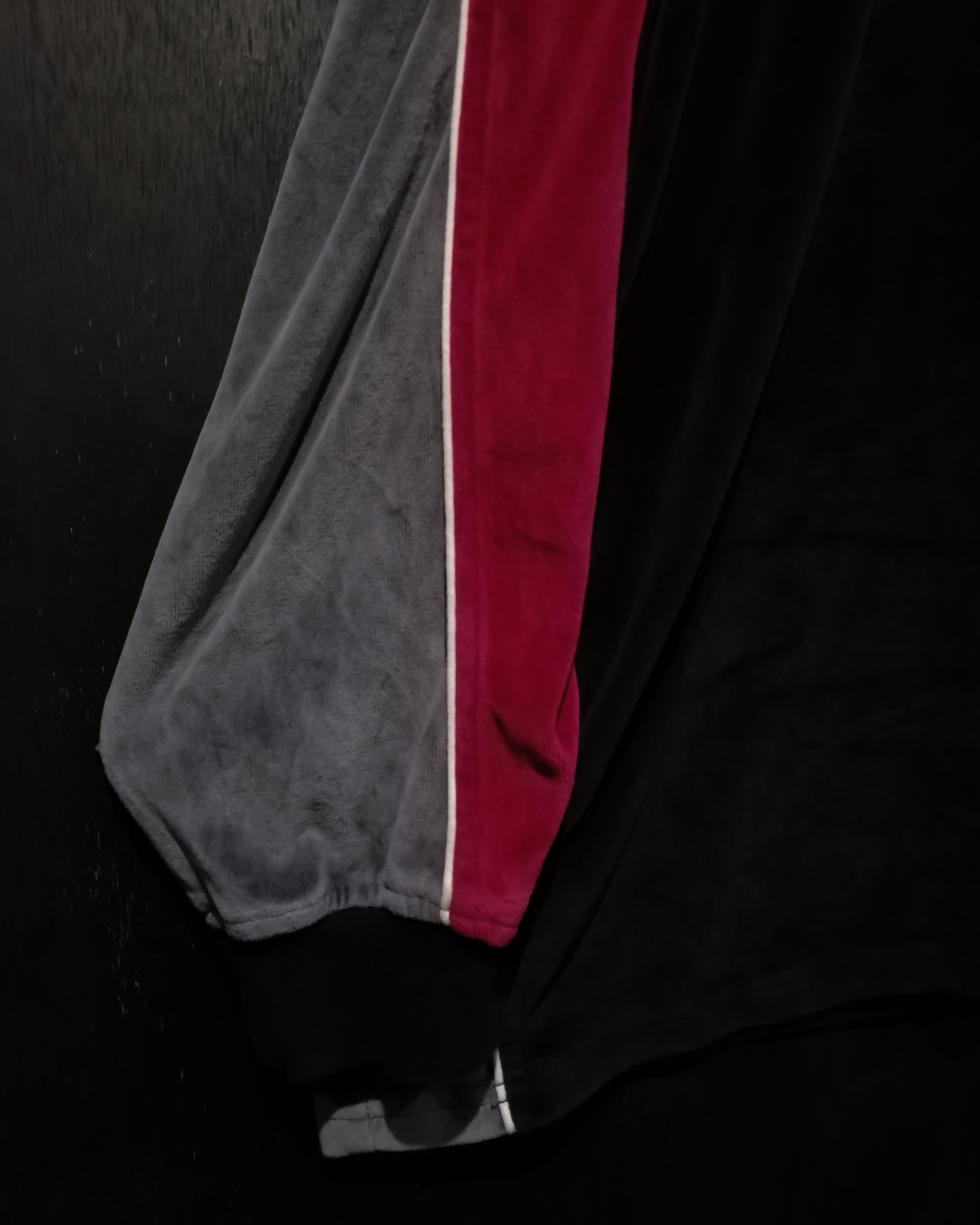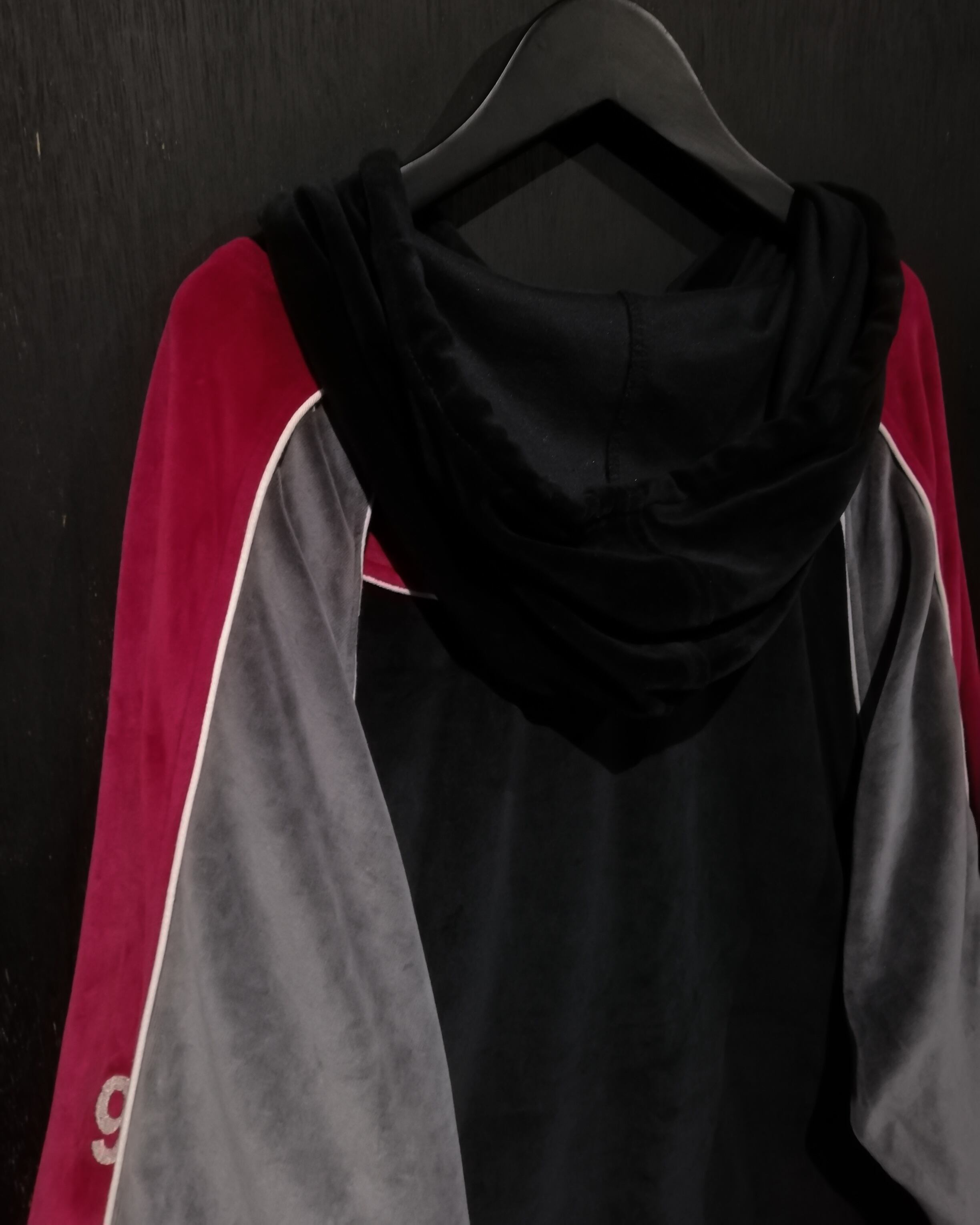 モチっとした柔らかで上質なベロアを用いて、黒をベースにグレー、赤の切り替えを施したプルオーバーフーディ。