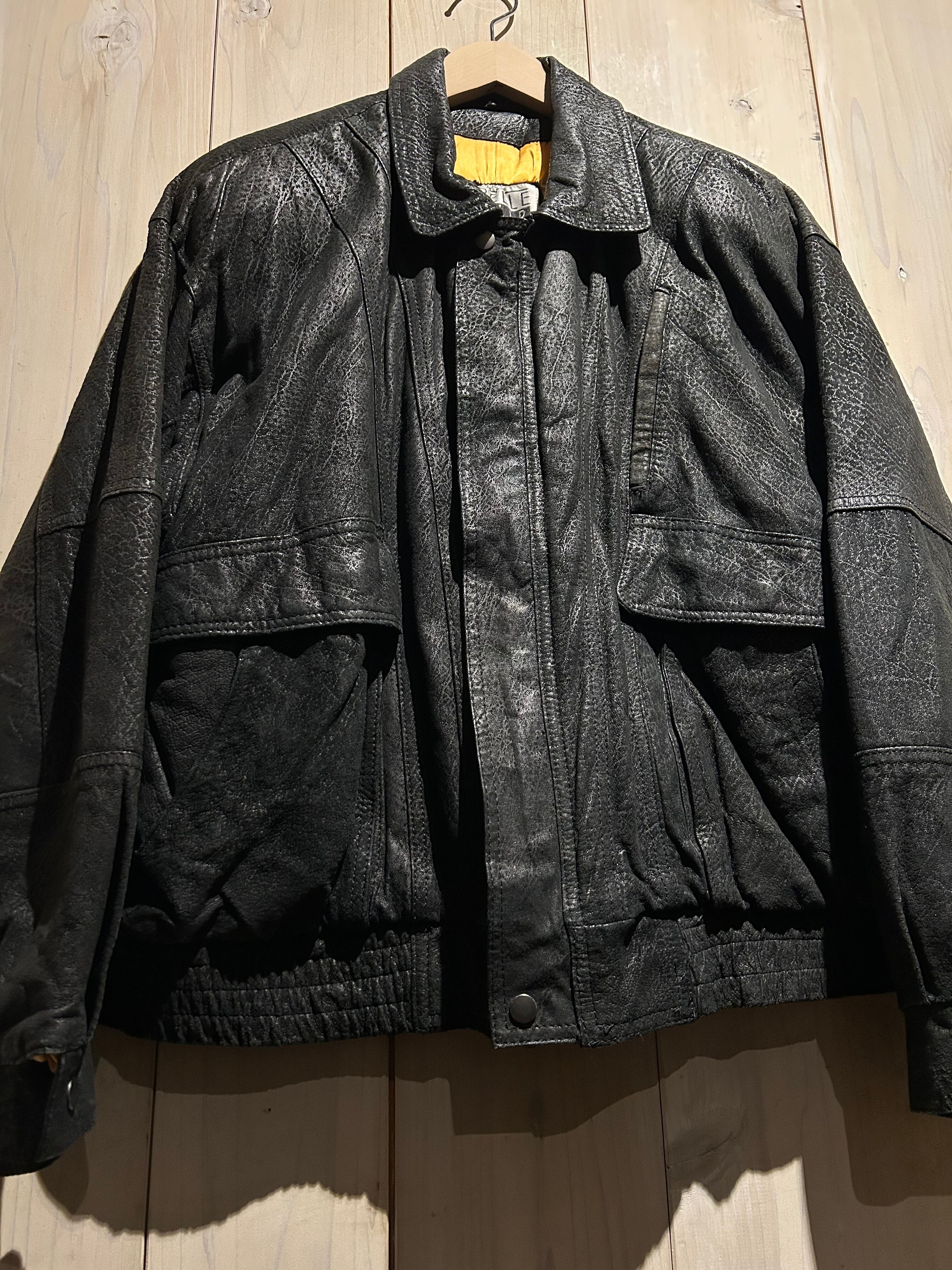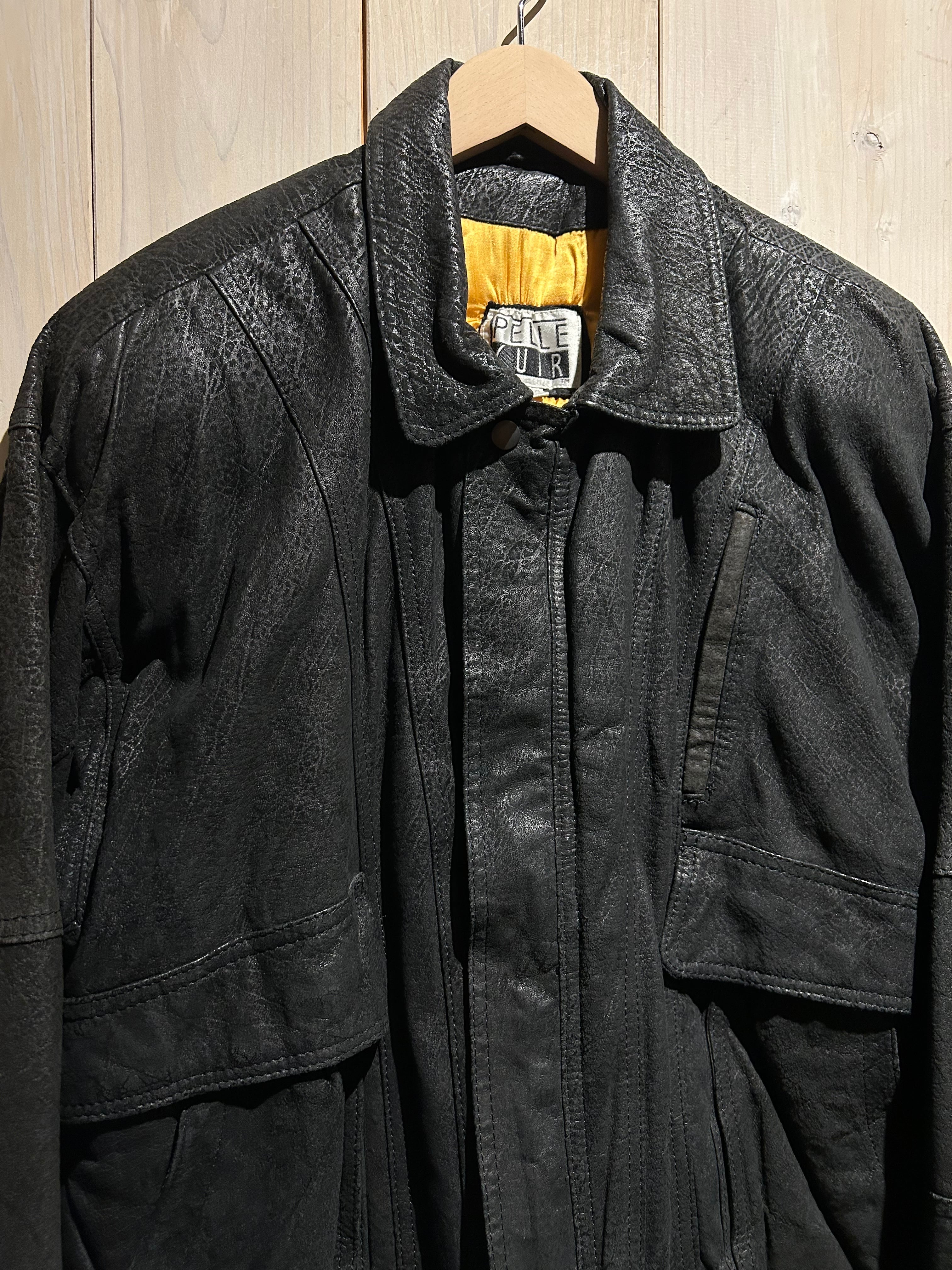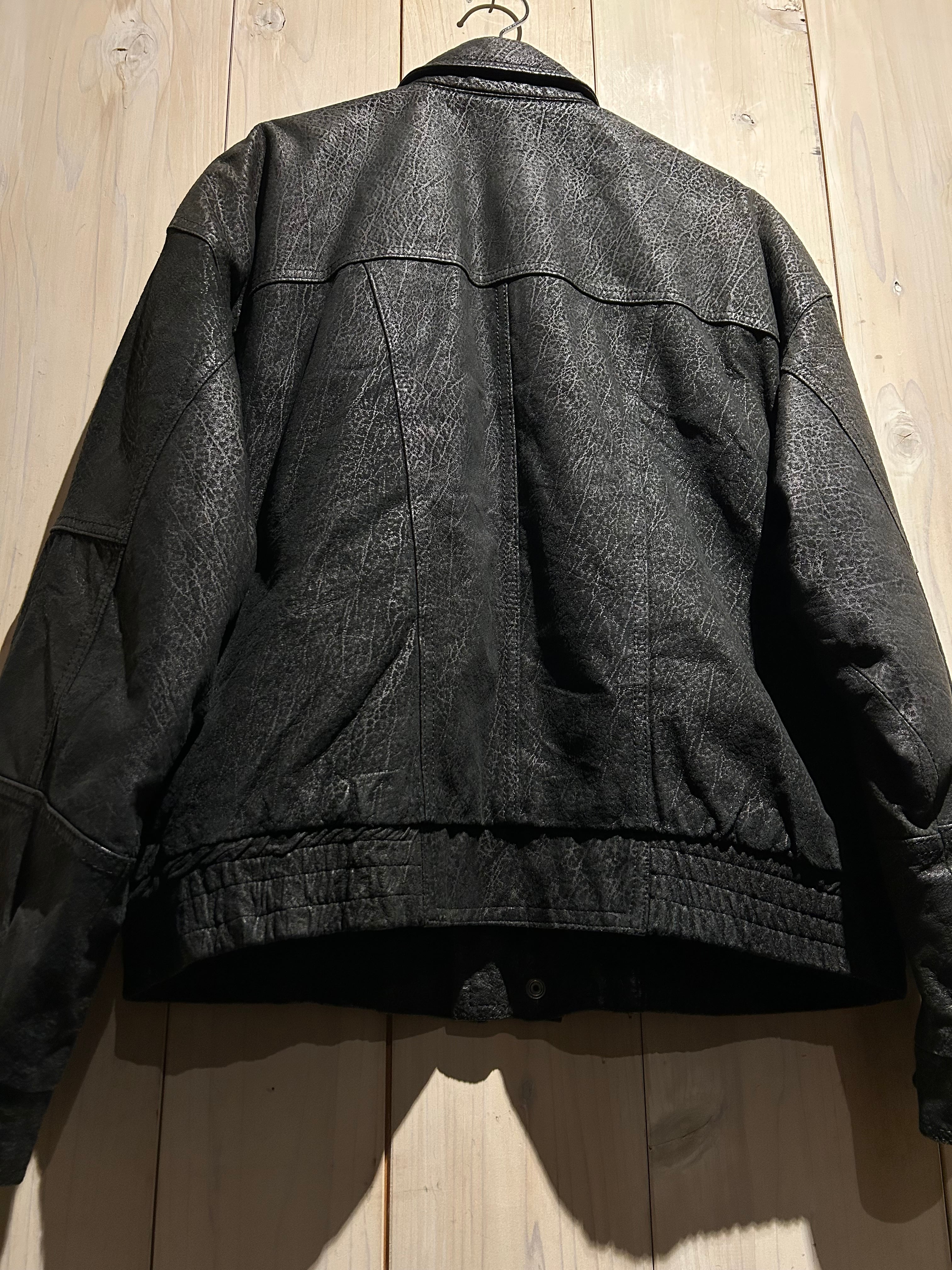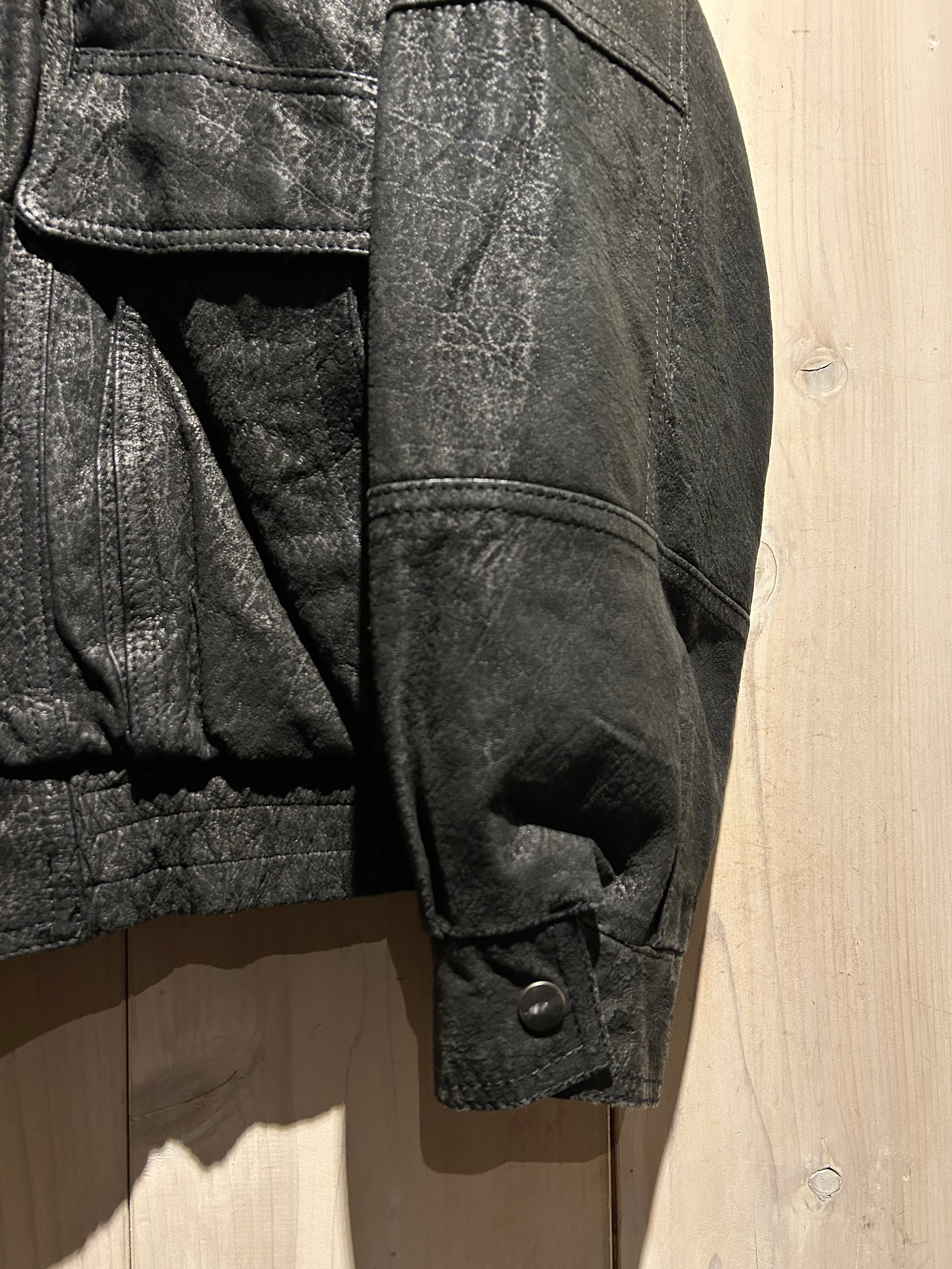 ハリのあるマットな質感の上質なブラックレザーをボディに使用し、全面にセメント柄(エレファント柄)を載せたスペシャルなレザージャケット。