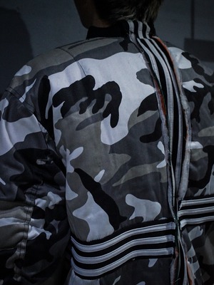 無彩色のカモフラージュ柄を載せたボディをベースに、3ラインをフロント、背面、アームにドッキングし、見事にデザインとして組み込んだ1着。