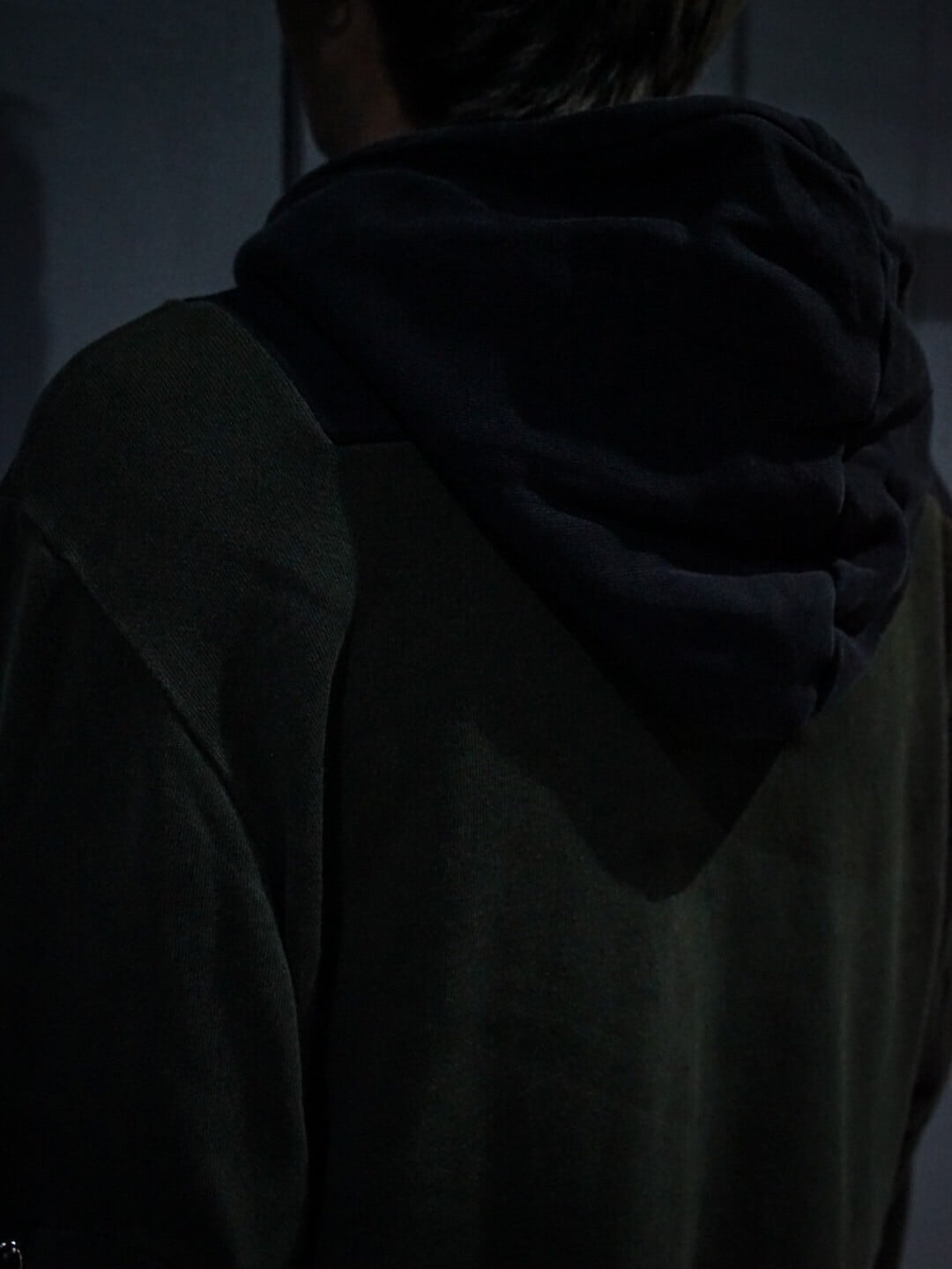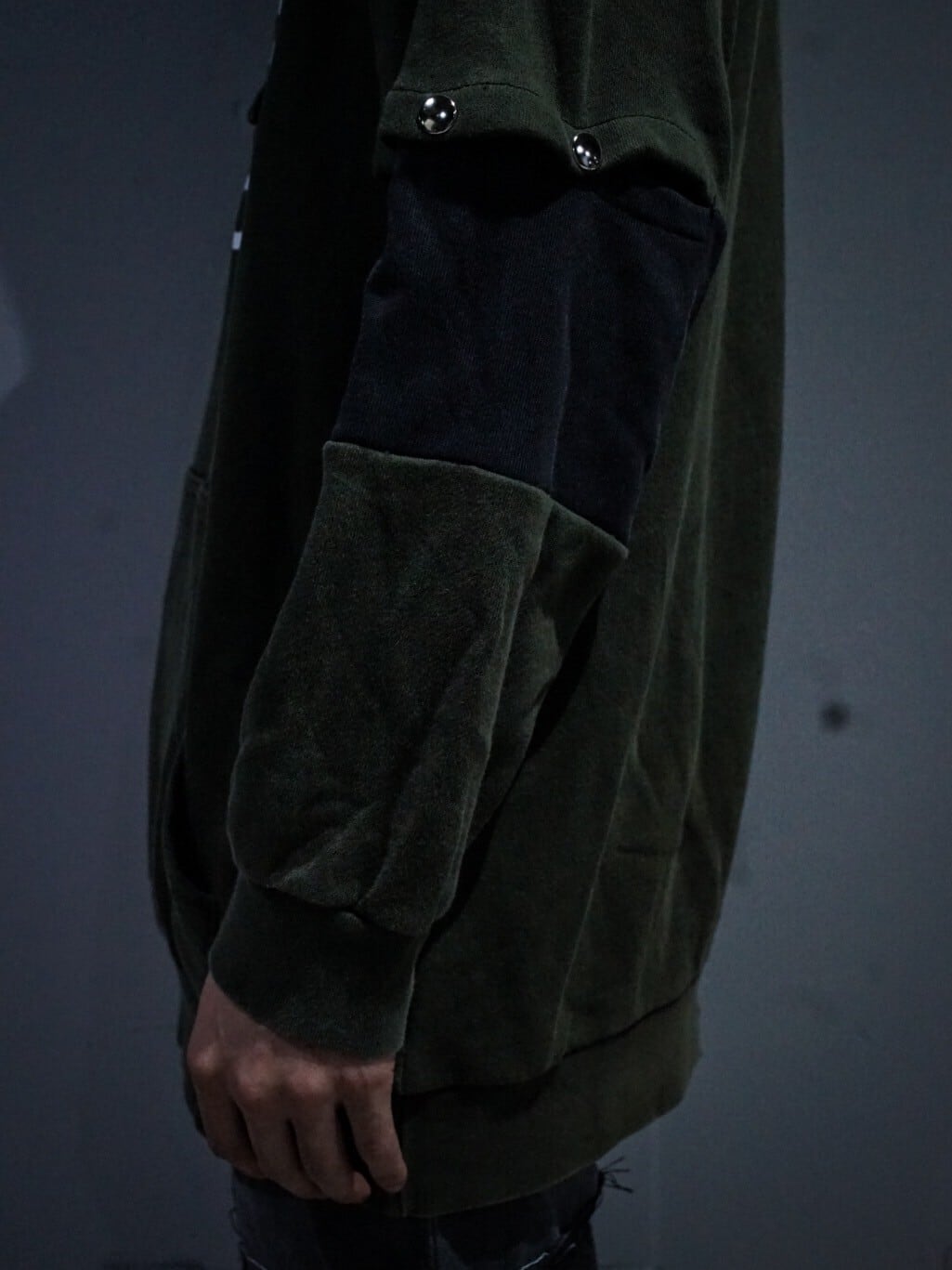 "adidas"の黒とカーキのフーディを解体、ドッキングし、贅沢に2着を用いて1着のフーディへと再構築した逸品。
