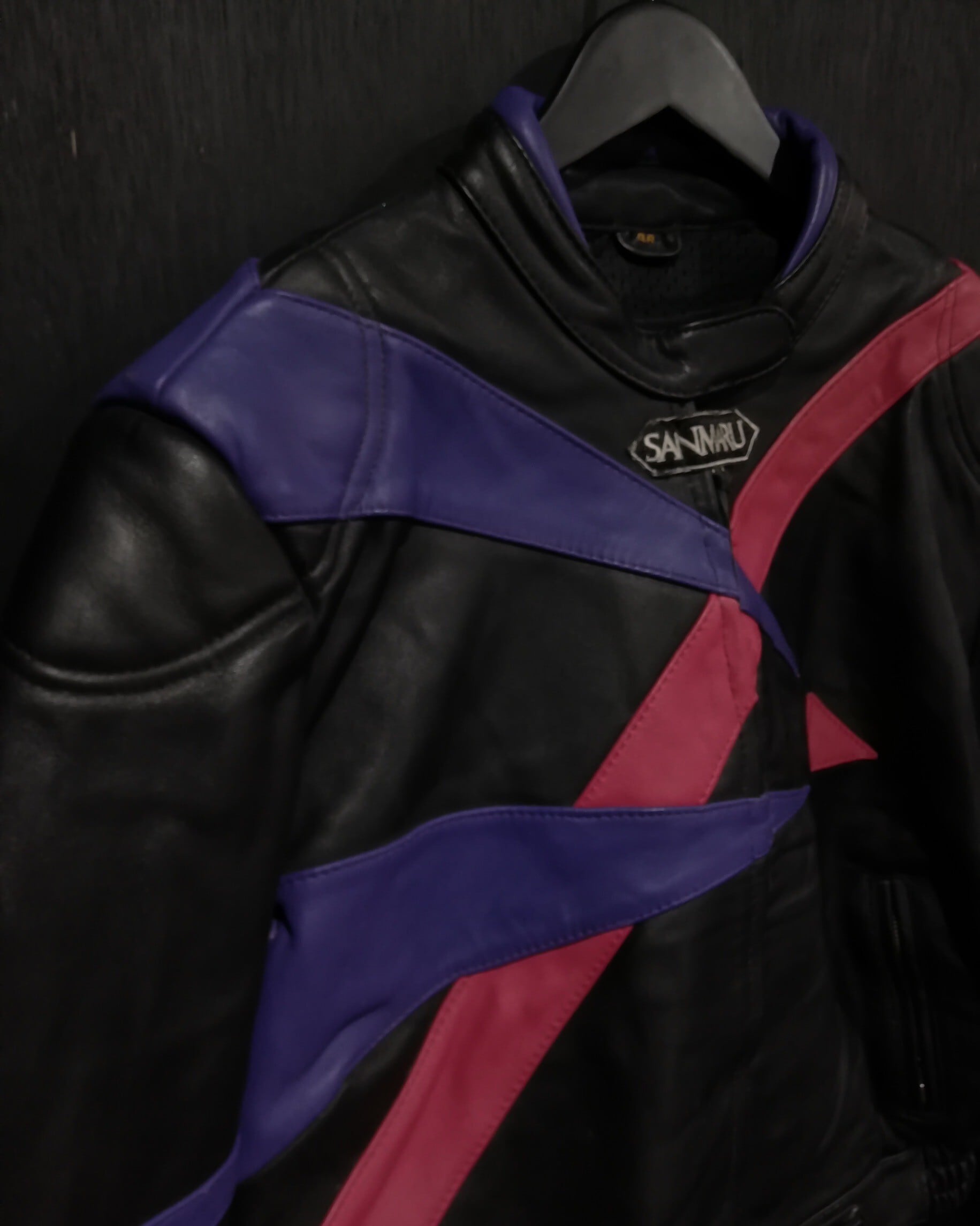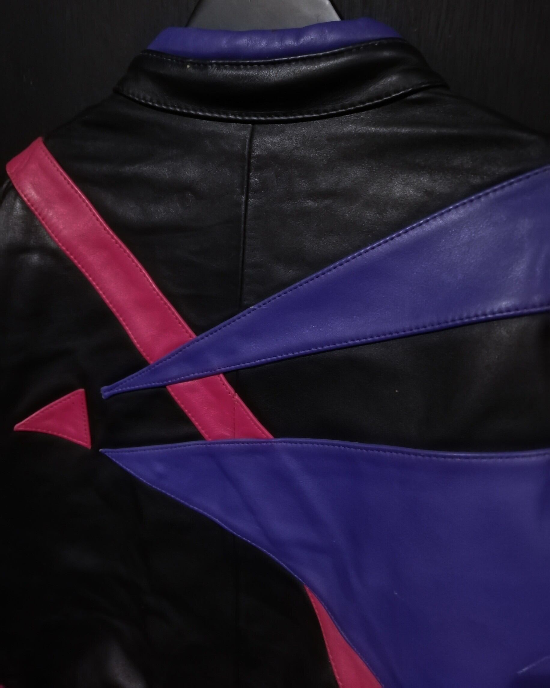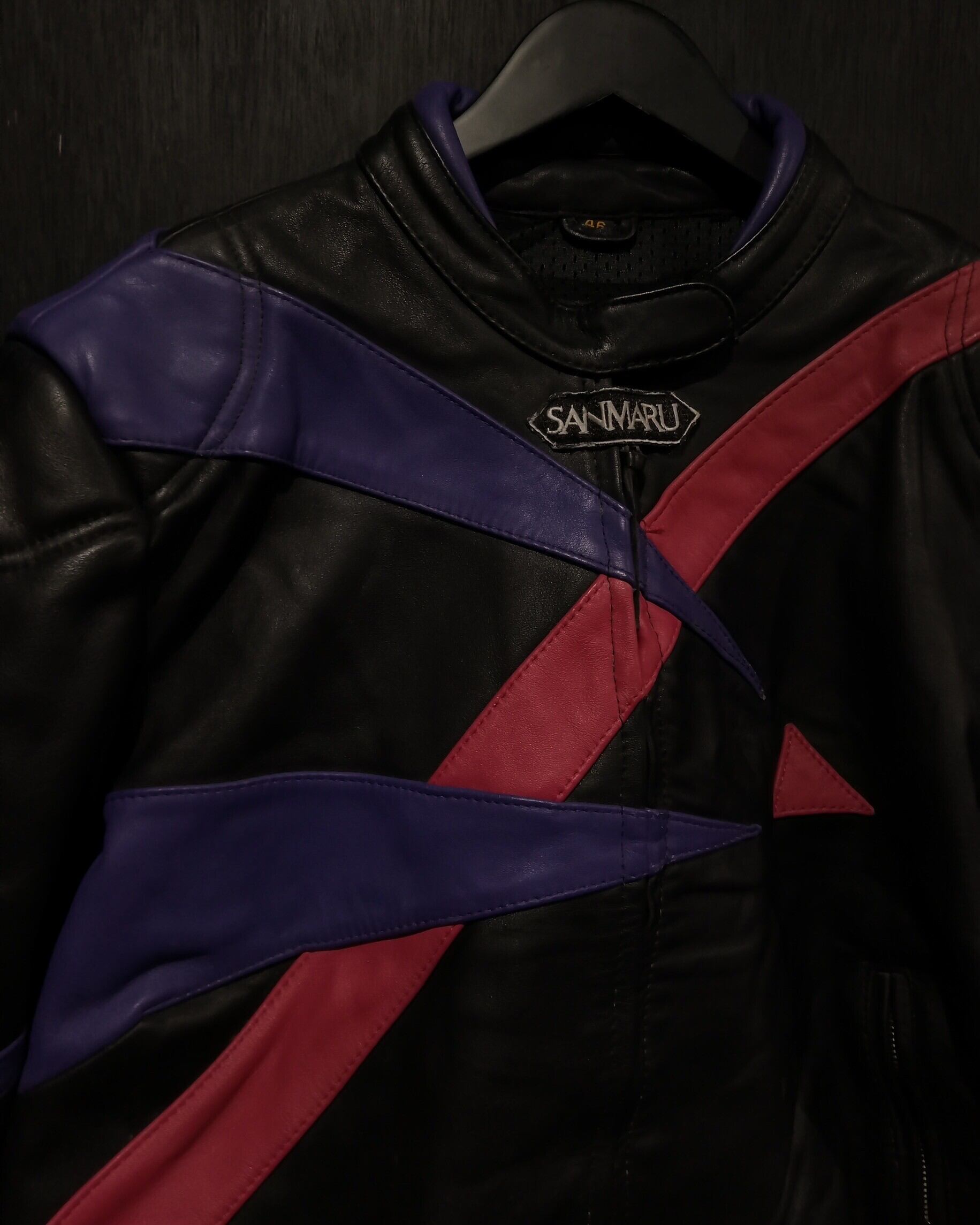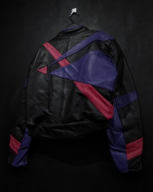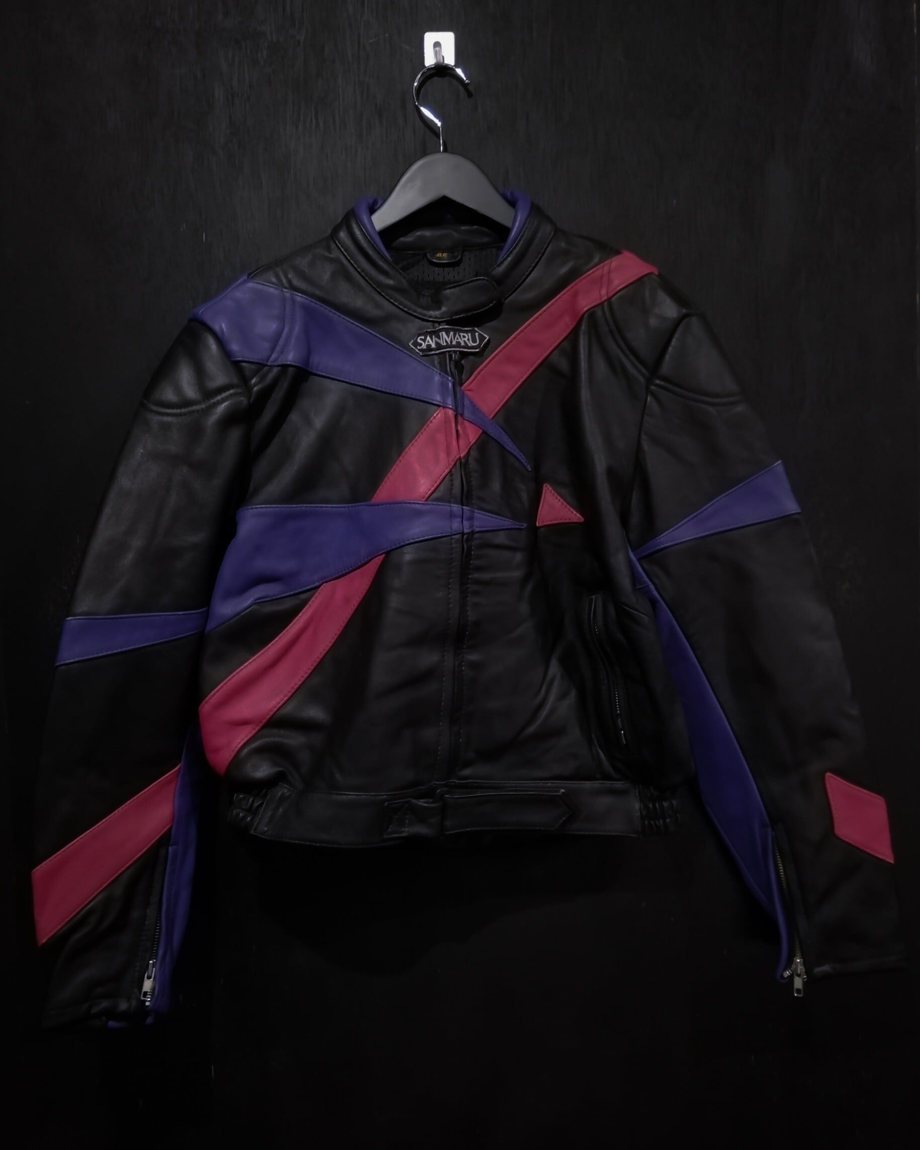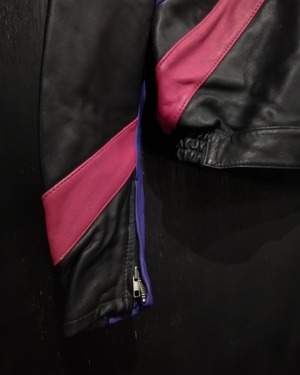 程よい肉感としなやかさを兼ね備えた上質なレザーを用いて、紫×のピンクのカラーリンでアーティスティックなラインを載せた、稀有なレザーのレーシングジャケット。