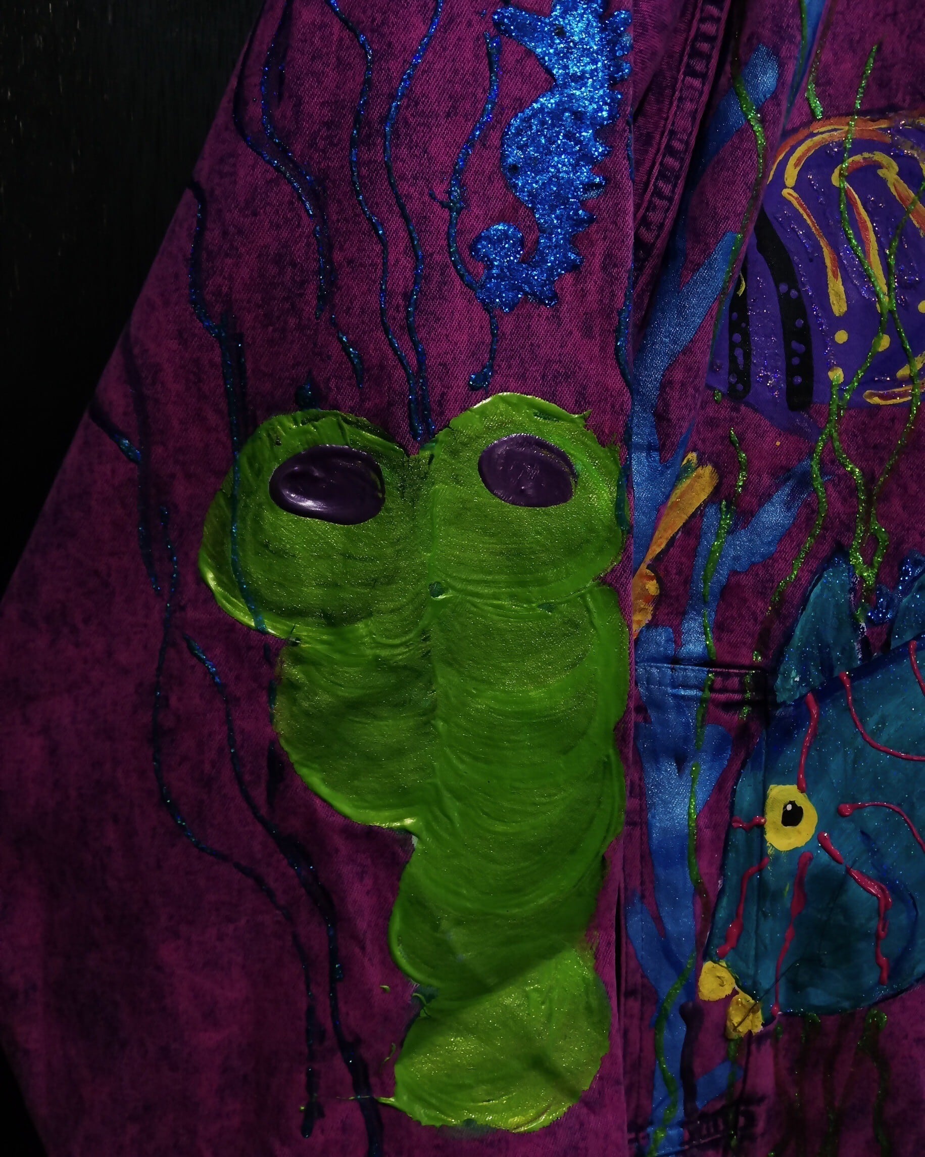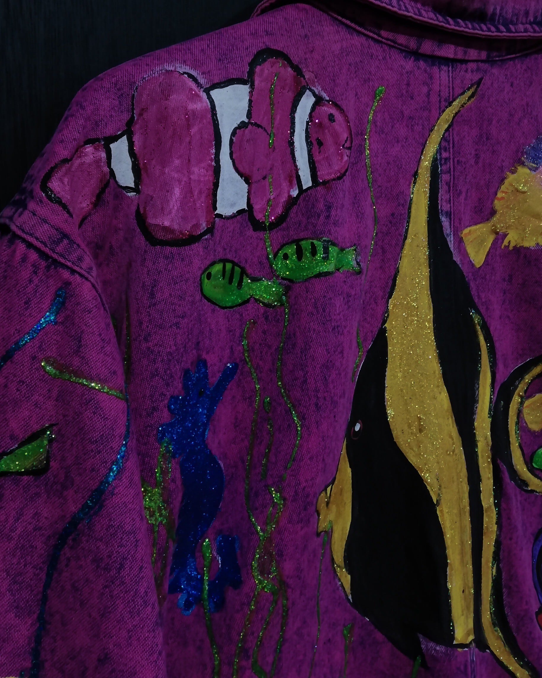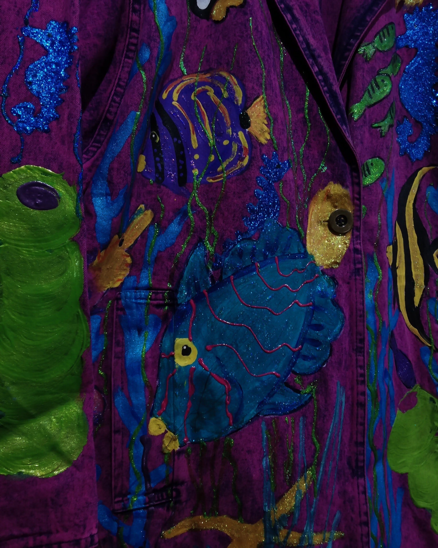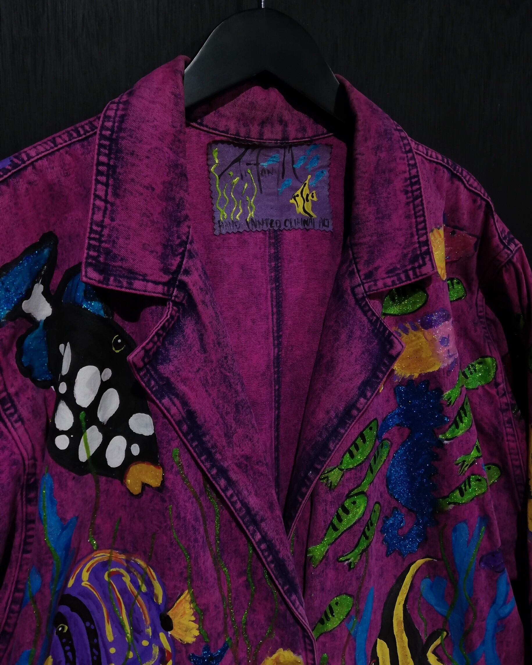 妖艶なパープルピンクに染めたデニム素材をベースとし、全体に華麗に泳ぎ回る海の生物たちをハンドペイントでデザインしたテーラード型のデニムジャケット。