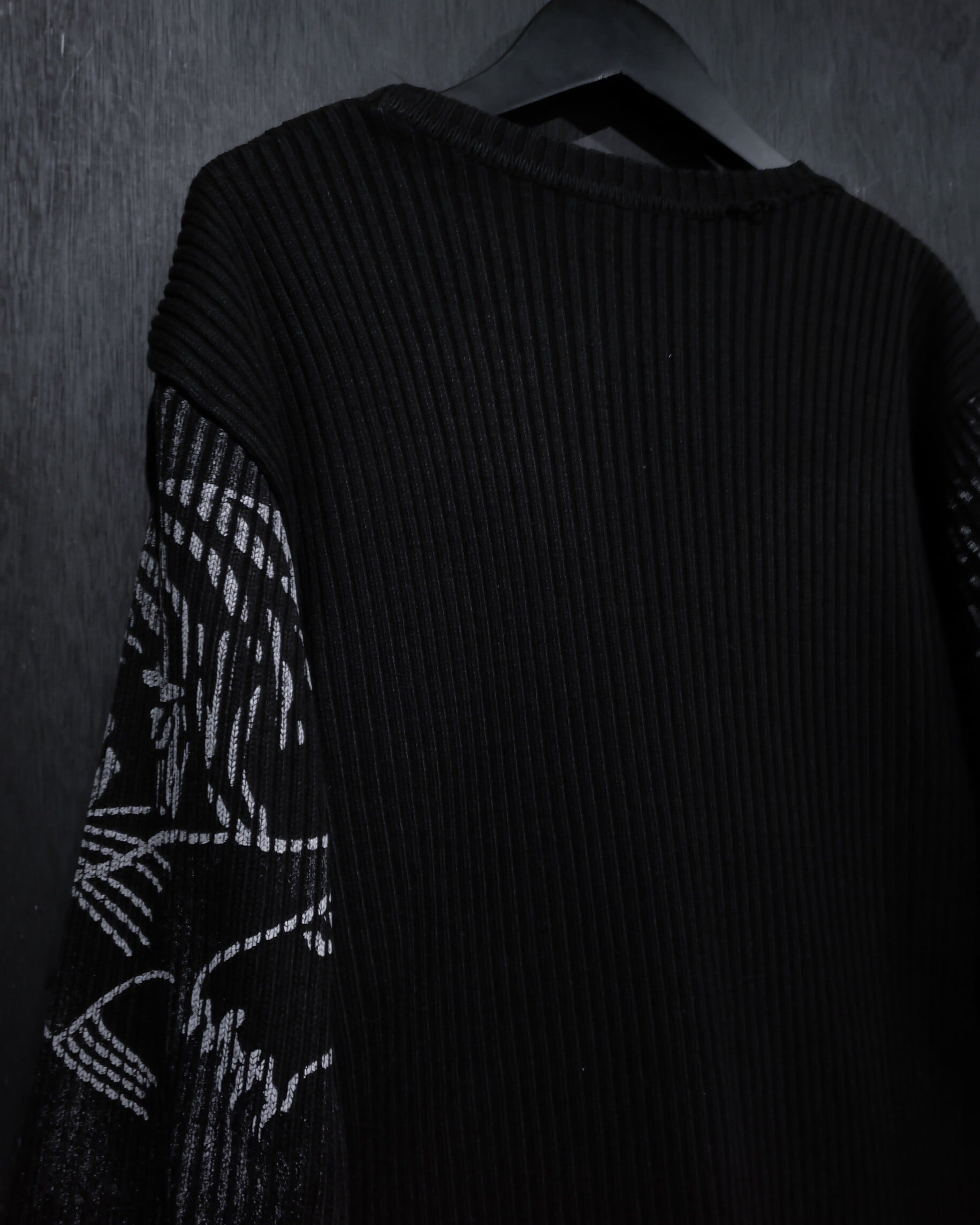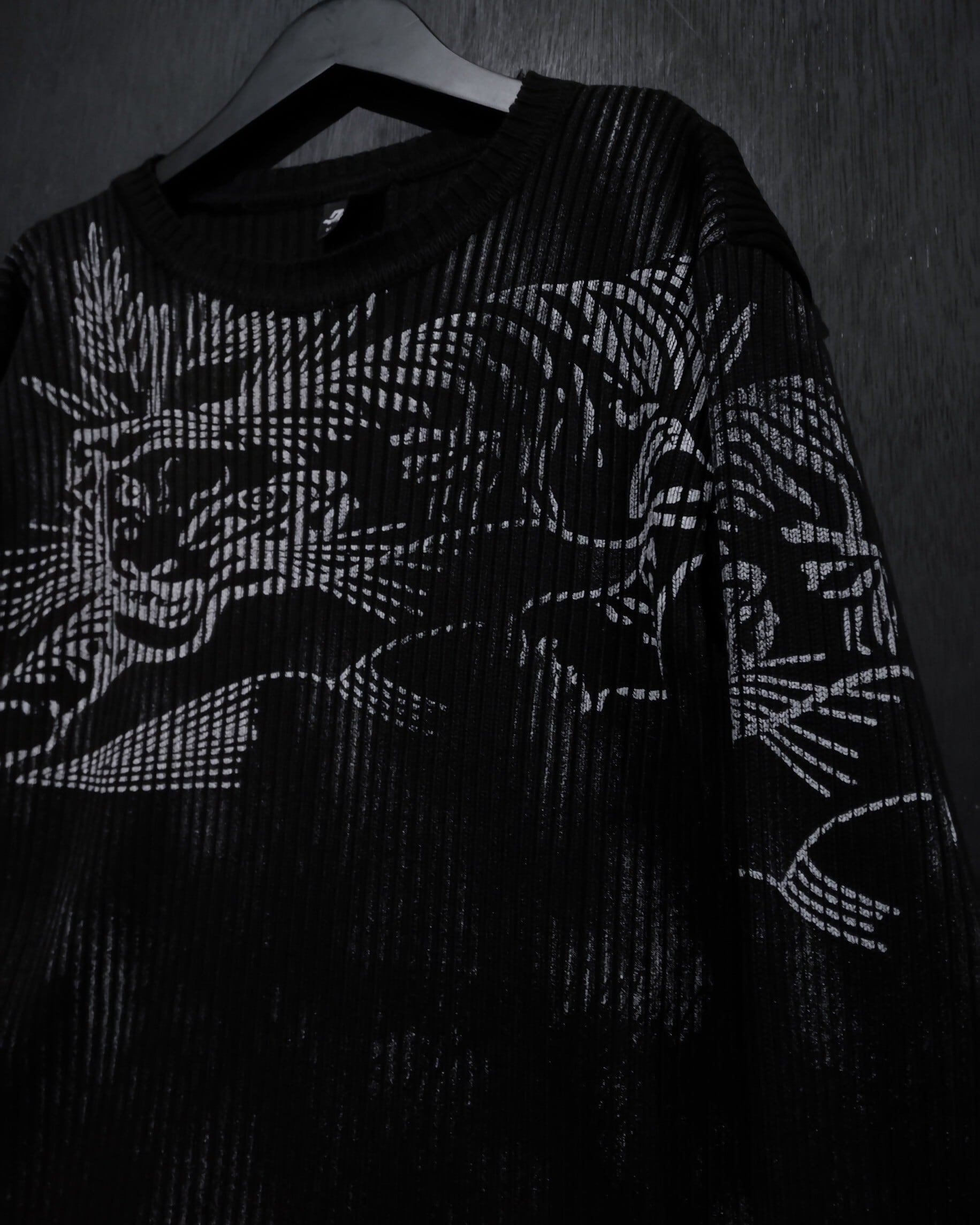 リブニット特有の凹凸と虎のプリントが相まって、より立体感のある仕上がりに。身頃、アームにプリントが施され、かなり迫力のあるデザインながらモノトーンでの仕上がりなので、コーディネートに組み込みやすいのが嬉しいポイントですね。