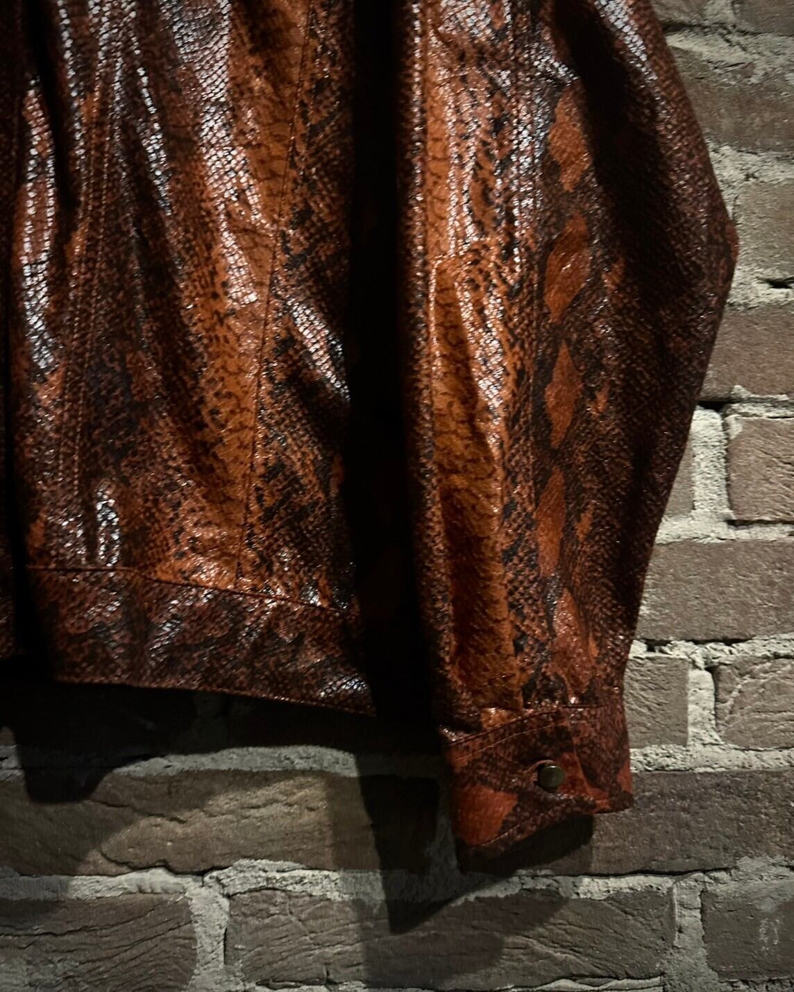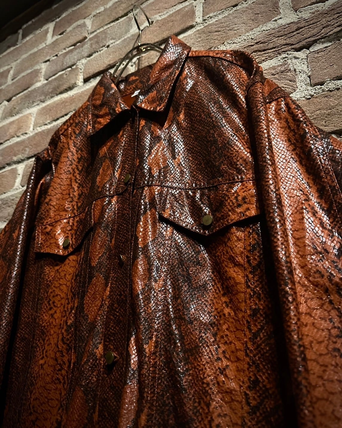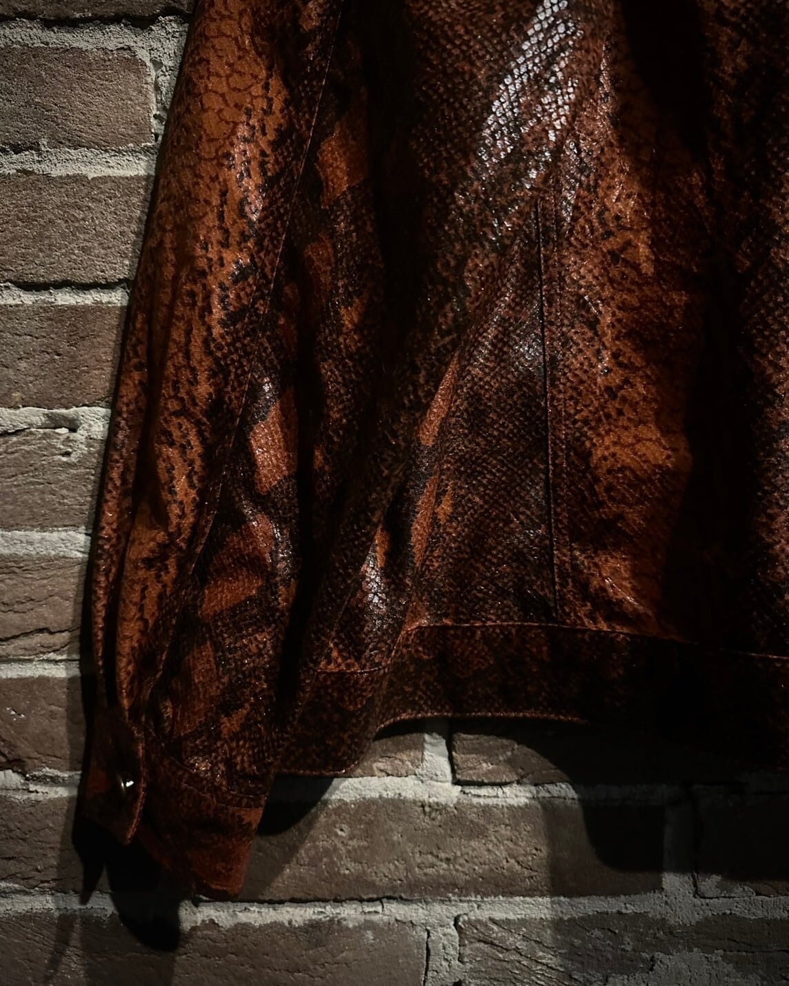 形はいわゆるデニムジャケットに用いられるトラッカー型。パイソン柄のラグジュアリーさと、トラッカー型のラフさが混ざり合った素晴らしいデザインバランスの1着に。