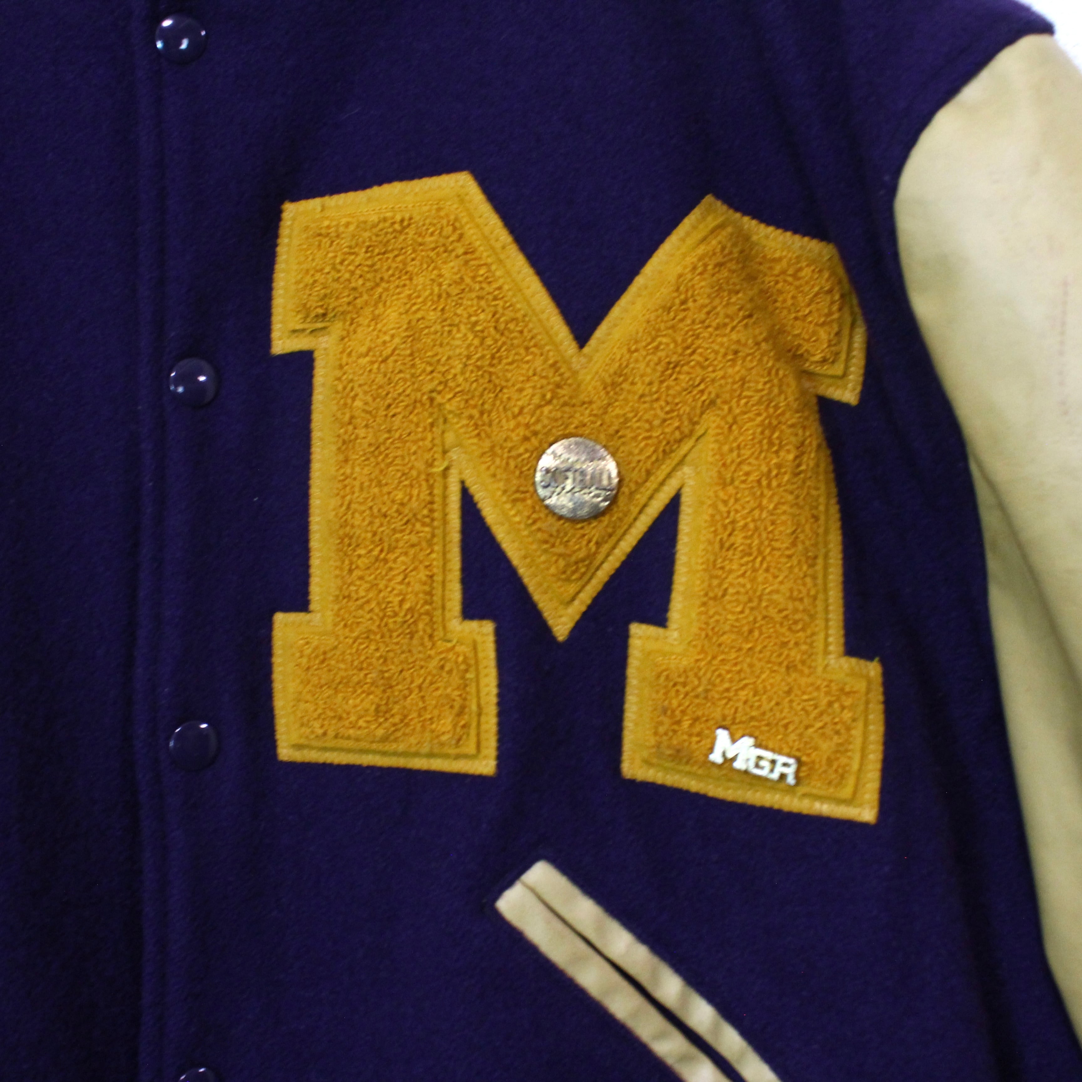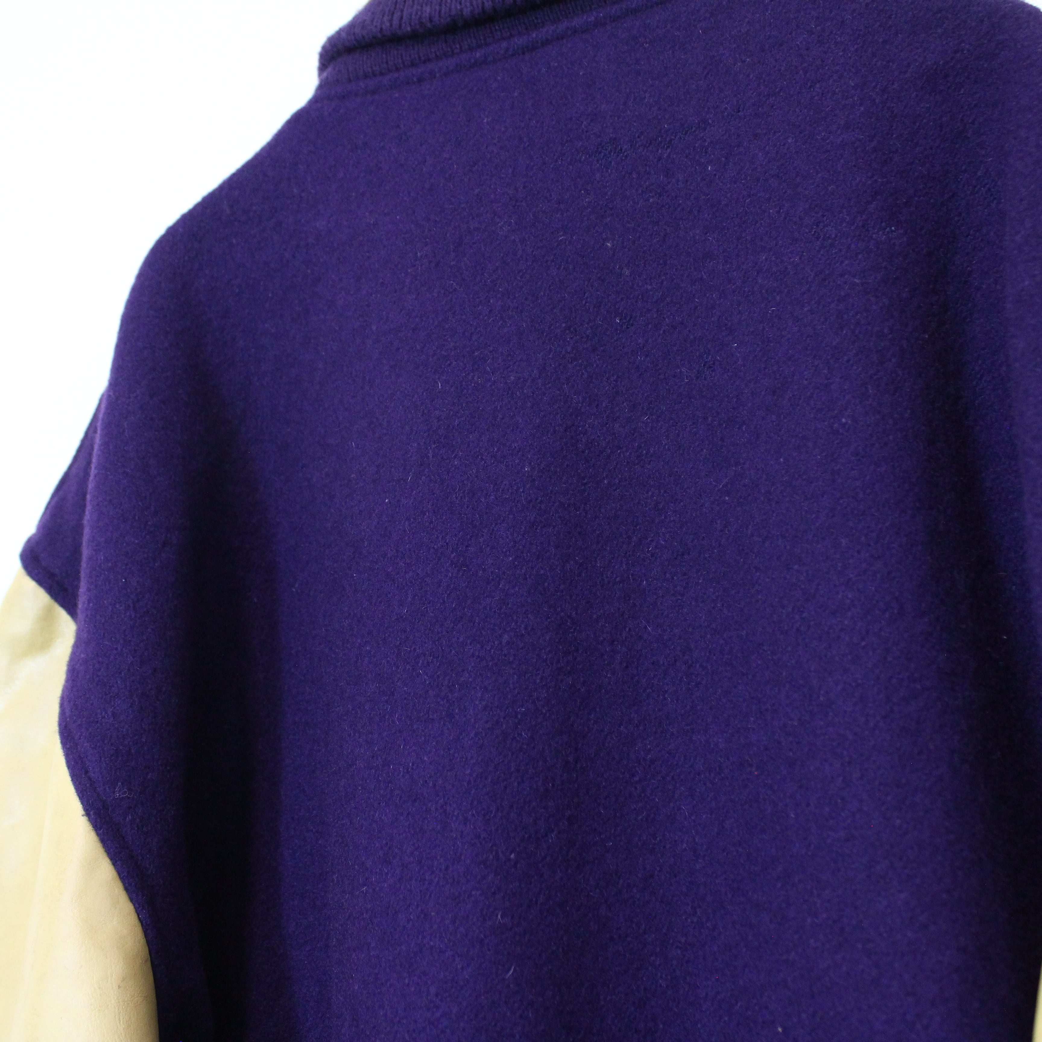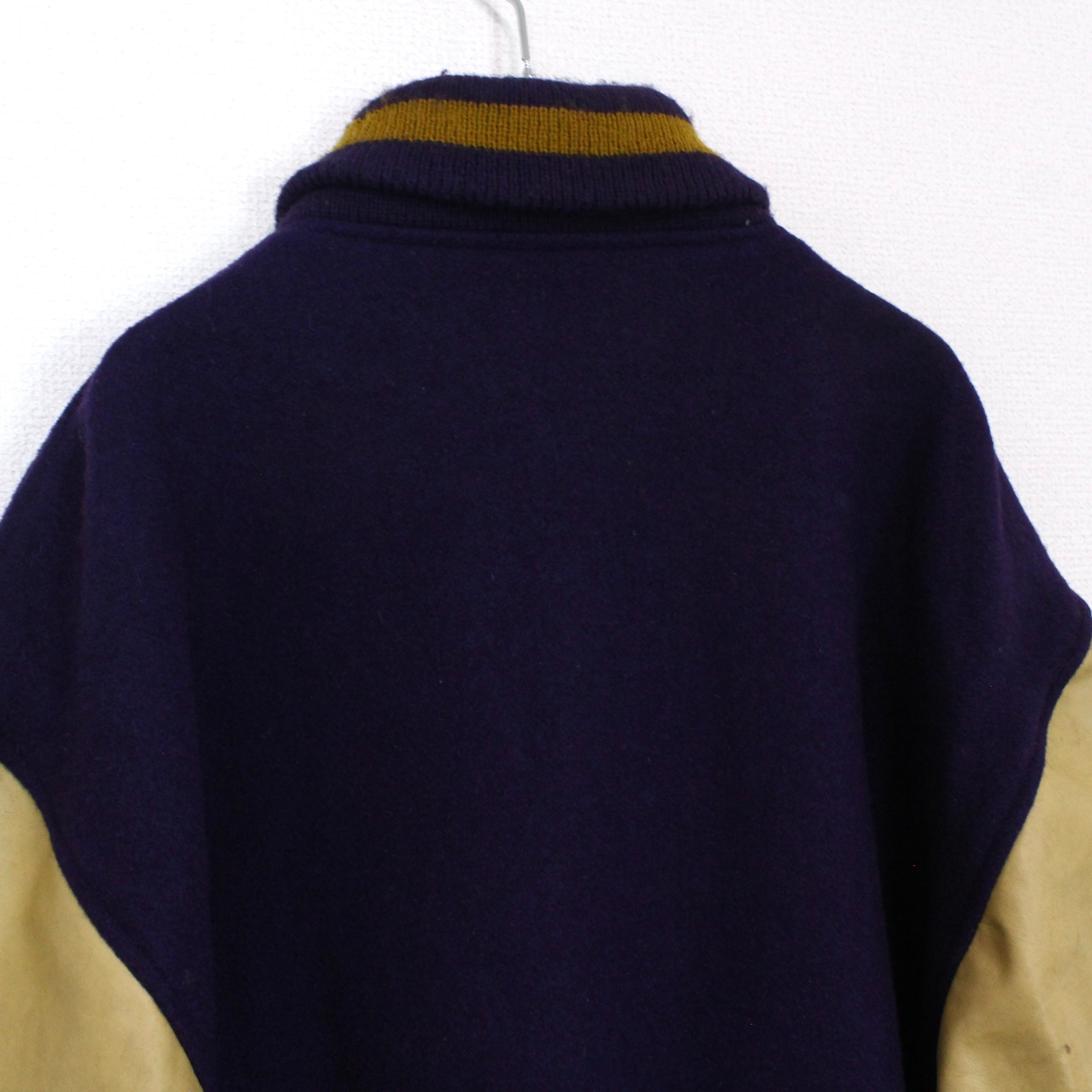 ギュッと目の詰まった上質なパープルのウール地のボディに、アームにはレザーを切り替えたスタジャン。
