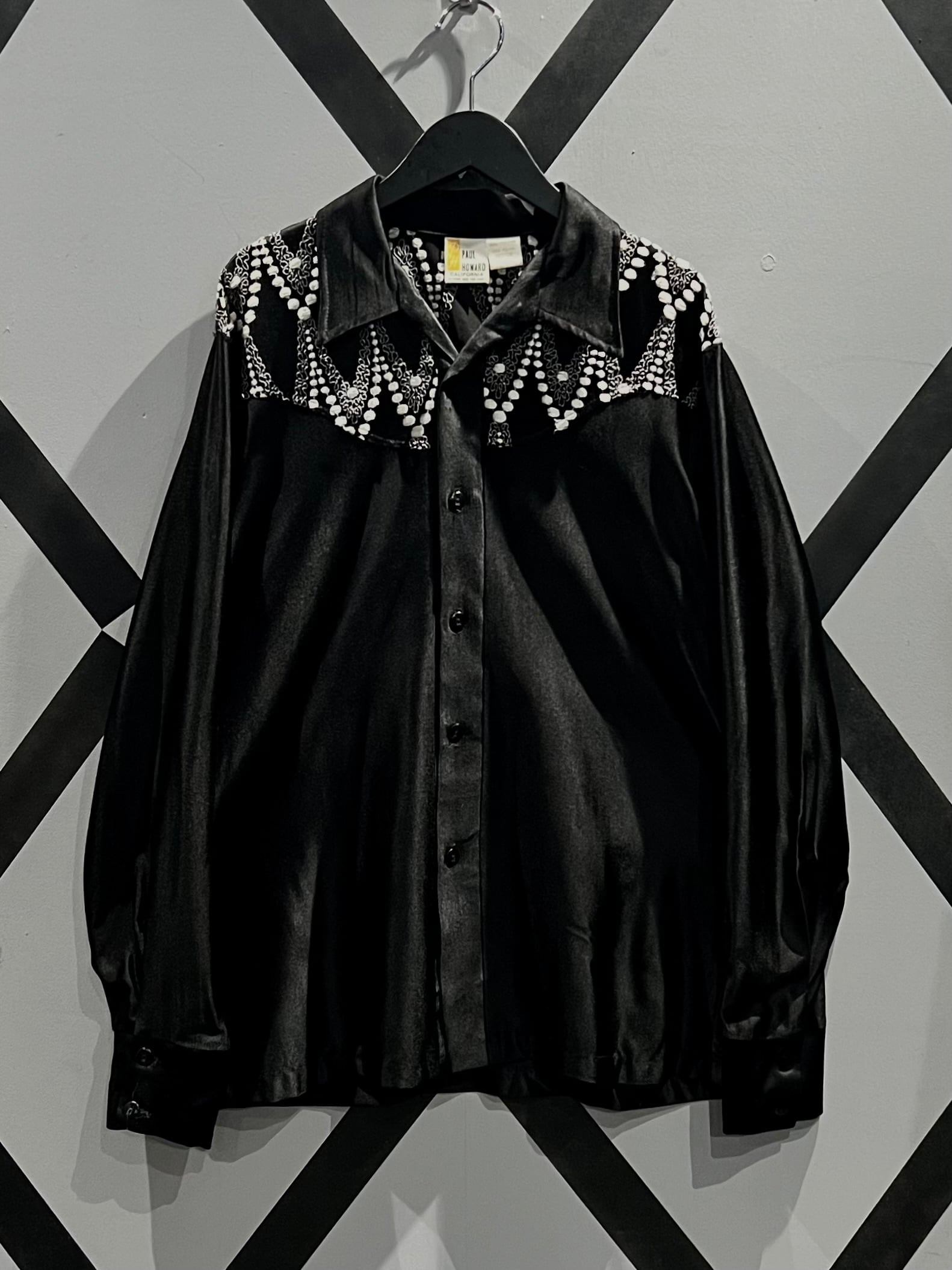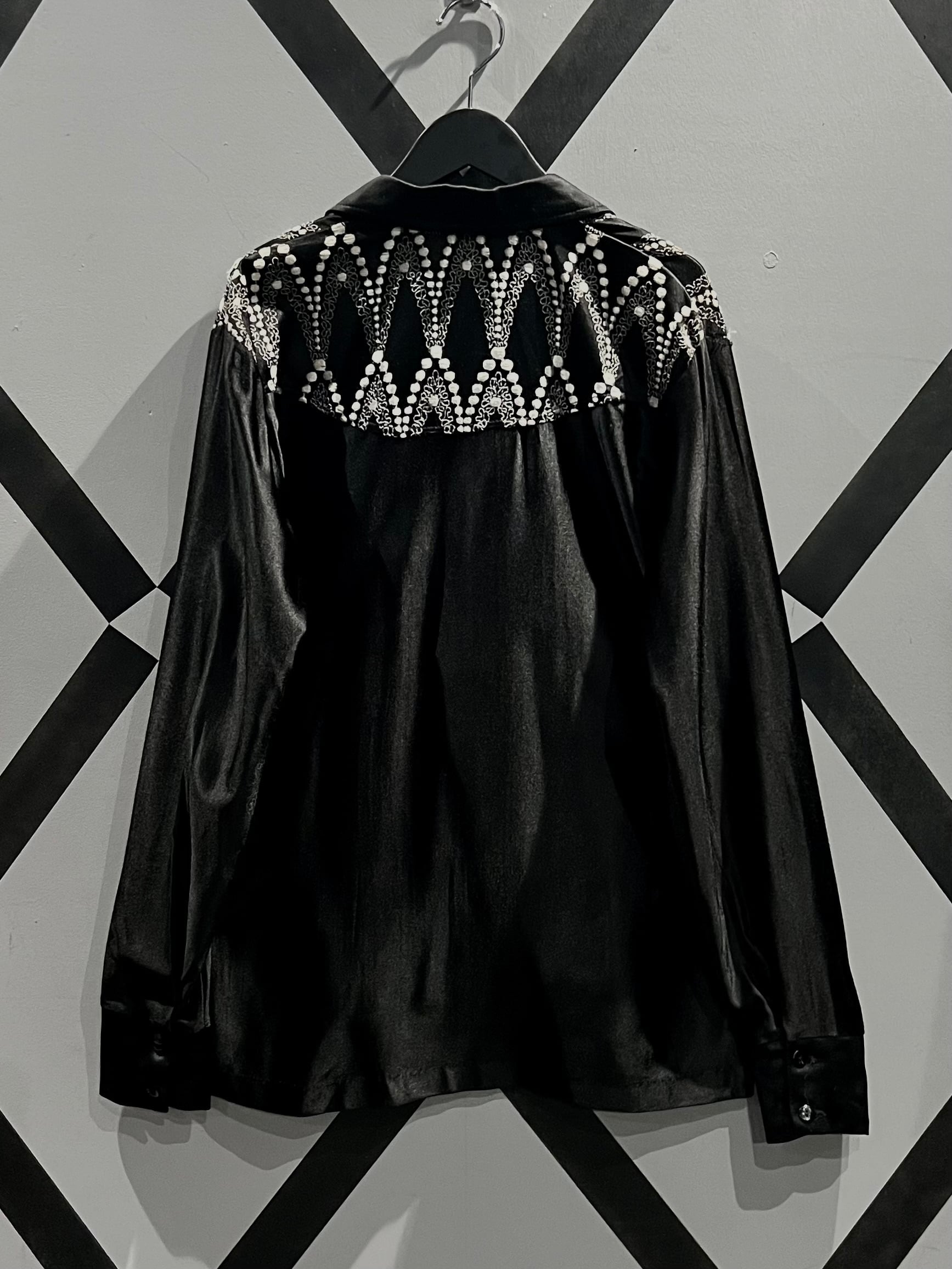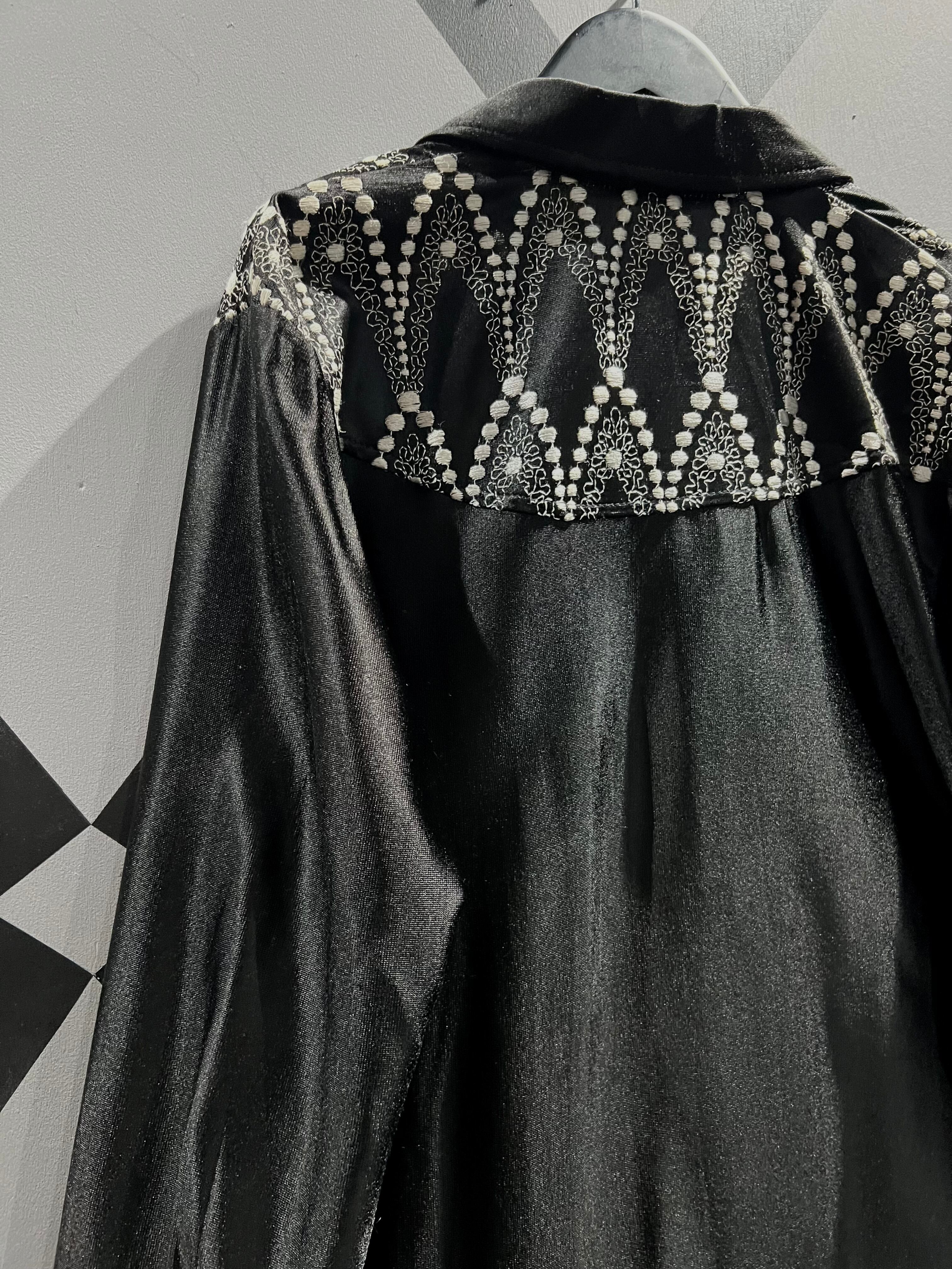 ツルッと滑らかなブラックのボディをベースに、前後のヨークにアーティスティックな刺繍を刻んだ長袖シャツ。