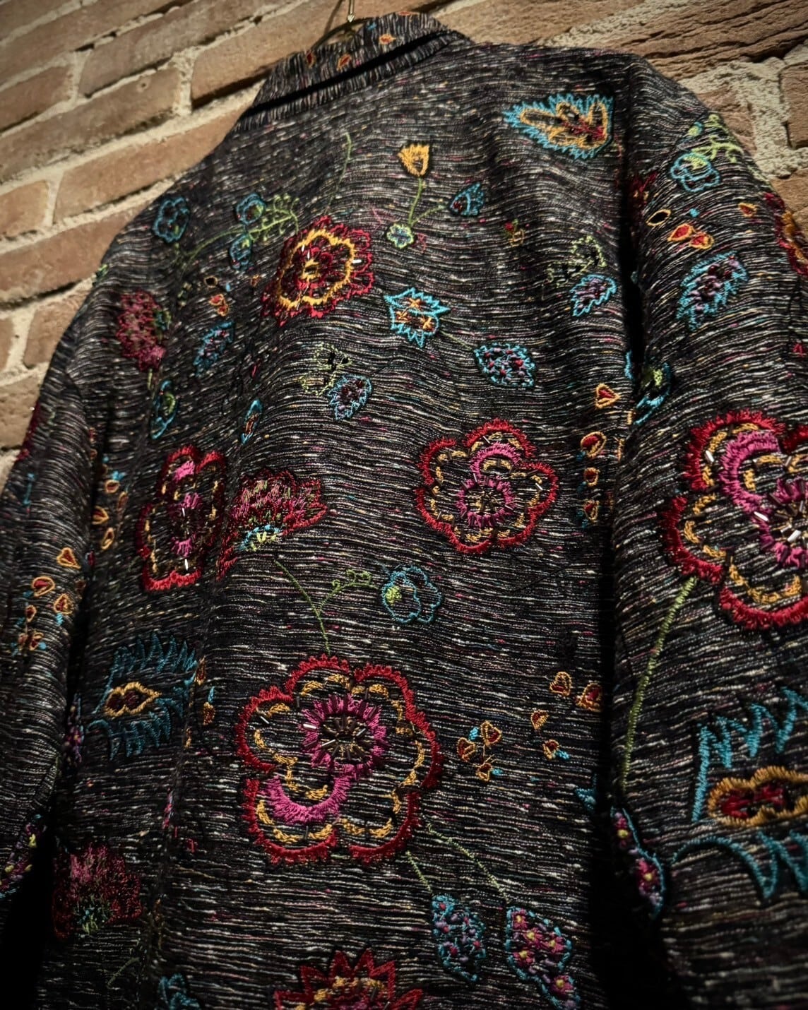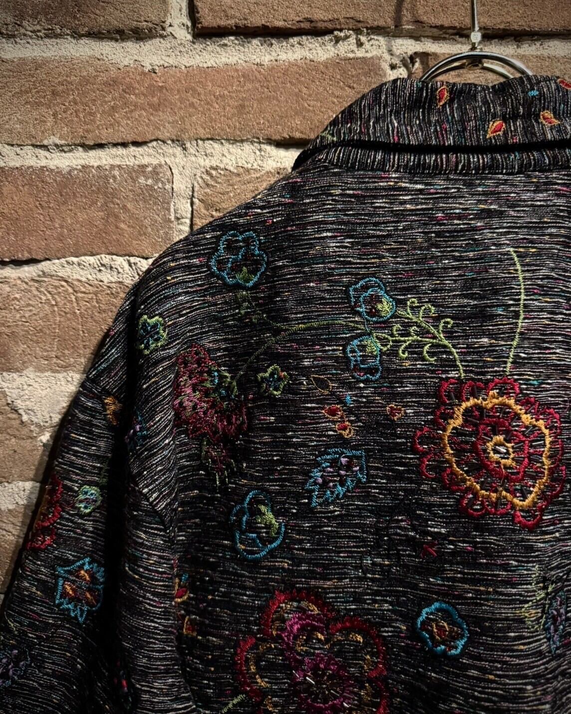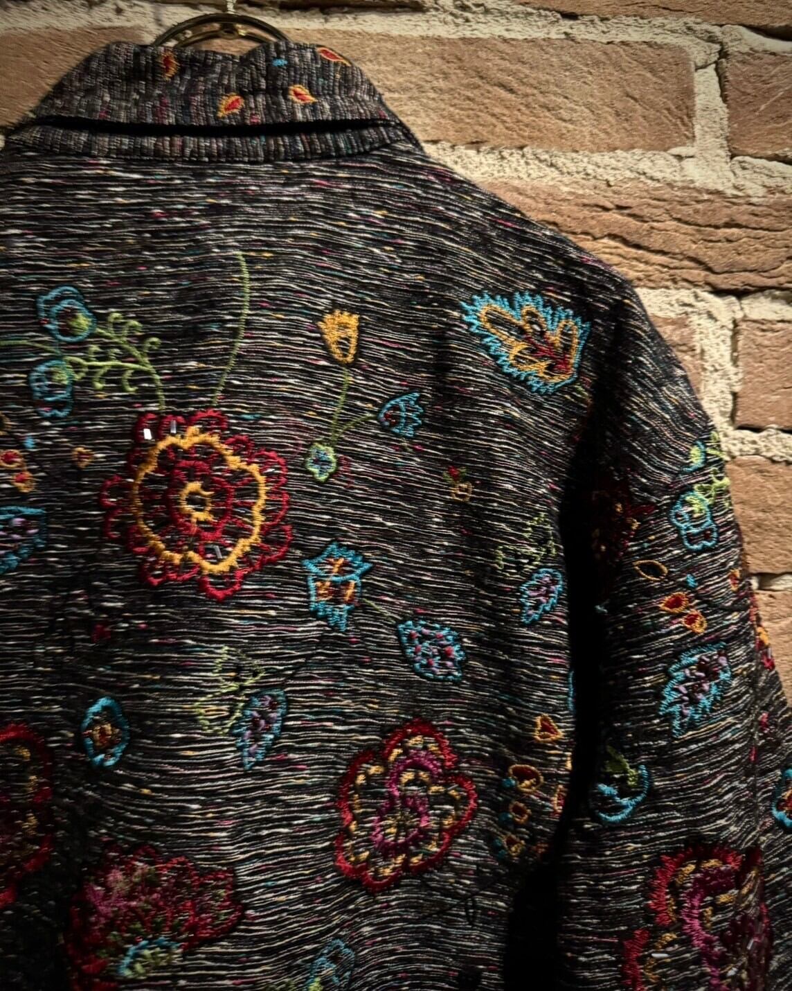 多彩な色使いの糸を織り込み、ボーダー状の立体感があるボディに花の刺繍を刻んだ、レトロかつラグジュアリーな雰囲気漂う逸品。