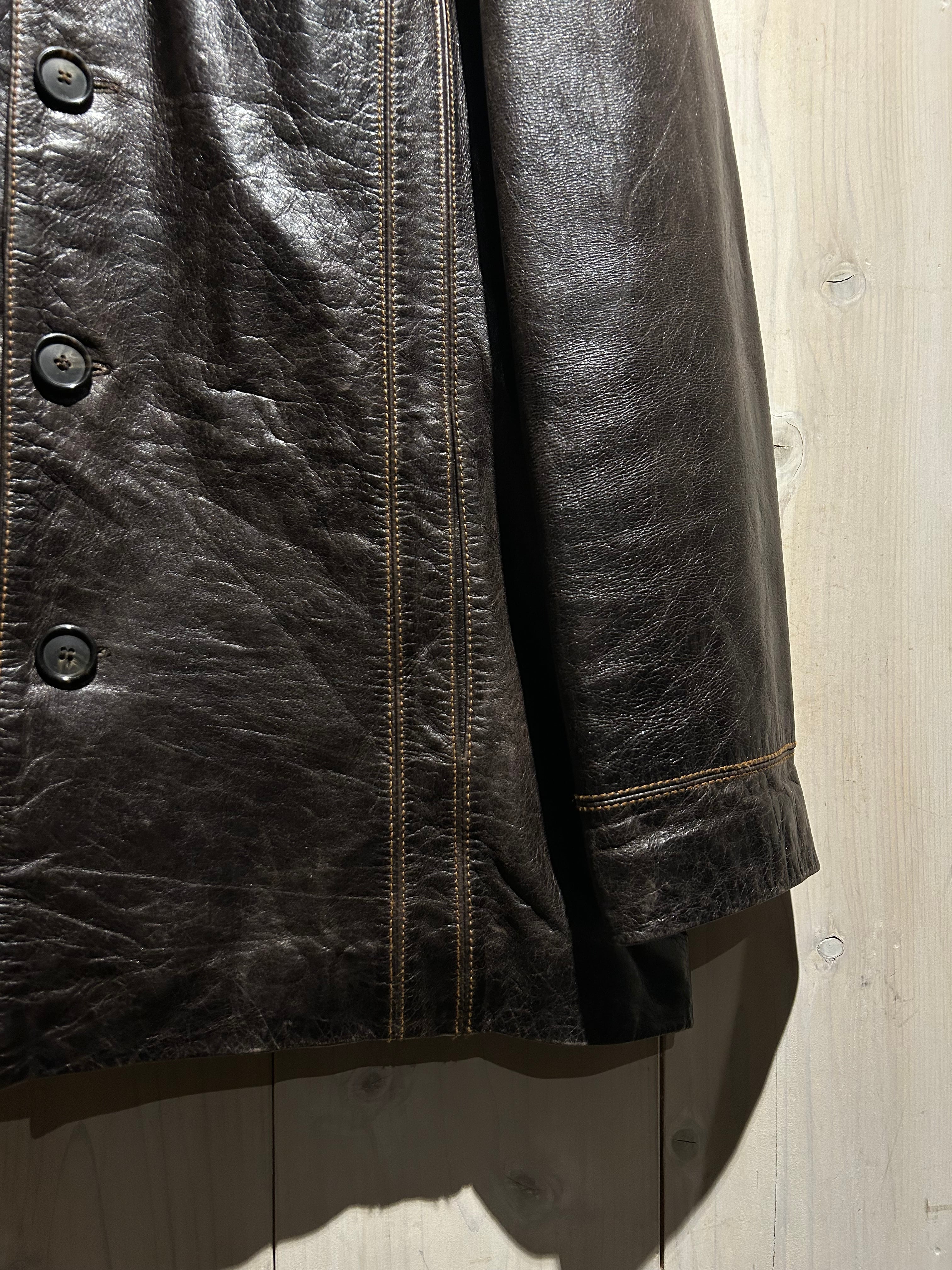 ハリ、艶感のある上質なレザーを用いて、土臭い雰囲気を持つカジュアルなカバーオール型に落とし込んだマニッシュな風合いがムンムンに漂うスペシャルなレザージャケット。