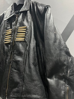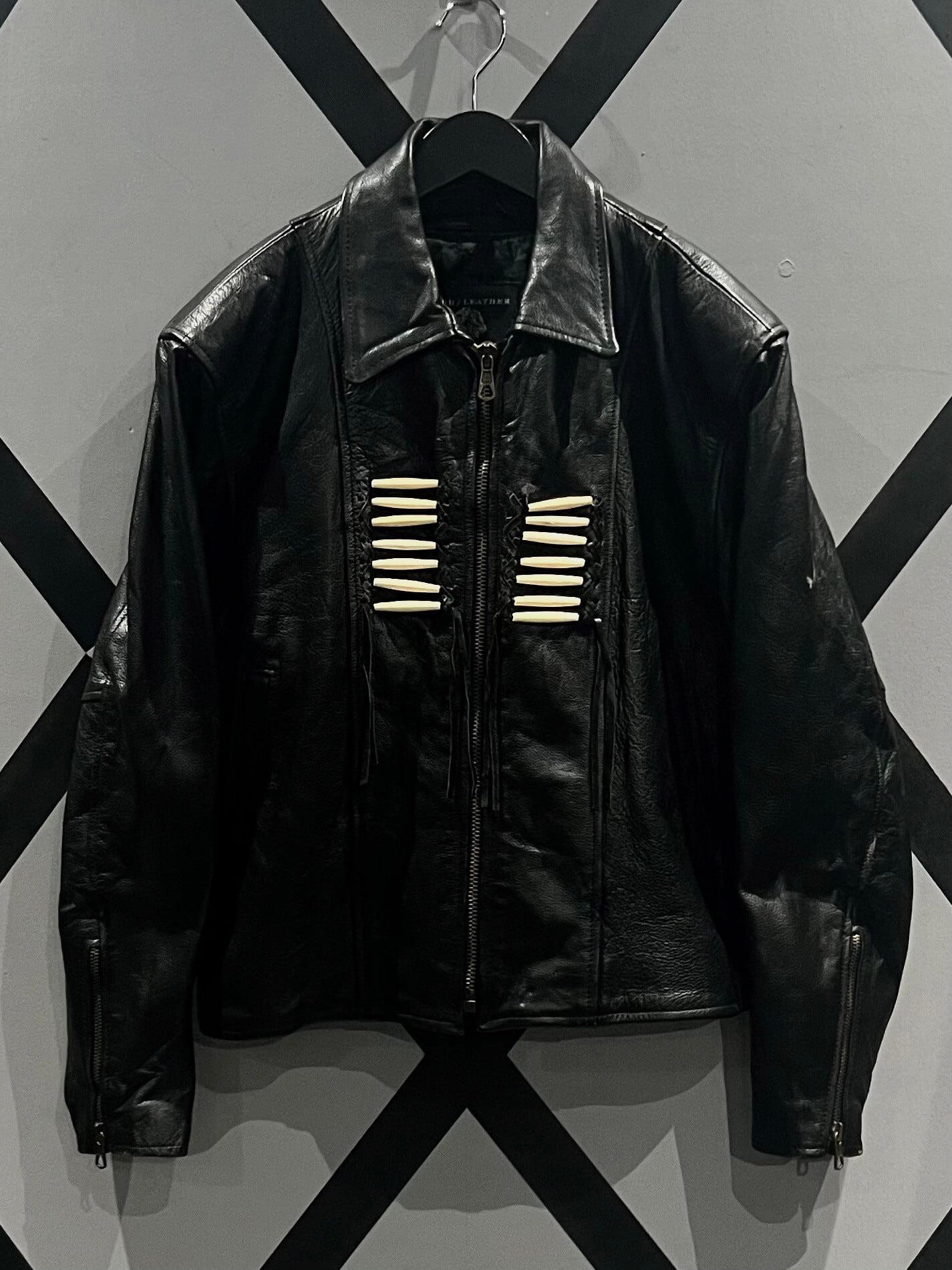 ハリのある上質なブラックレザーを使用したボディに、前背面にボーンビーズを模したビーズの装飾とレースアップのデザインが施されたレザージャケット。