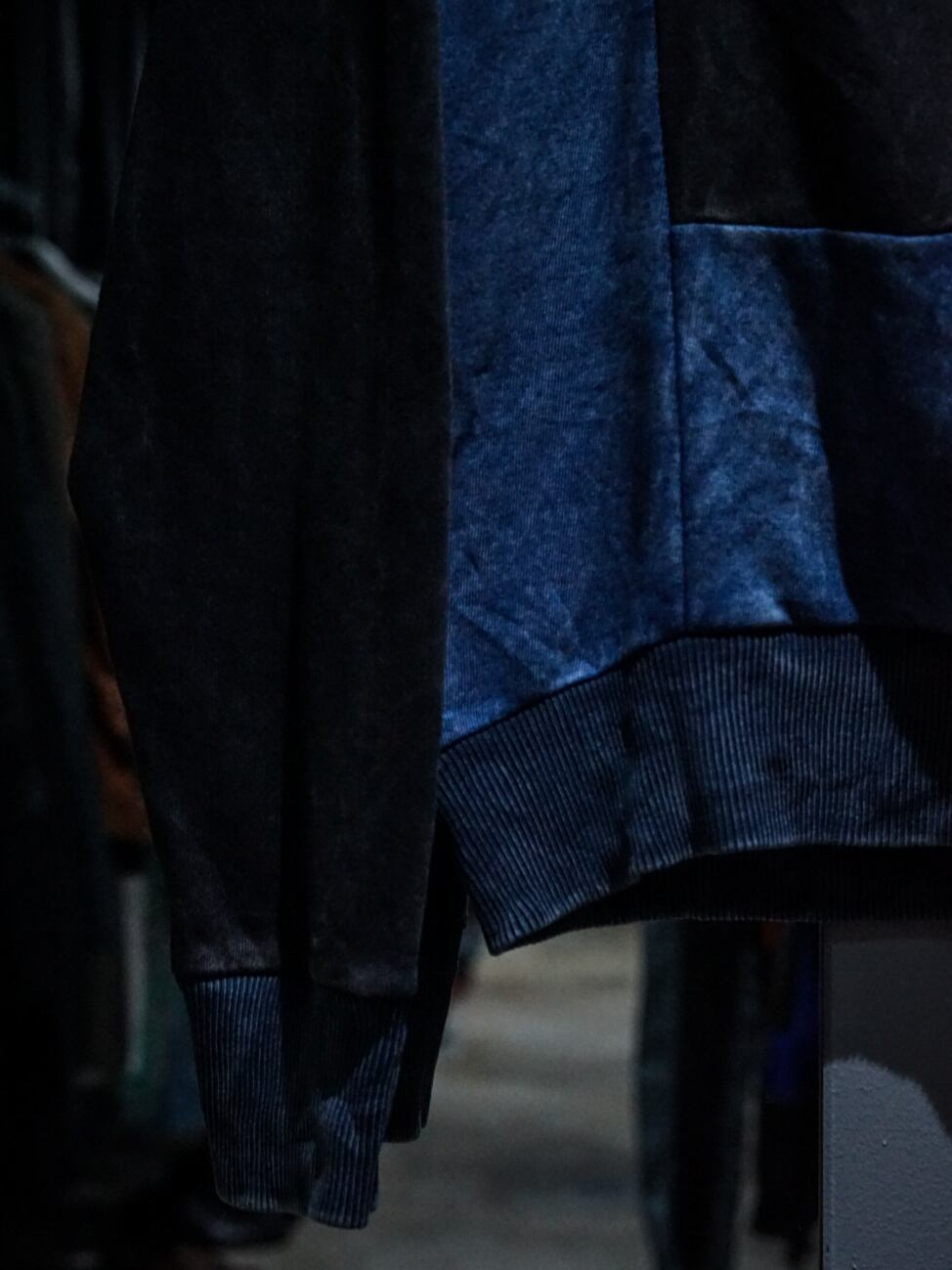 フェードの効いたデニムライクなカラーリングのスウェットのボディーに切り替えのデザインを施した1着。