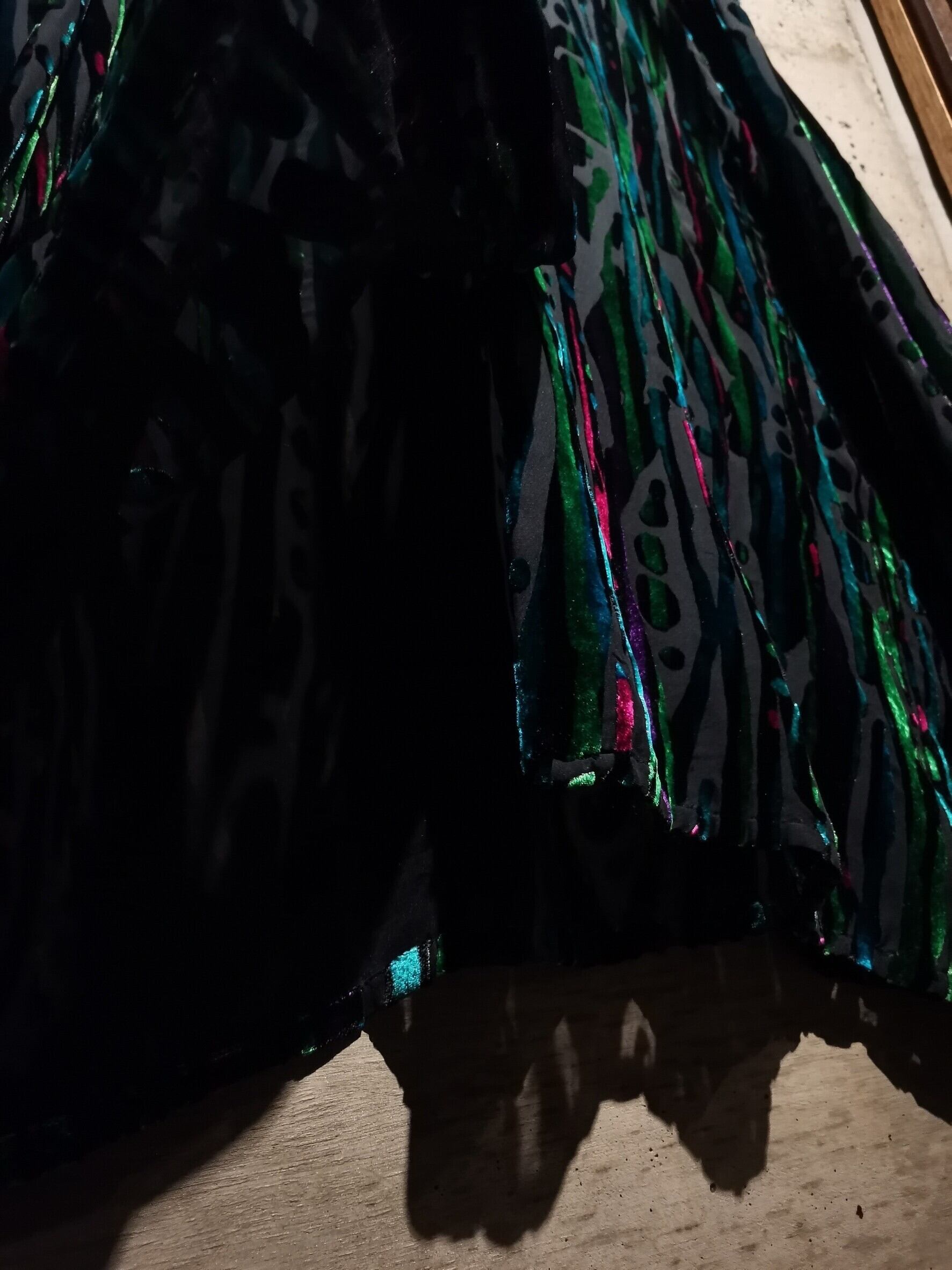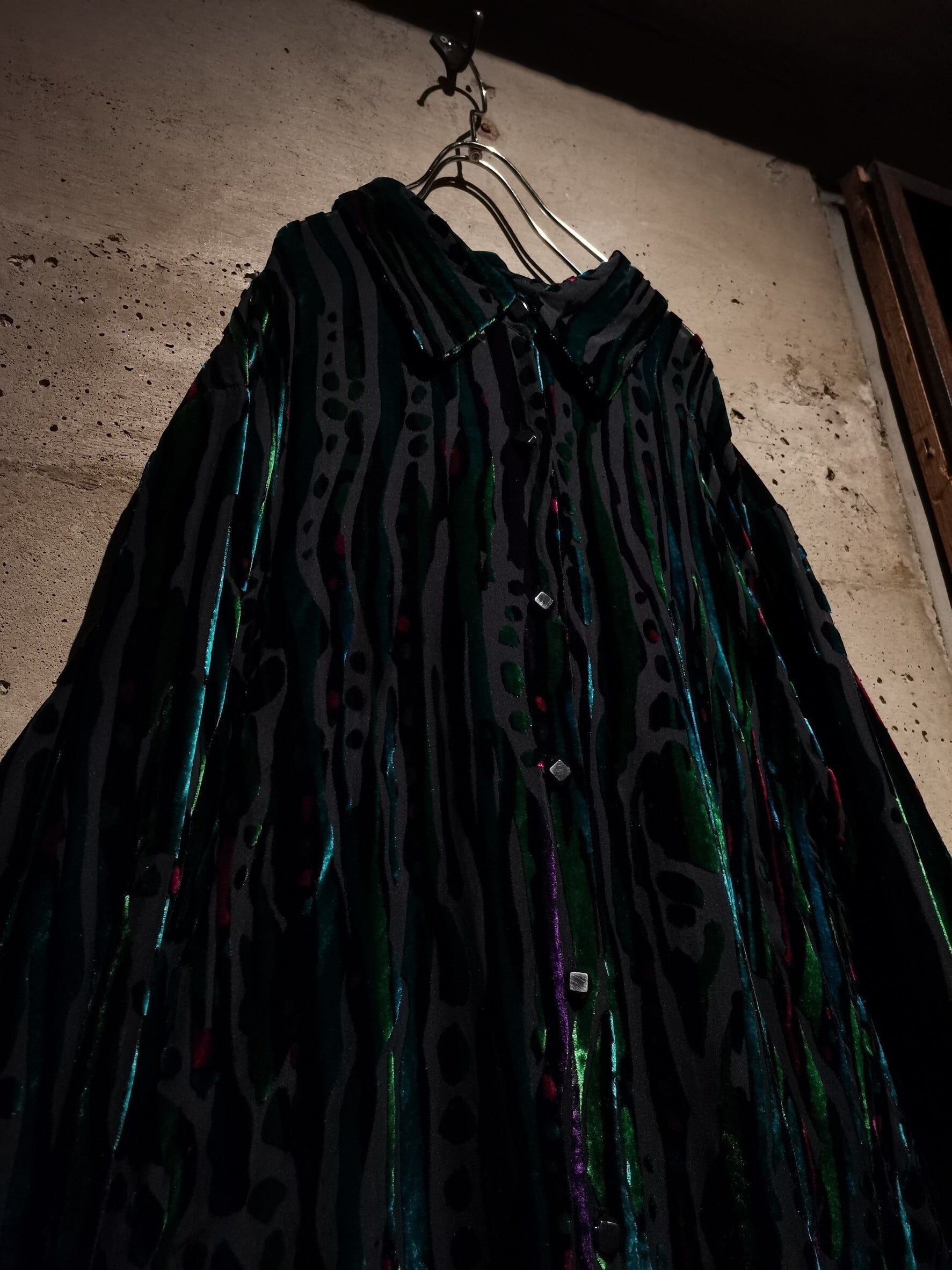 透け感の美しいブラックシアーを用いたボディに、青、緑、黒、紫のベロアをフロッキープリントによってストライプ状に施した長袖シャツ。