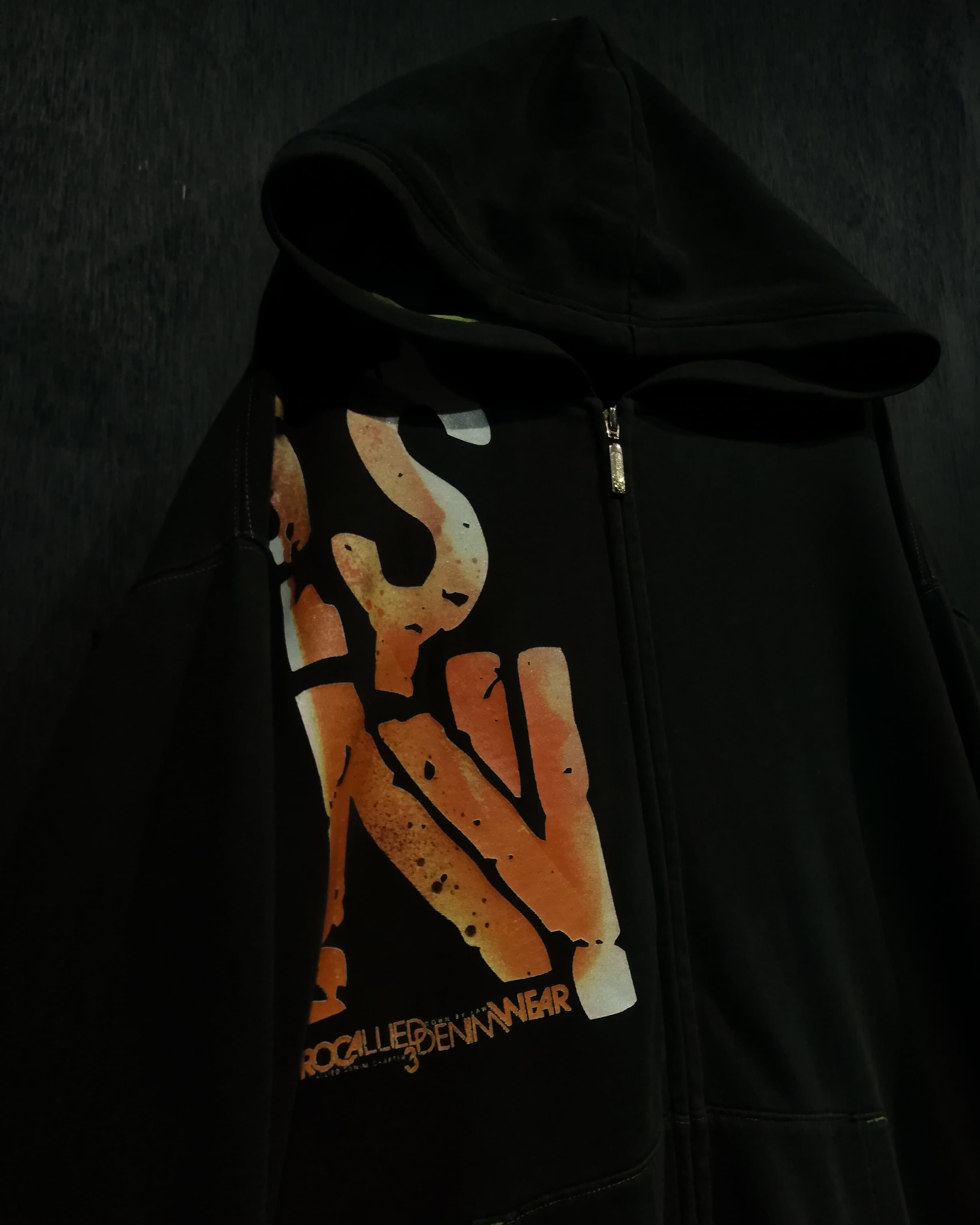 ブラックのボディをベースに、右胸にはインパクトのあるグラフィックのデザインをプリントした、ストリートブランドらしいルックスが超イケてるジップアップフーディ。