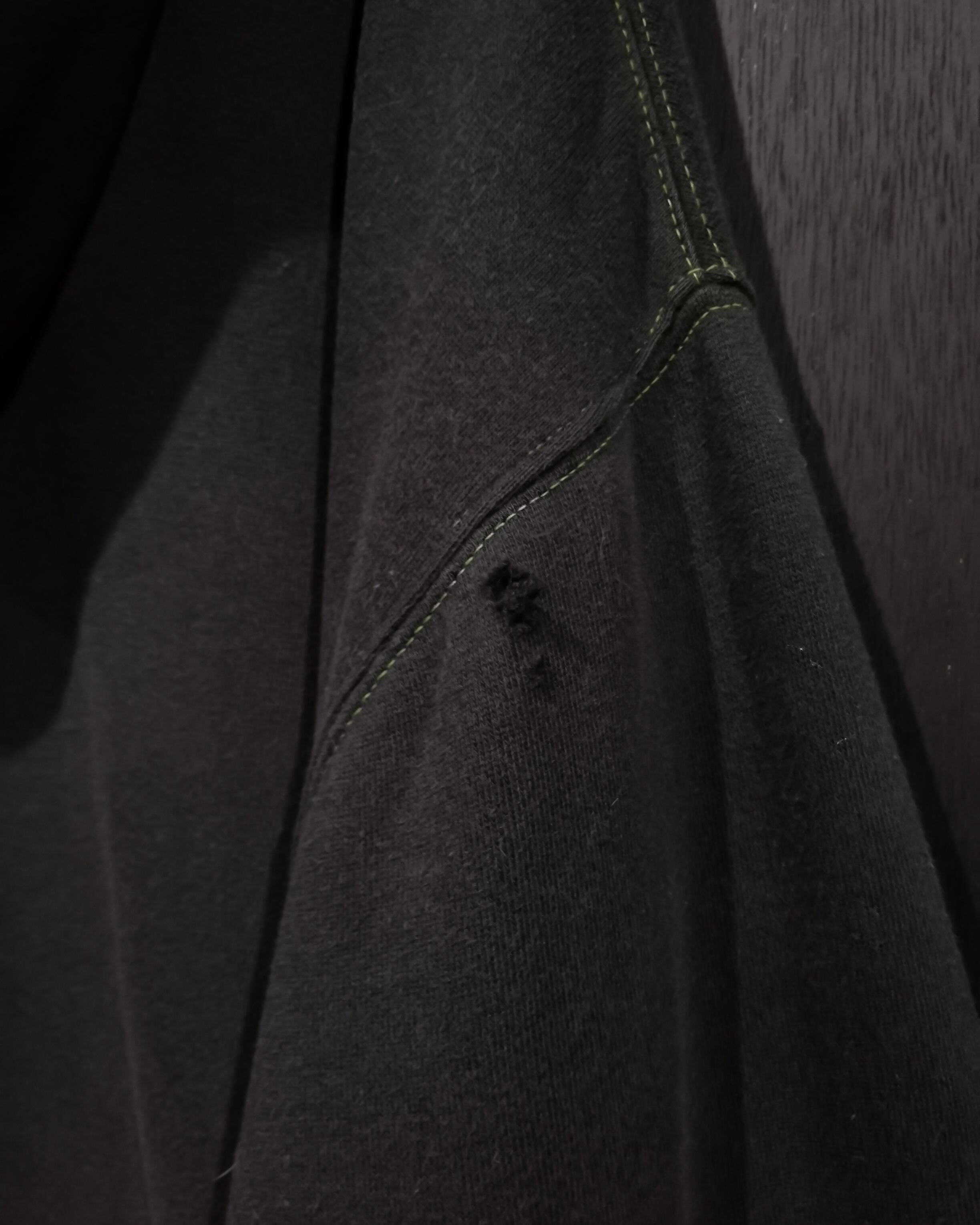 ジップアップ仕様に、肩、身幅、アームも広く取られた肩の落ちるルーズなサイジング。ボディの質感も相まって深い陰影が生まれます。