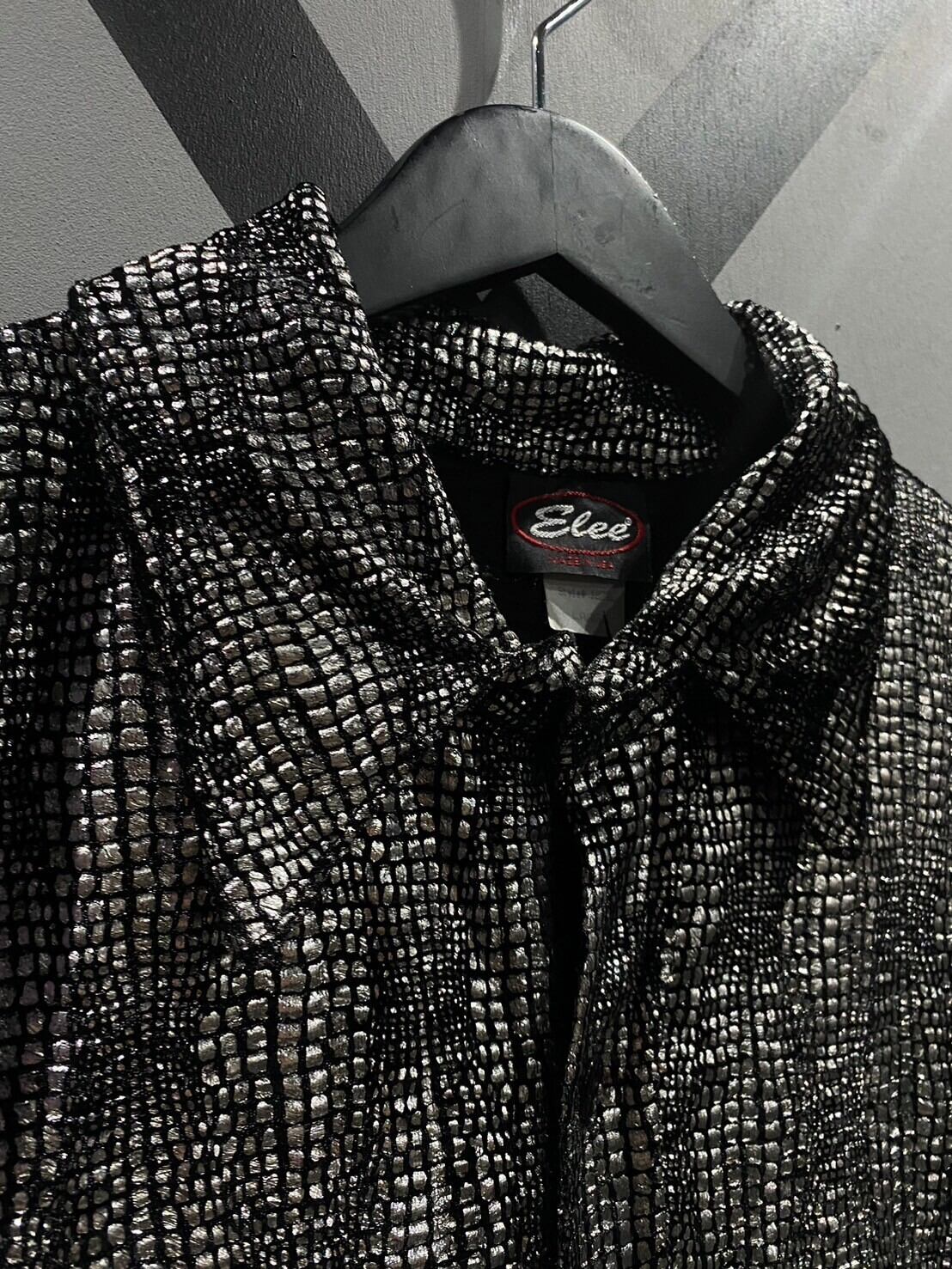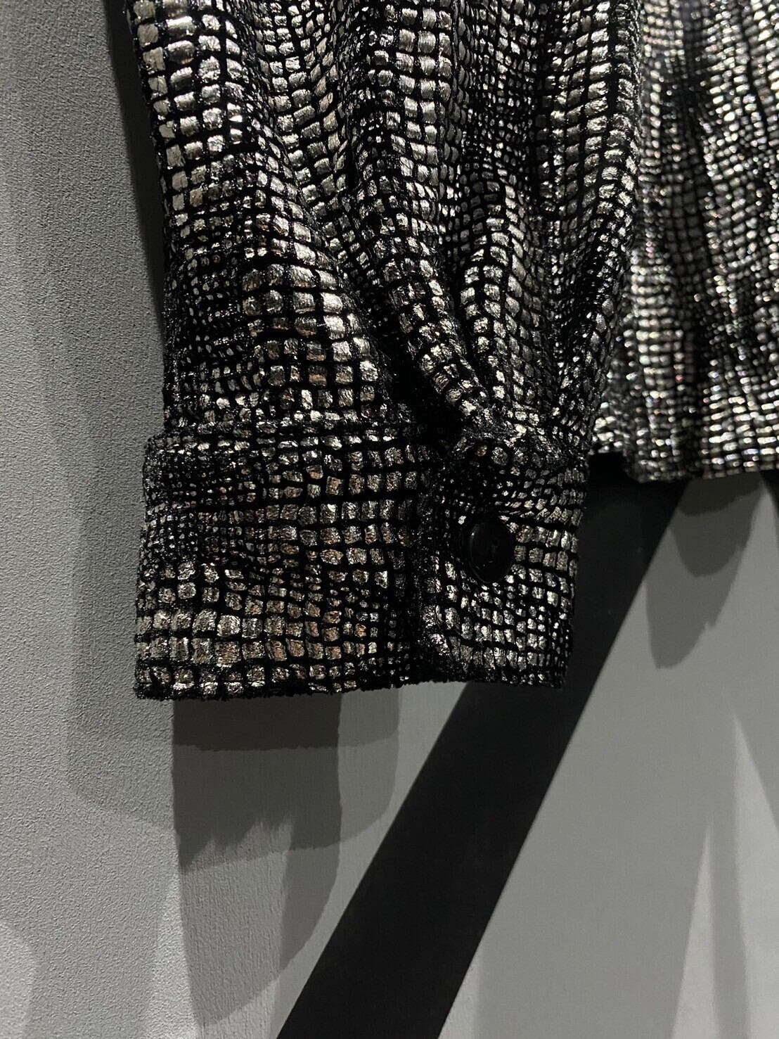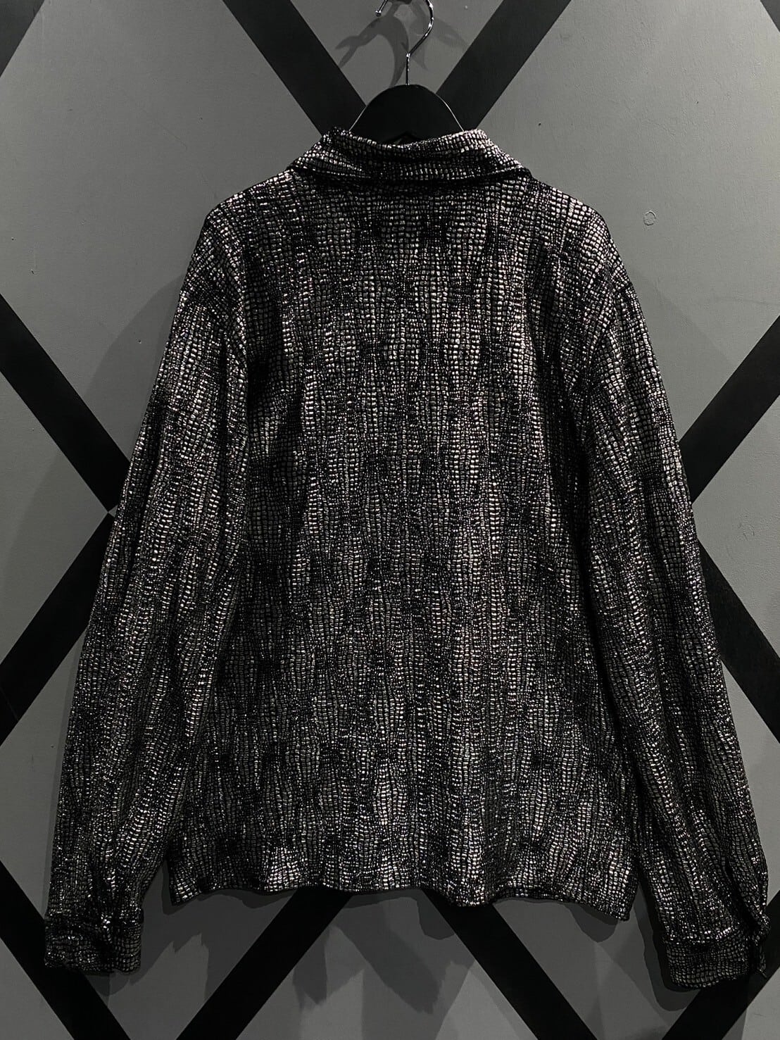フワッと柔らかなベロア調のボディをベースに、シルバーカラーのプリントを格子状にみっちりと施した逸品。光の当たり加減で鋭く輝き、圧倒的な存在感を放ちます。