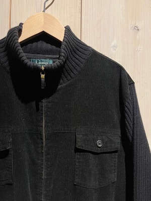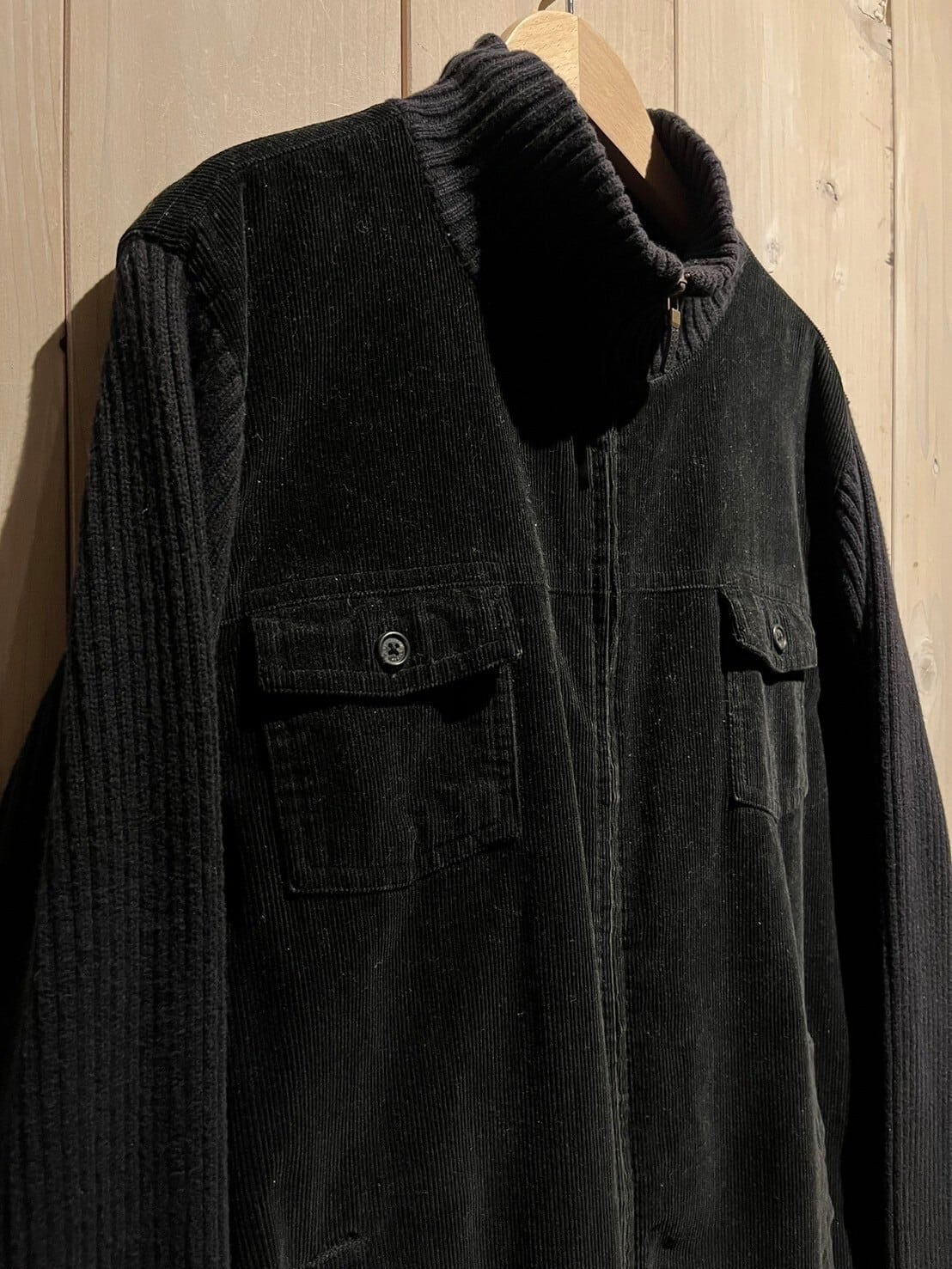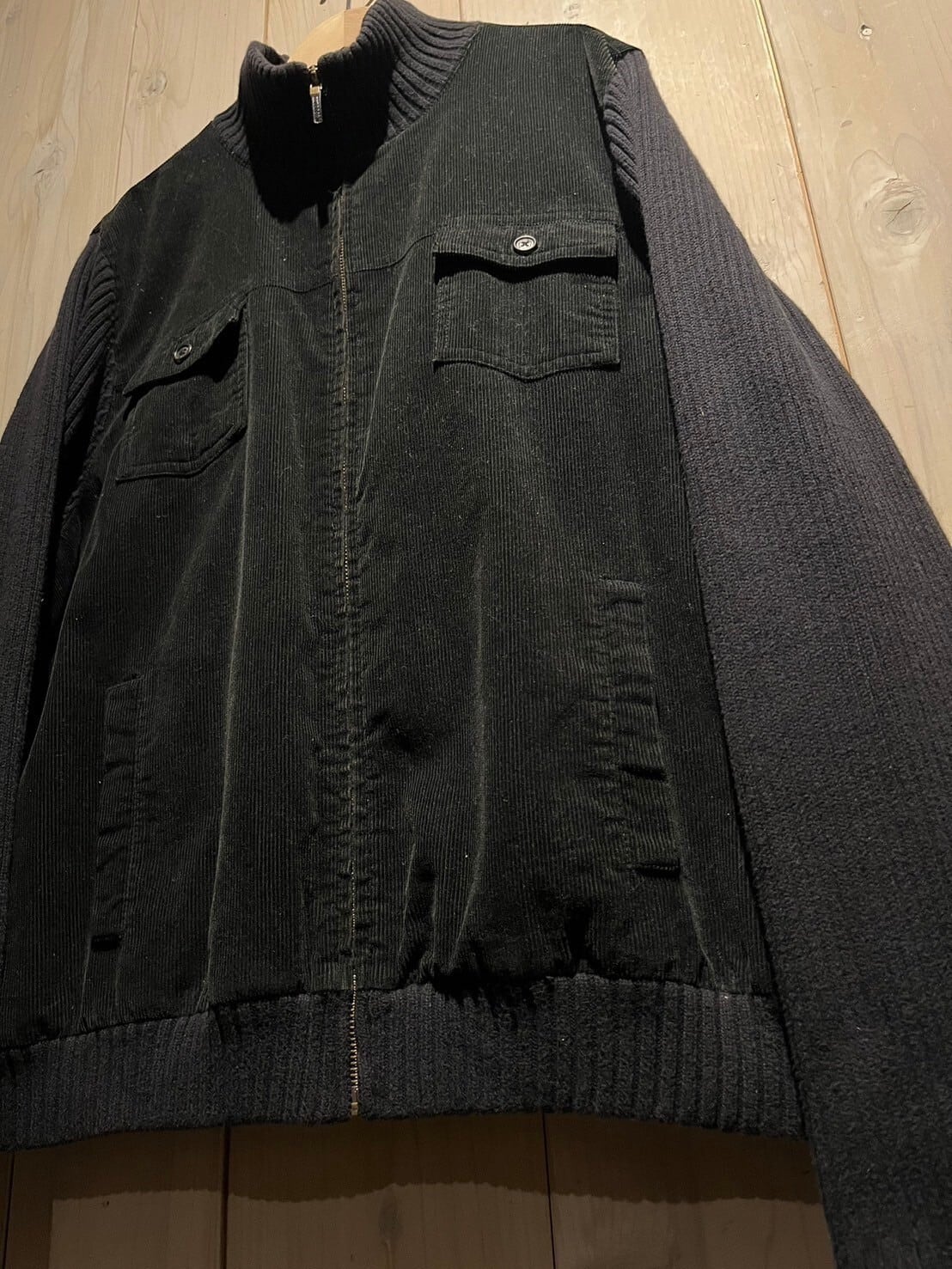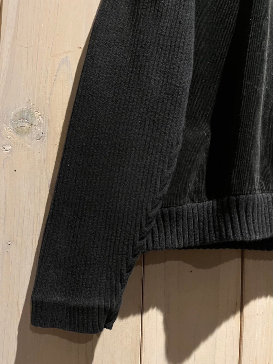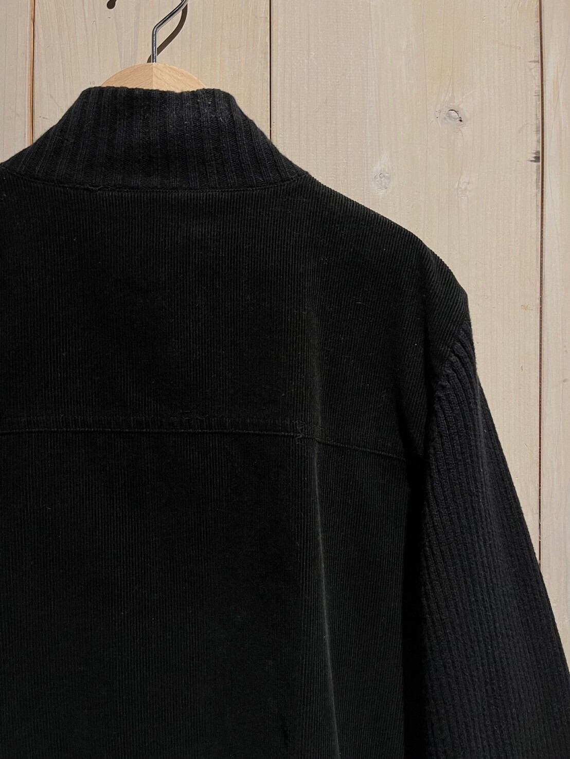 ブラックのリブニットをベースに、ボディにコーデュロイ素材を切り替えた、ドライバーズ型のニットジャケット。