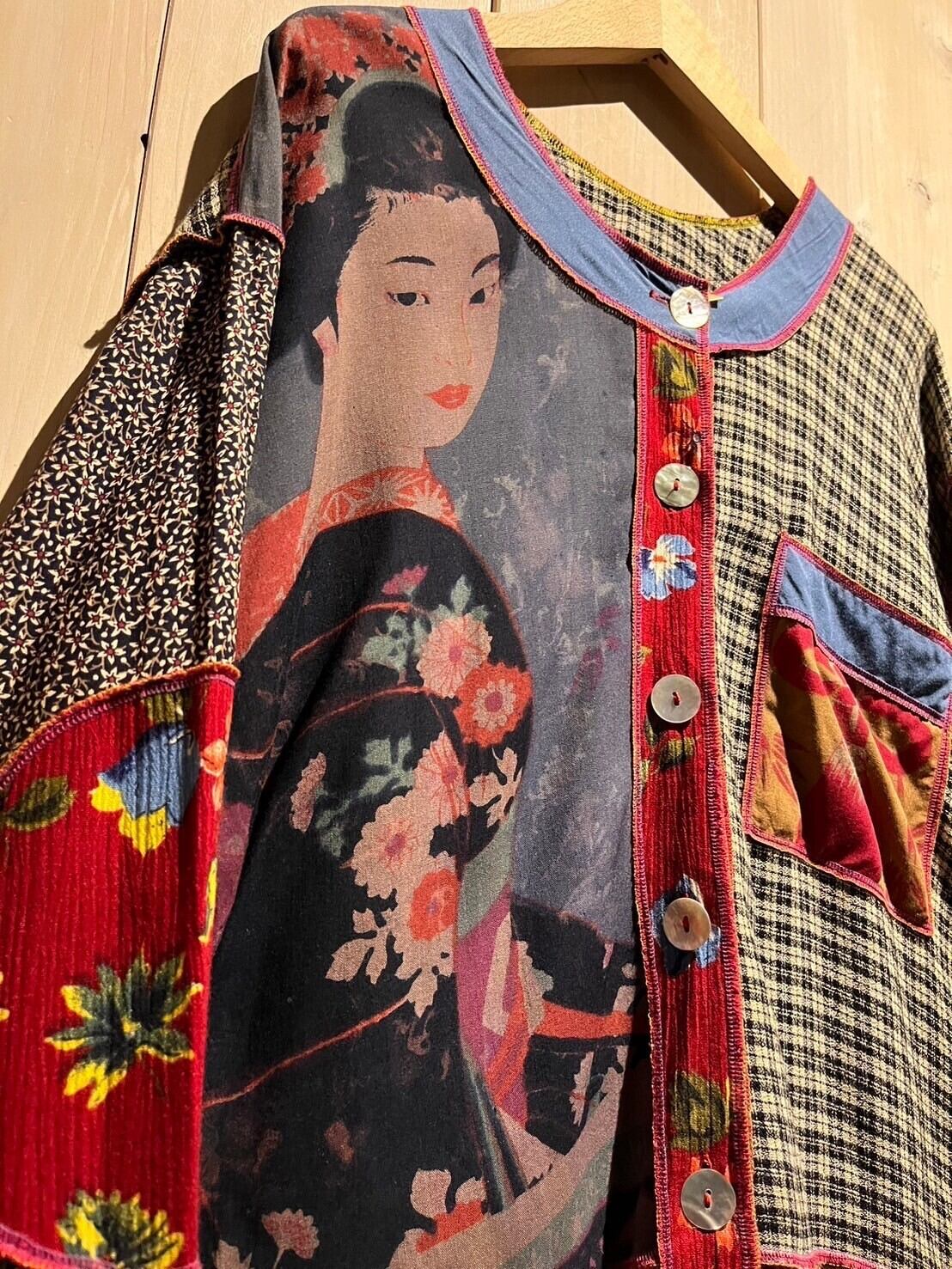 チェック、ドット、花柄など様々なデザインの生地をパッチワーク風にデザイン、"洋"の要素の中に"和"のデザインを見事に組み込んだノーカラーシャツ。