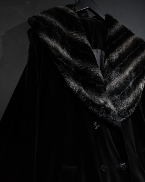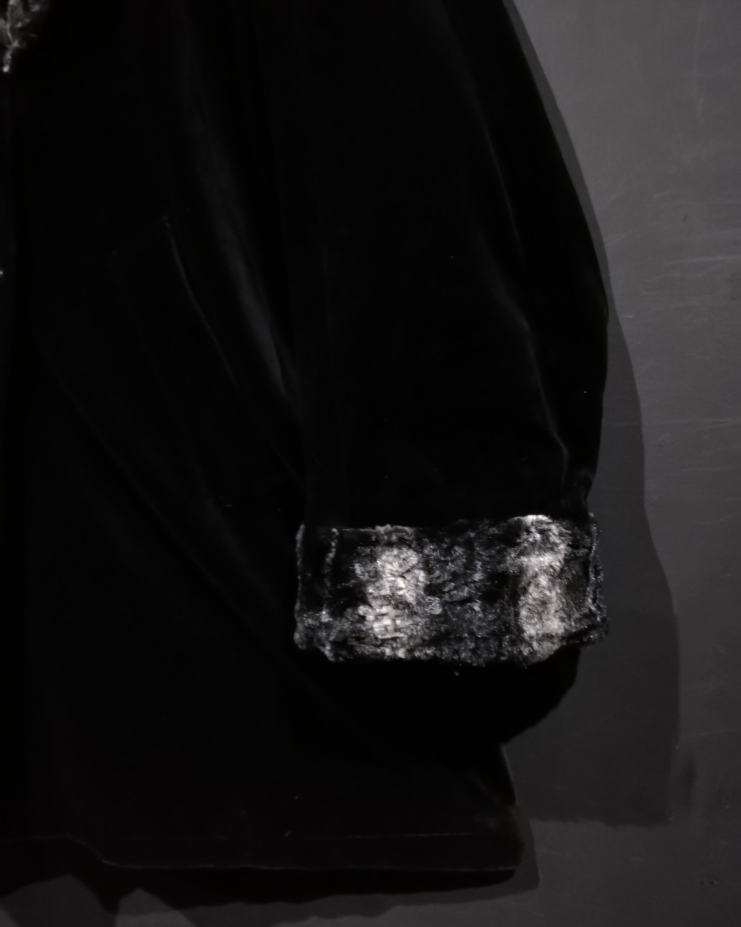雰囲気をムンムンに醸し出すファーとベロアの掛け合わせが非常にラグジュアリー。大ぶりなショールカラー、フロントはダブル仕立てでより一層高級感を引き立てています。