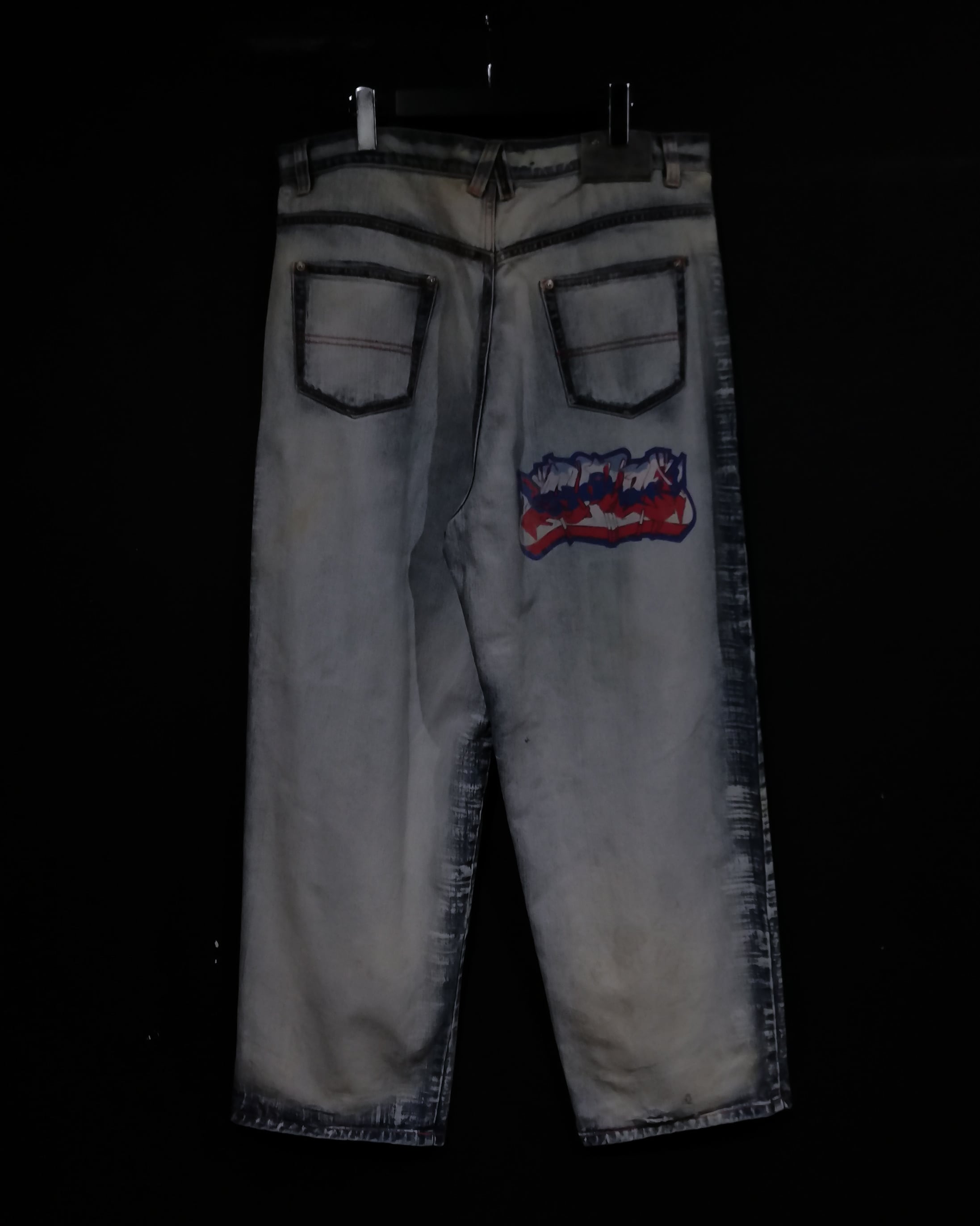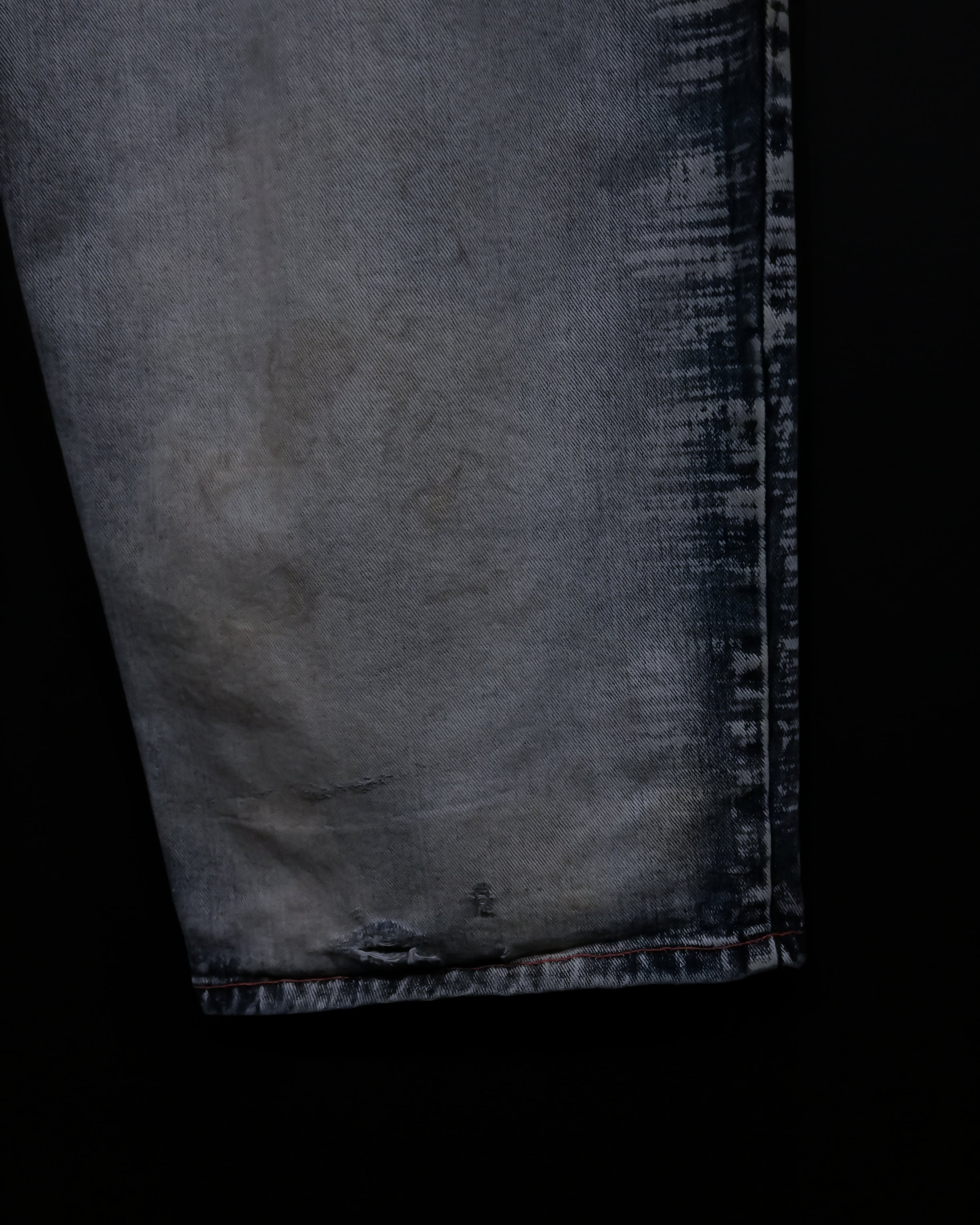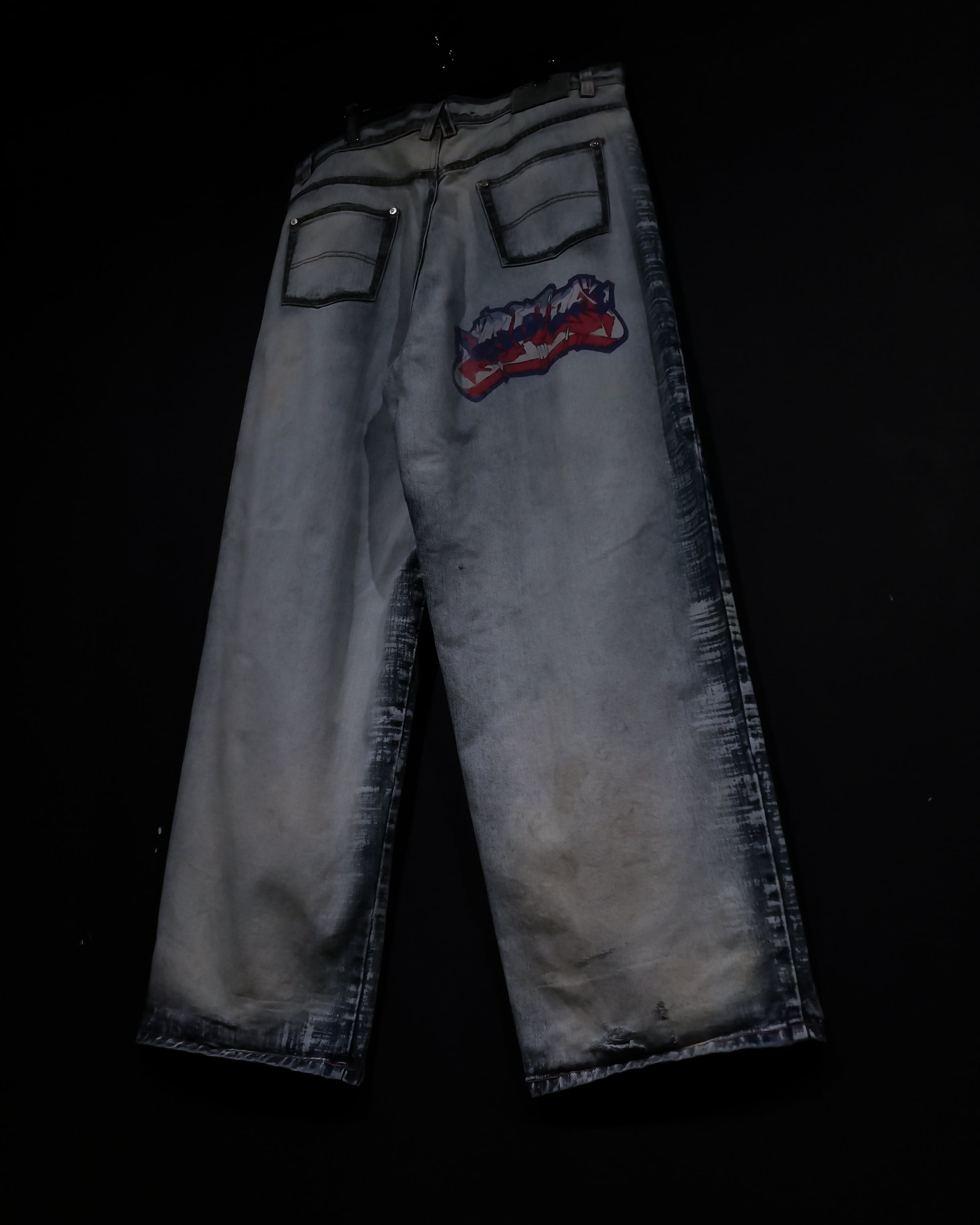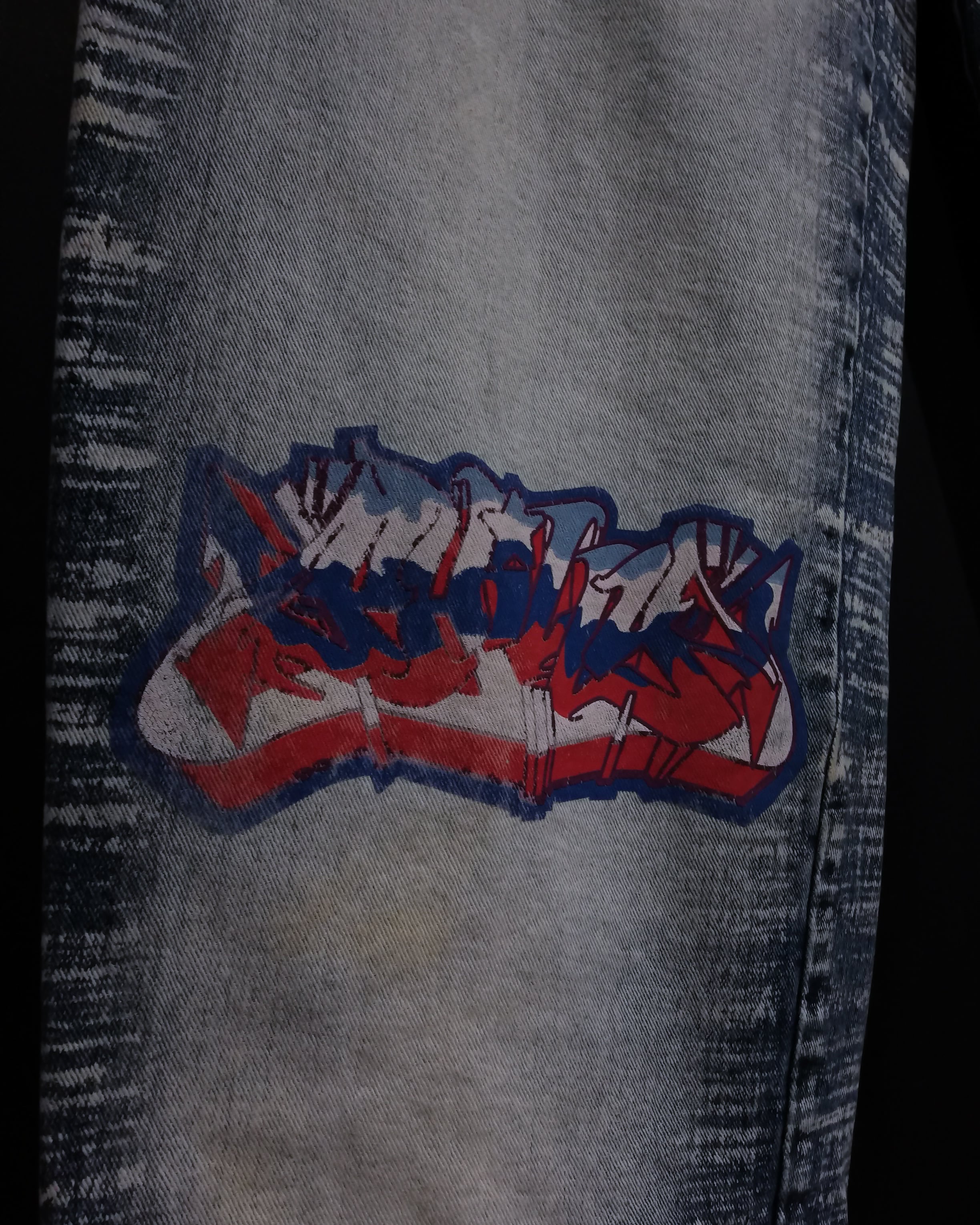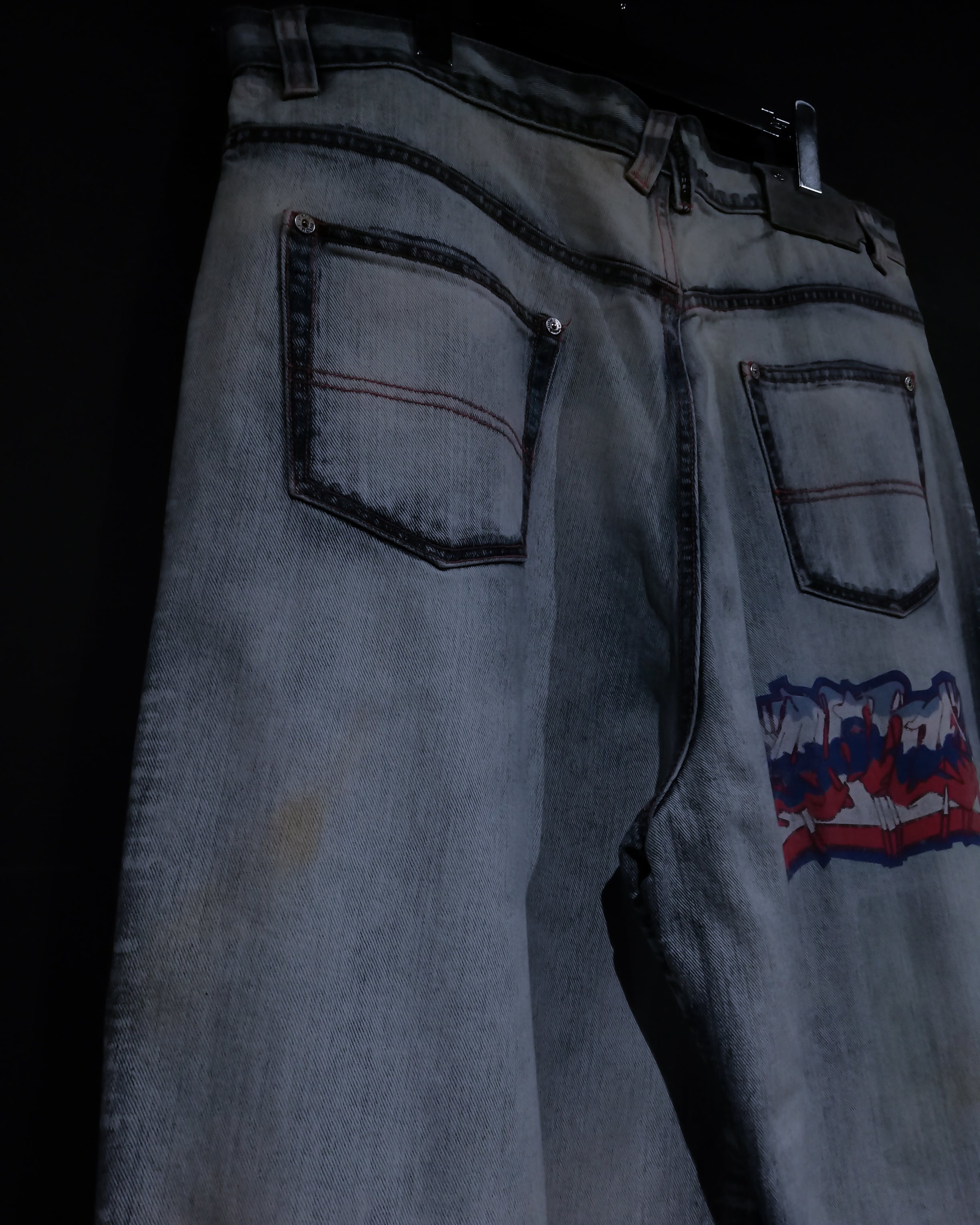 経年変化による表情の変化をエイジング加工で表現したボディに、太腿や裾付近そして背面にもストリート調のアートをプリントで載せたバギーデニムパンツ。