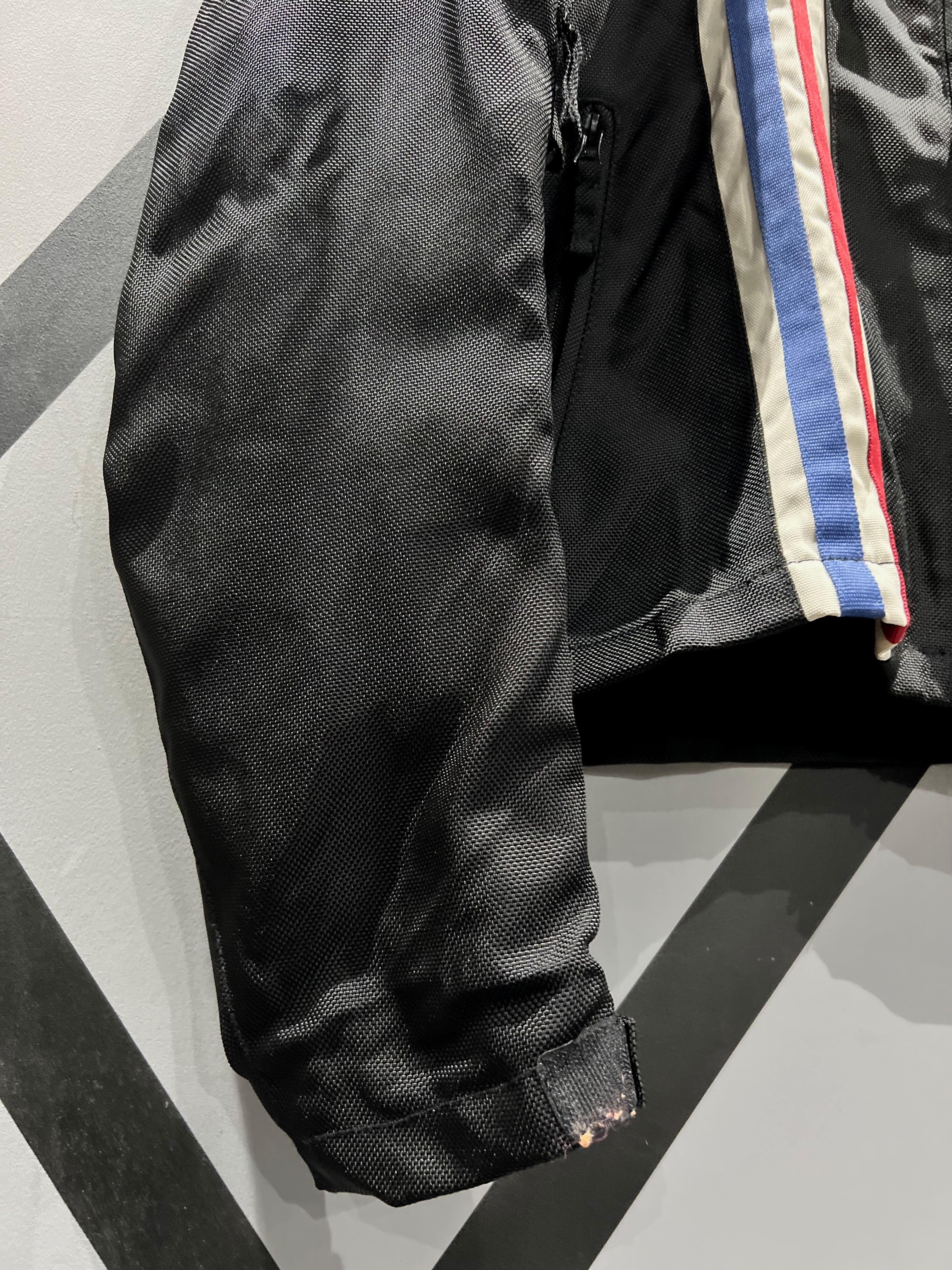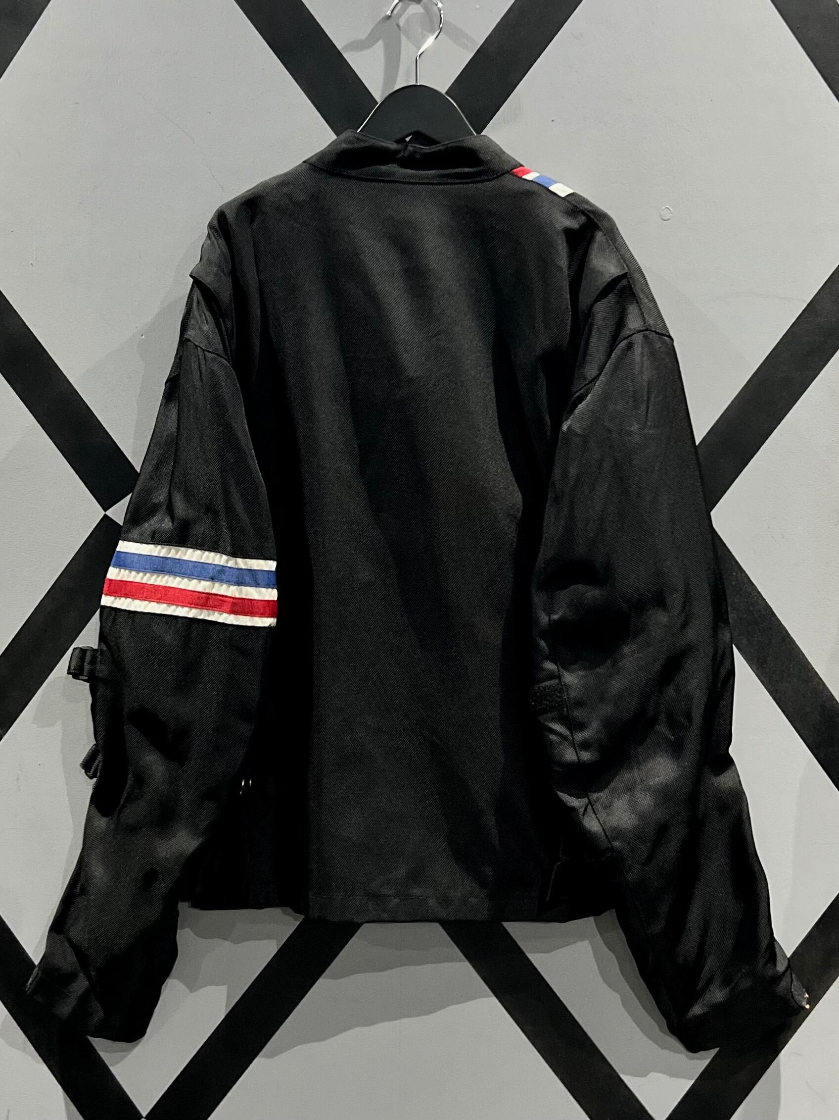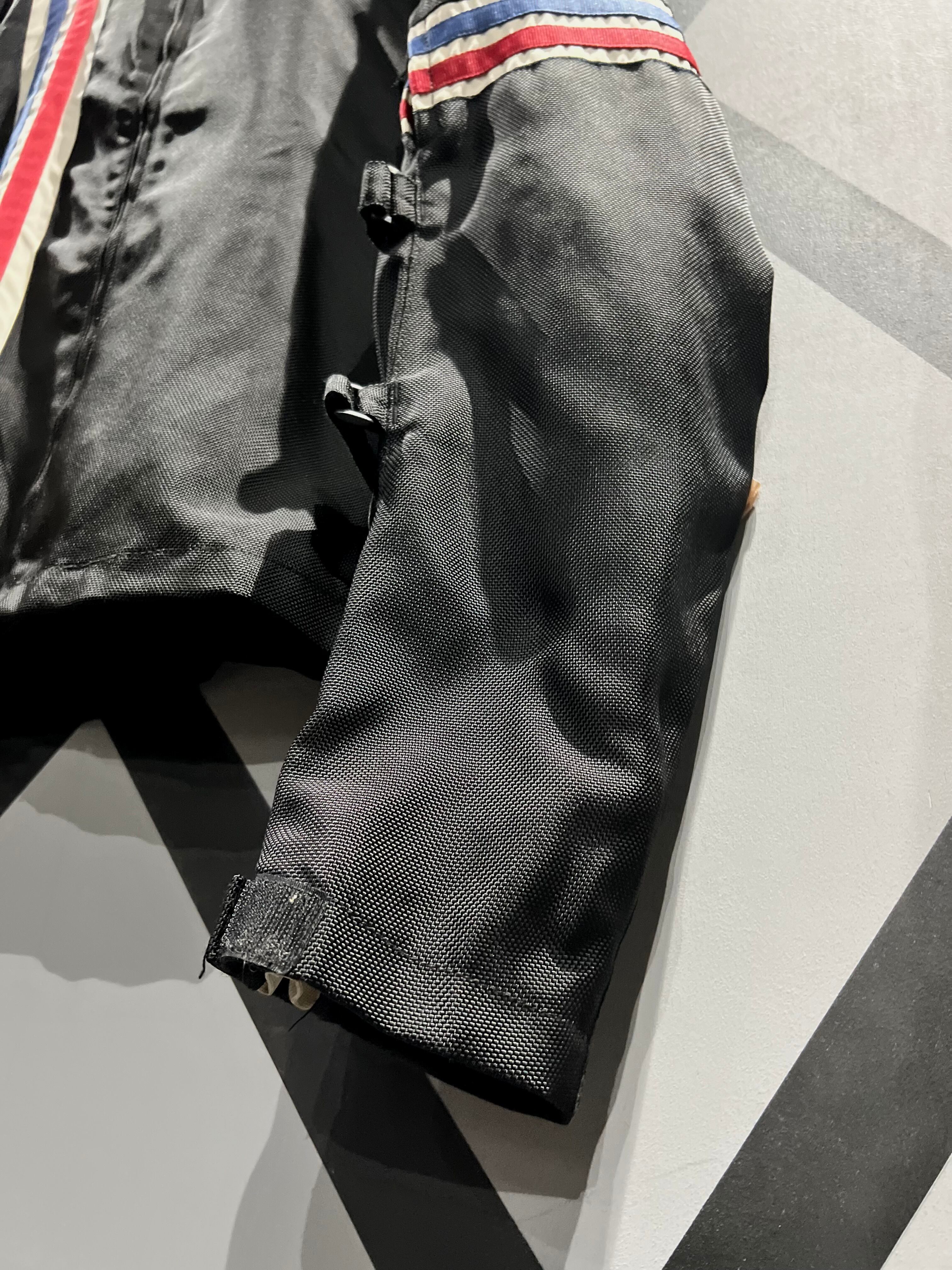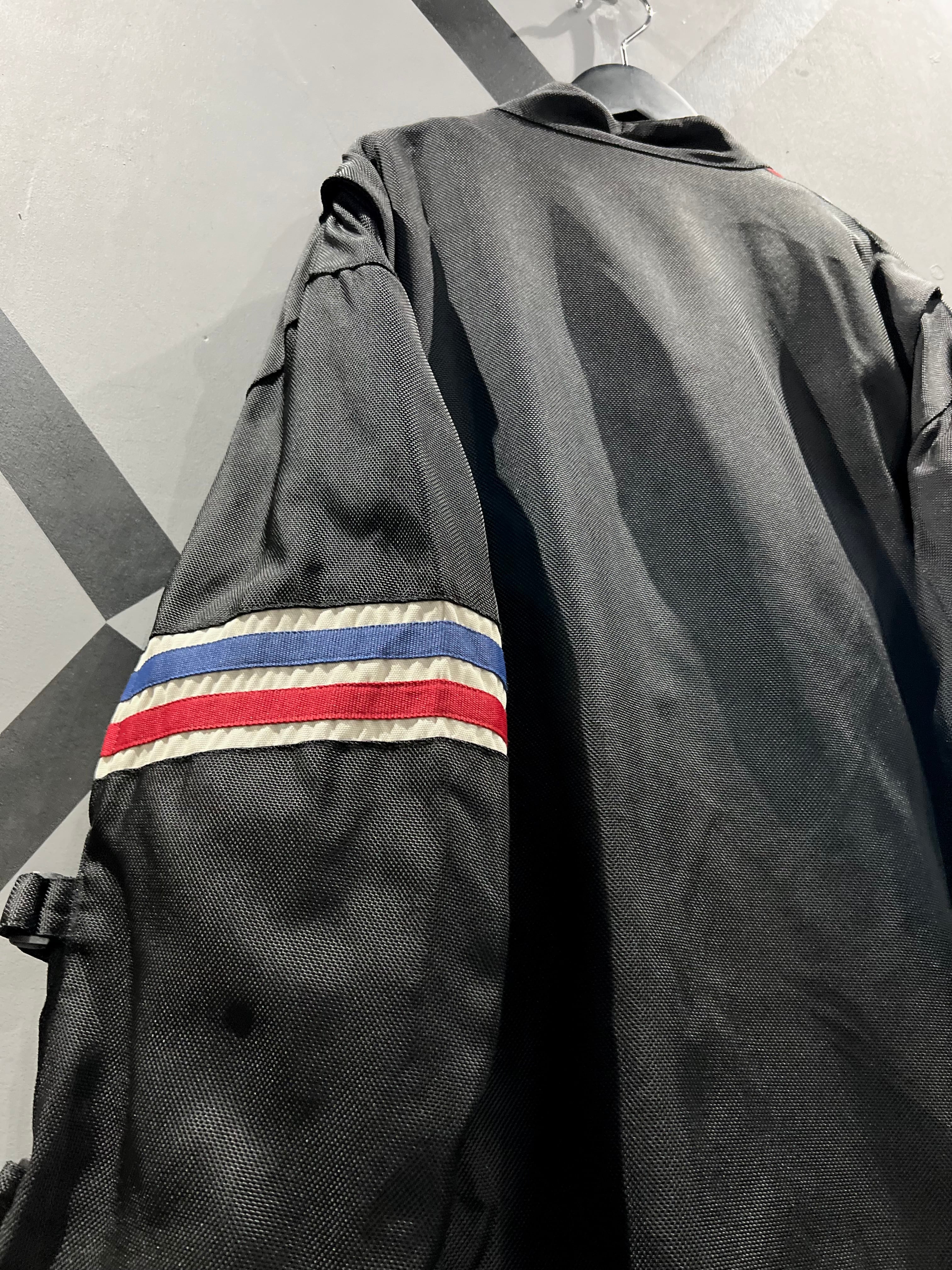 ハリのあるタフなブラックのボディをベースに、右ボディ、赤、青、白のカラーリングでラインを載せた、モードかつテクニカルな雰囲気漂うレーシングジャケット。