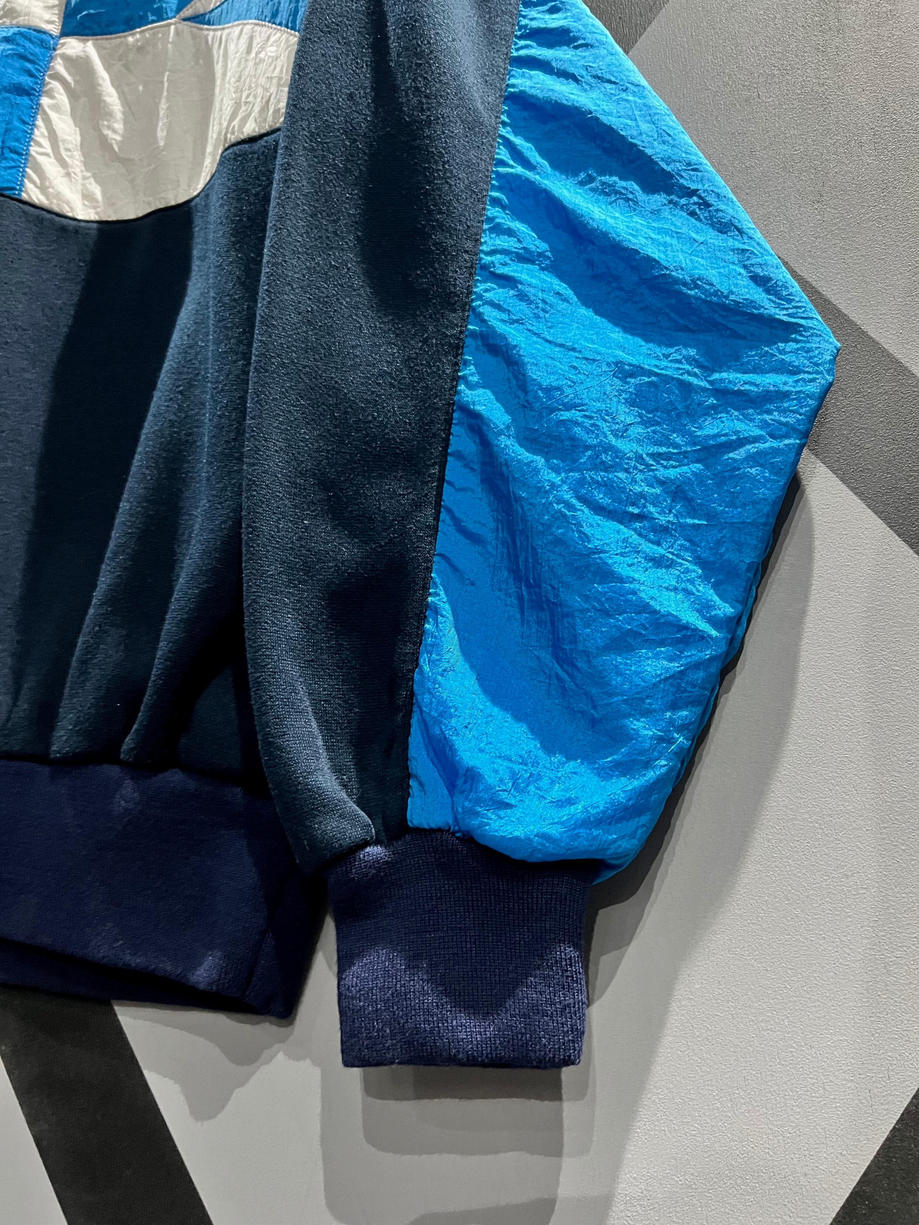 落ち着いたネイビーカラーの柔らかいスウェット生地をベースとし、袖やフロントにはナイロンという異素材を組み合わせたスウェットシャツ。