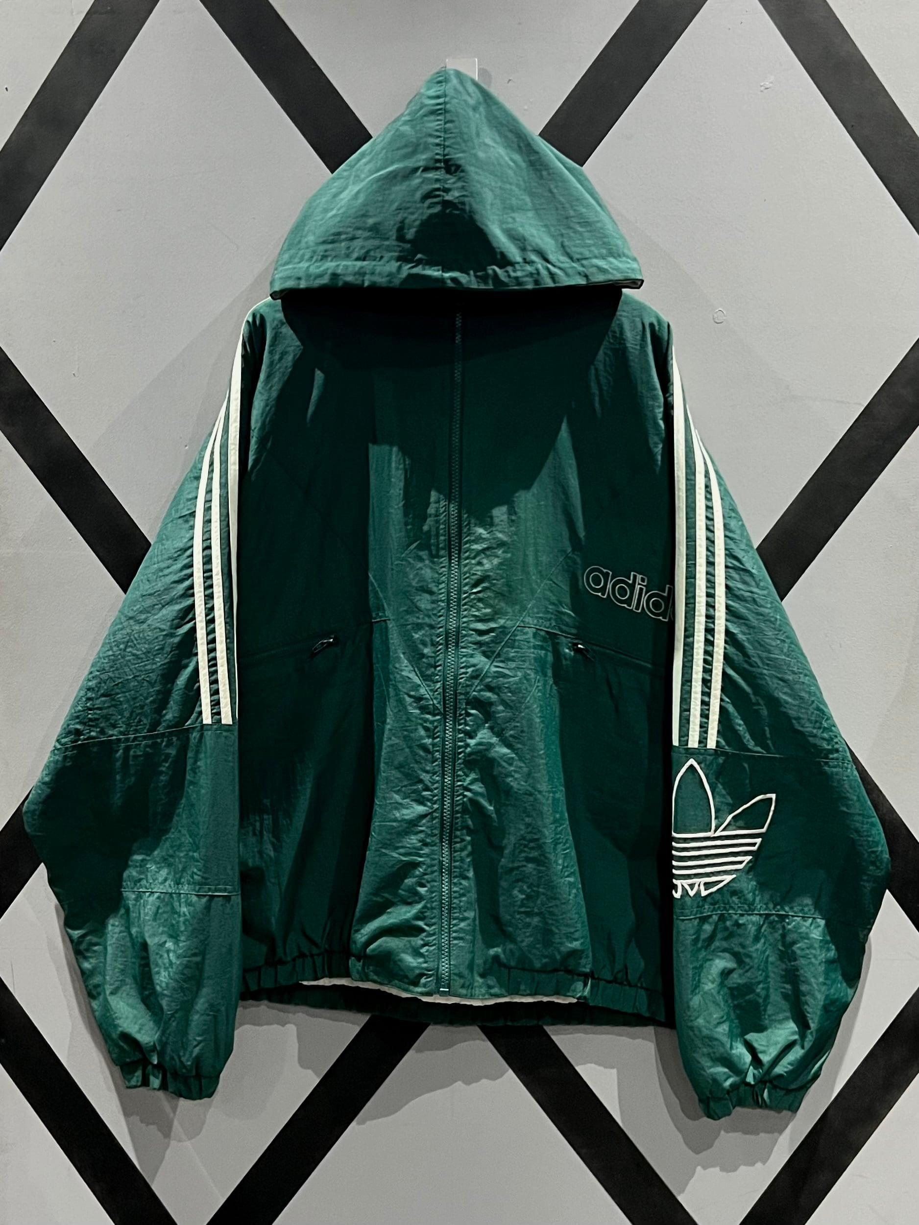 鮮やかなグリーンのナイロンを用いて、左胸元には"adidas"の文字、左袖にはトレフォイルロゴ刺繍をON、そしてブランドのアイデンティティである3ラインが両袖を走らせ、ブランドの代名詞とも言えるデザインがこれでもかと詰め込まれた90'sの1着。