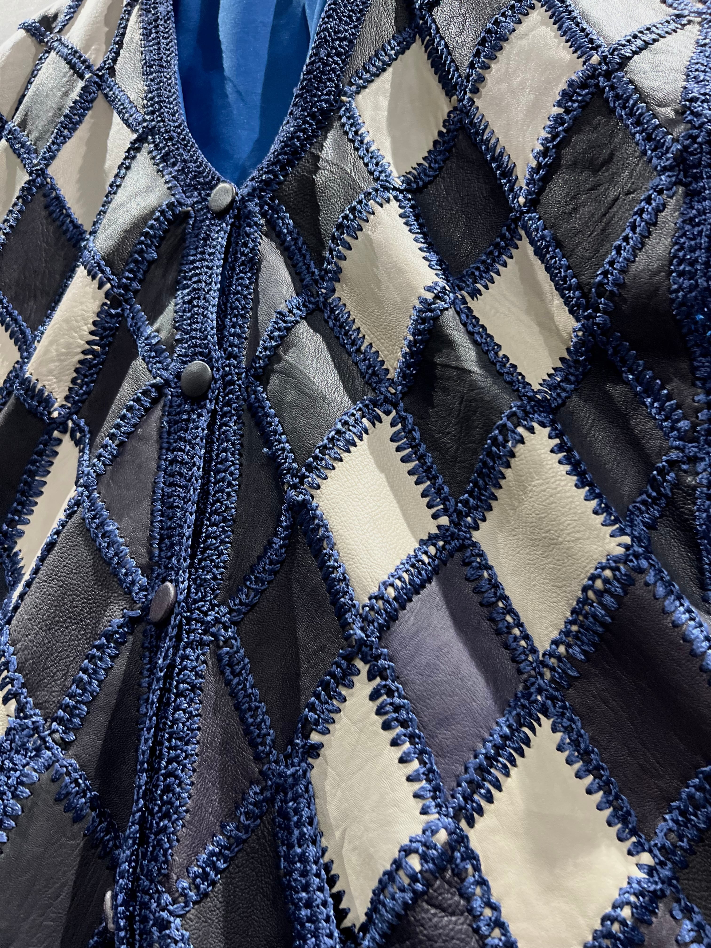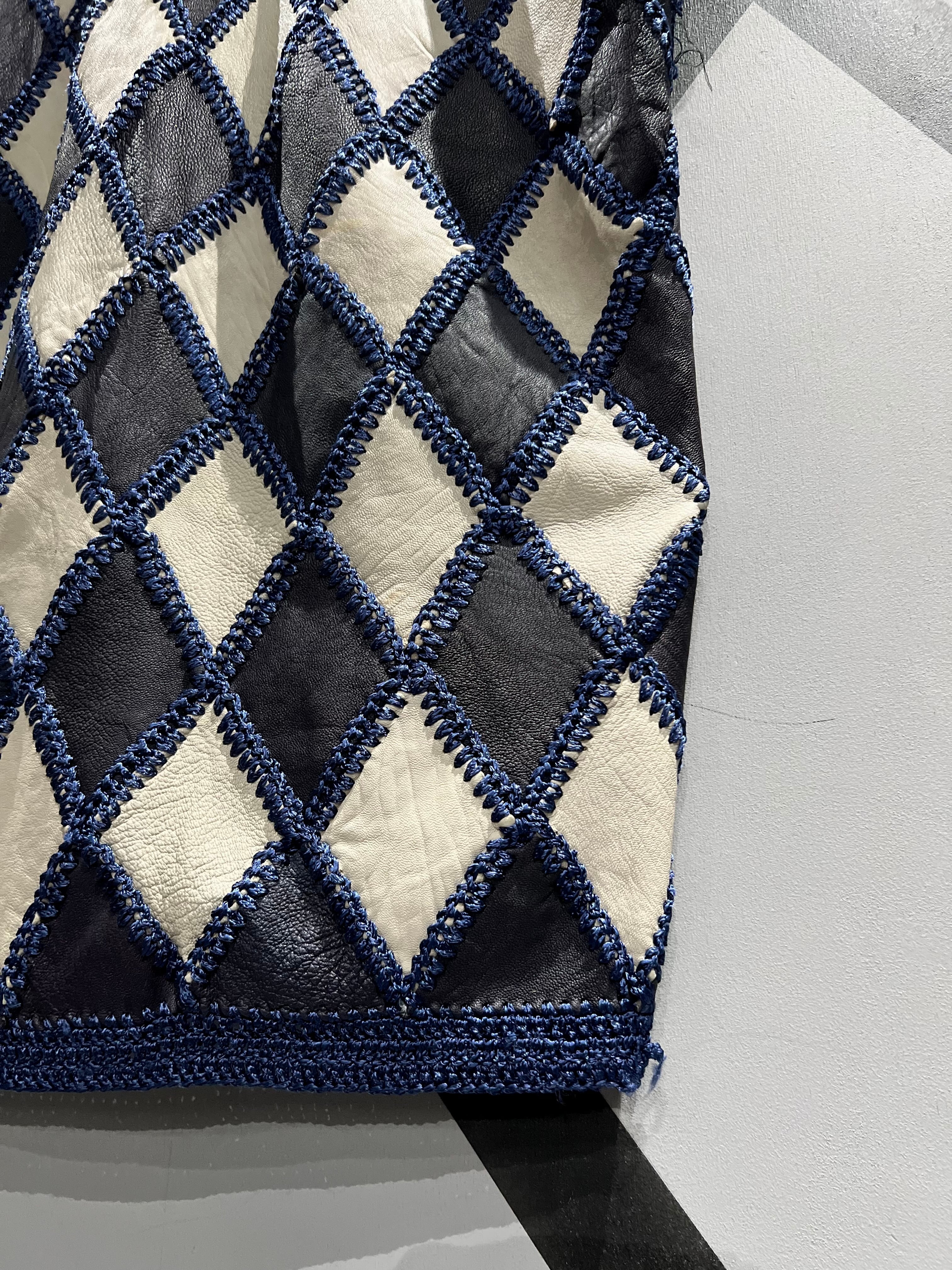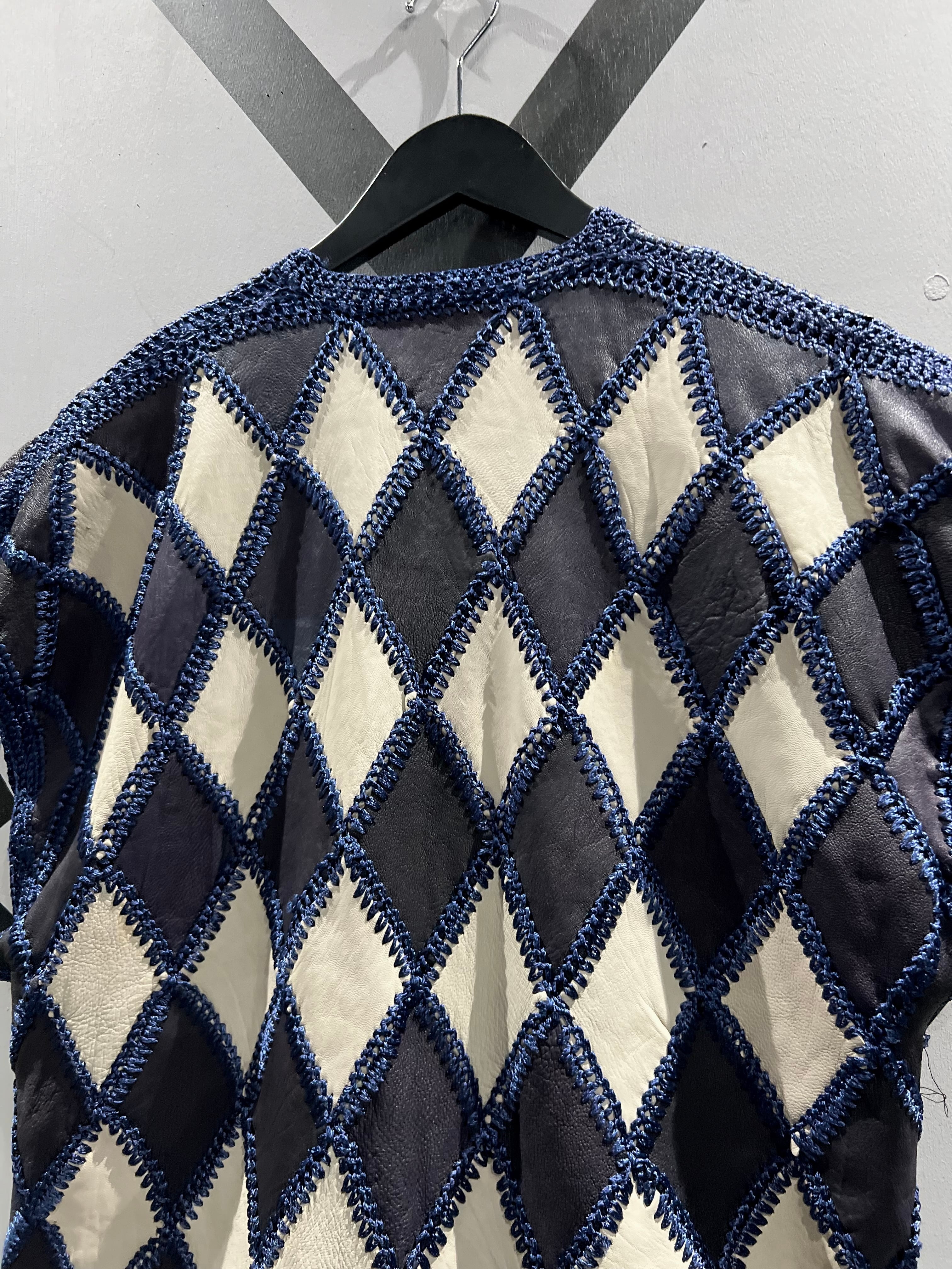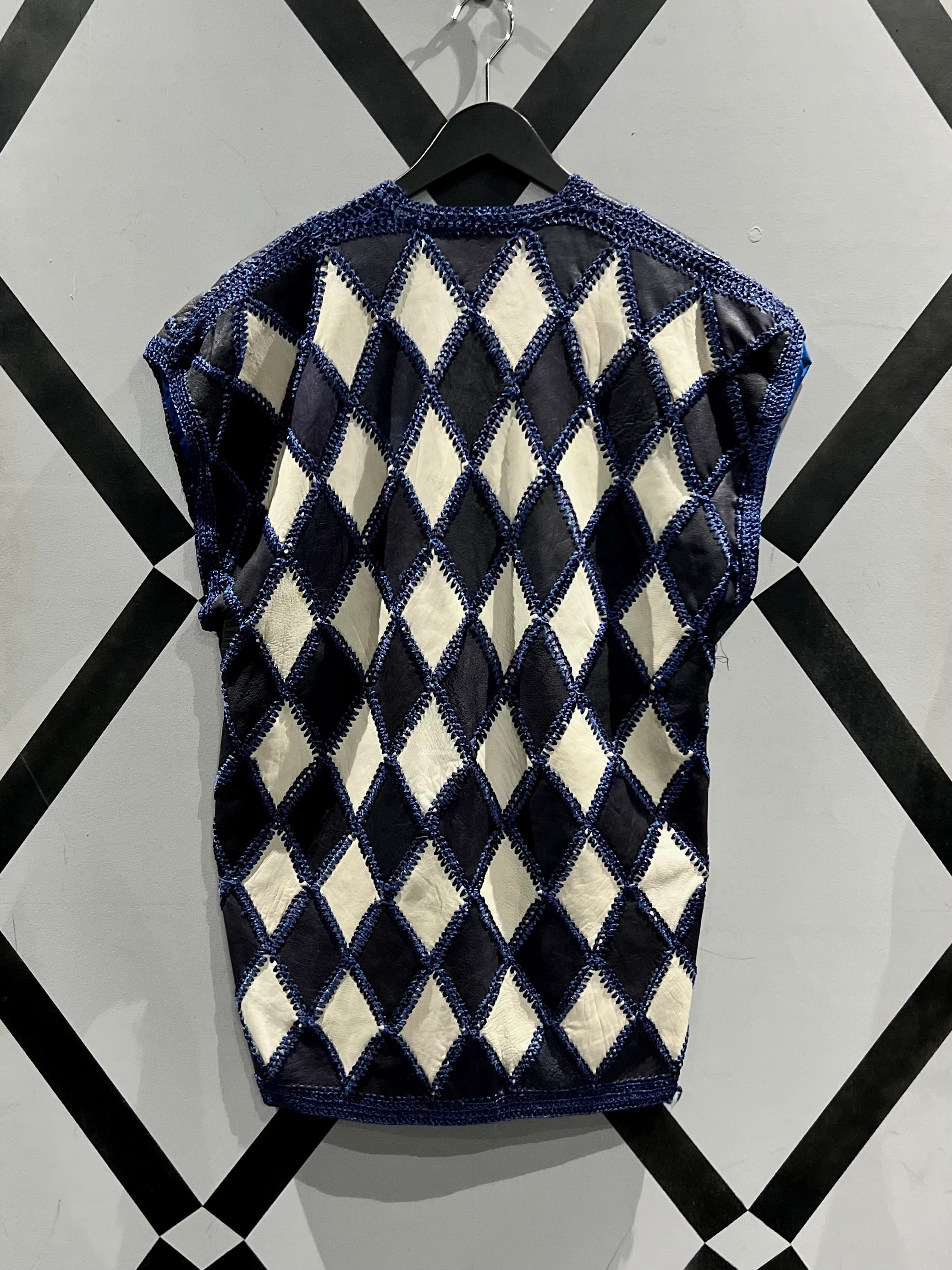 しなやかな質感のブラックとホワイトのレザーを用いて、繋ぎ目にはクロシェ編みによってパッチワークを施したレザーベスト。
