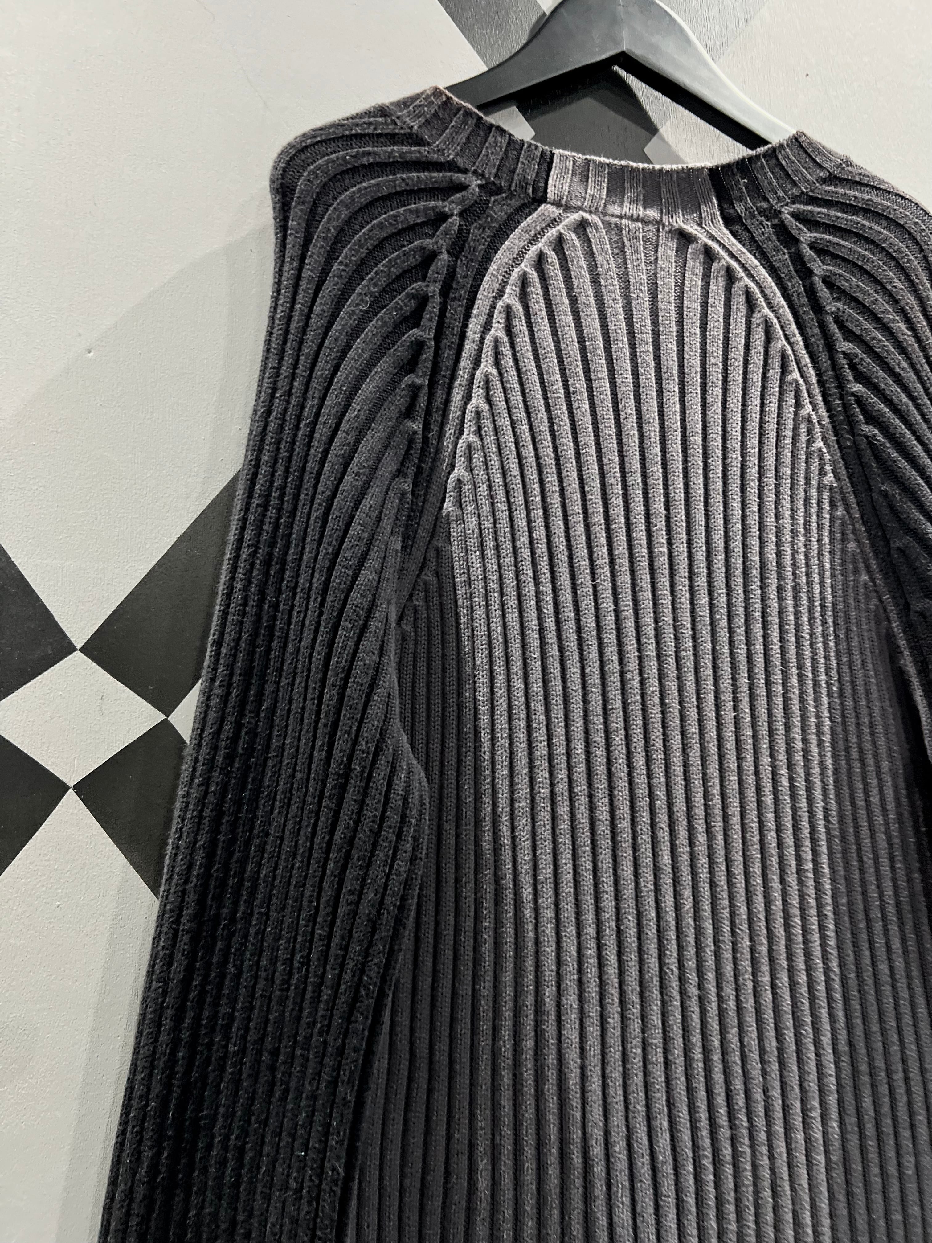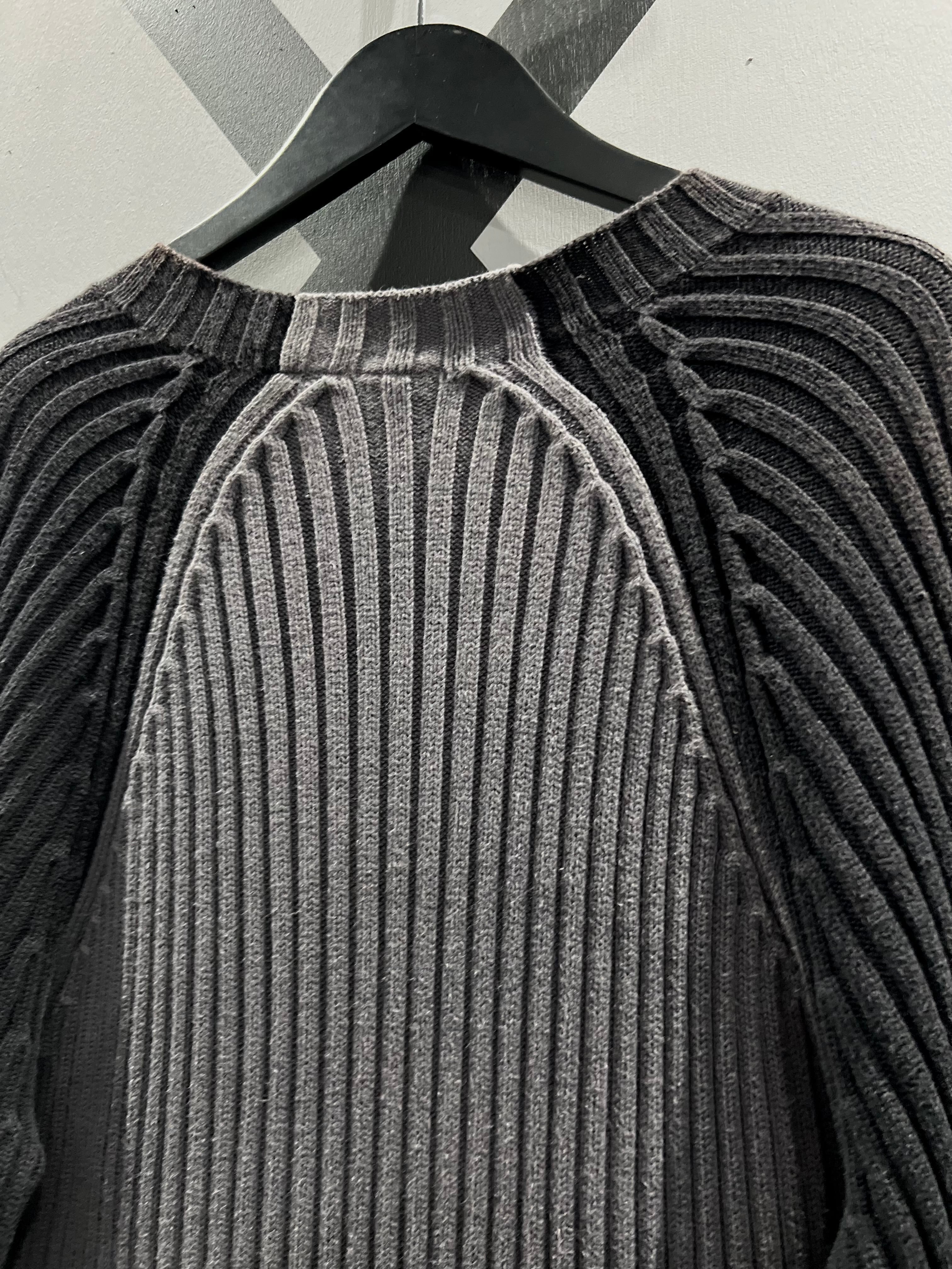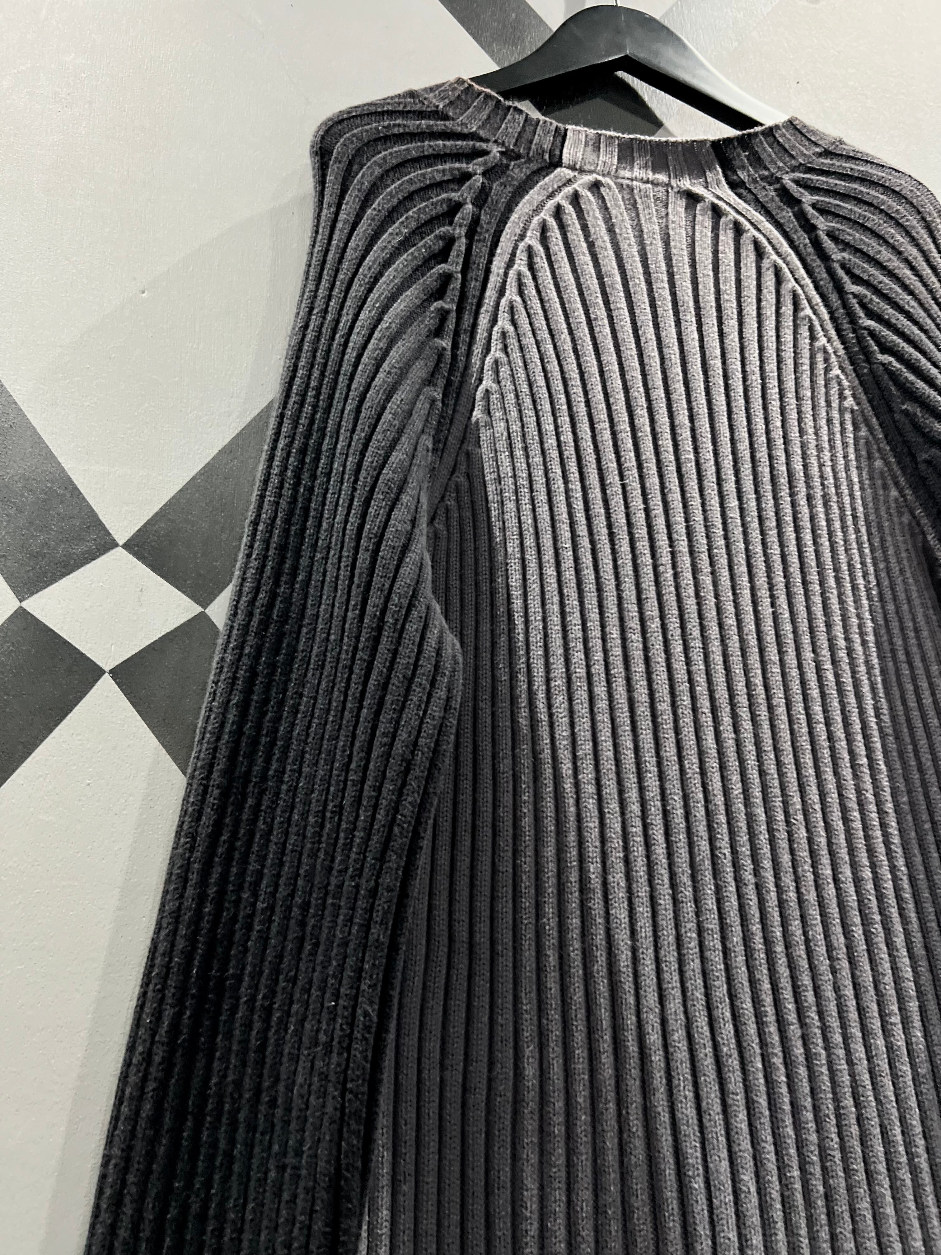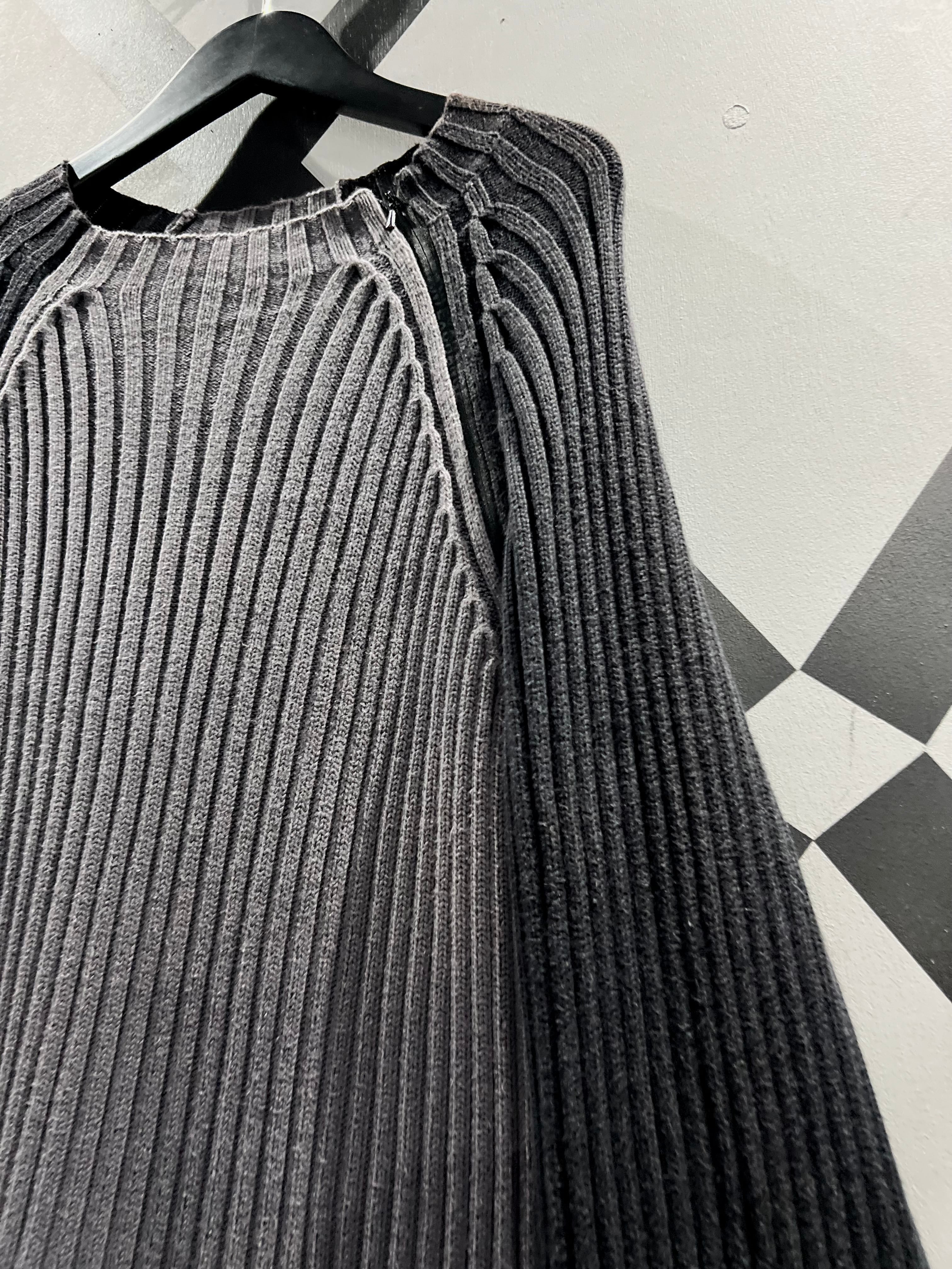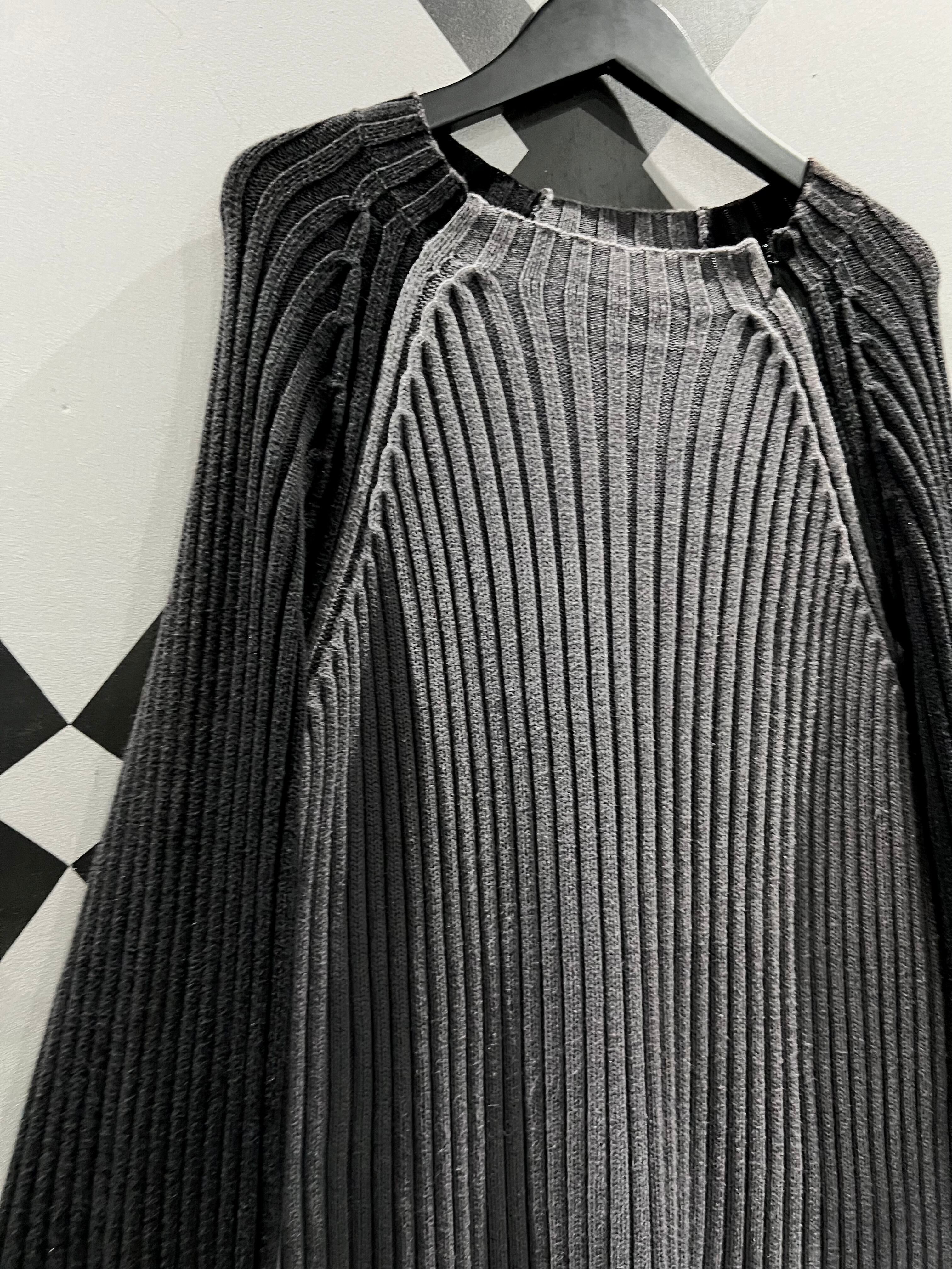 グレーのボディをベースに、アームに黒色を切り替え。左肩にジップのギミックを施したモードな雰囲気漂う1着。