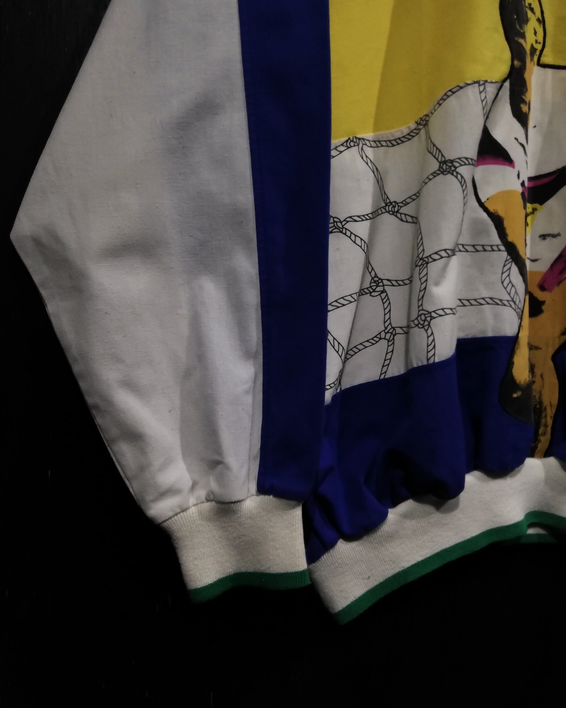いわゆるATP型のような、リブの効いた丸みのあるボディに、刺繍でテニスのデザインを載せたハーフジッププルオーバー。この型にこのデザイン、カルチャー的なバックボーンを感じ取れますね。