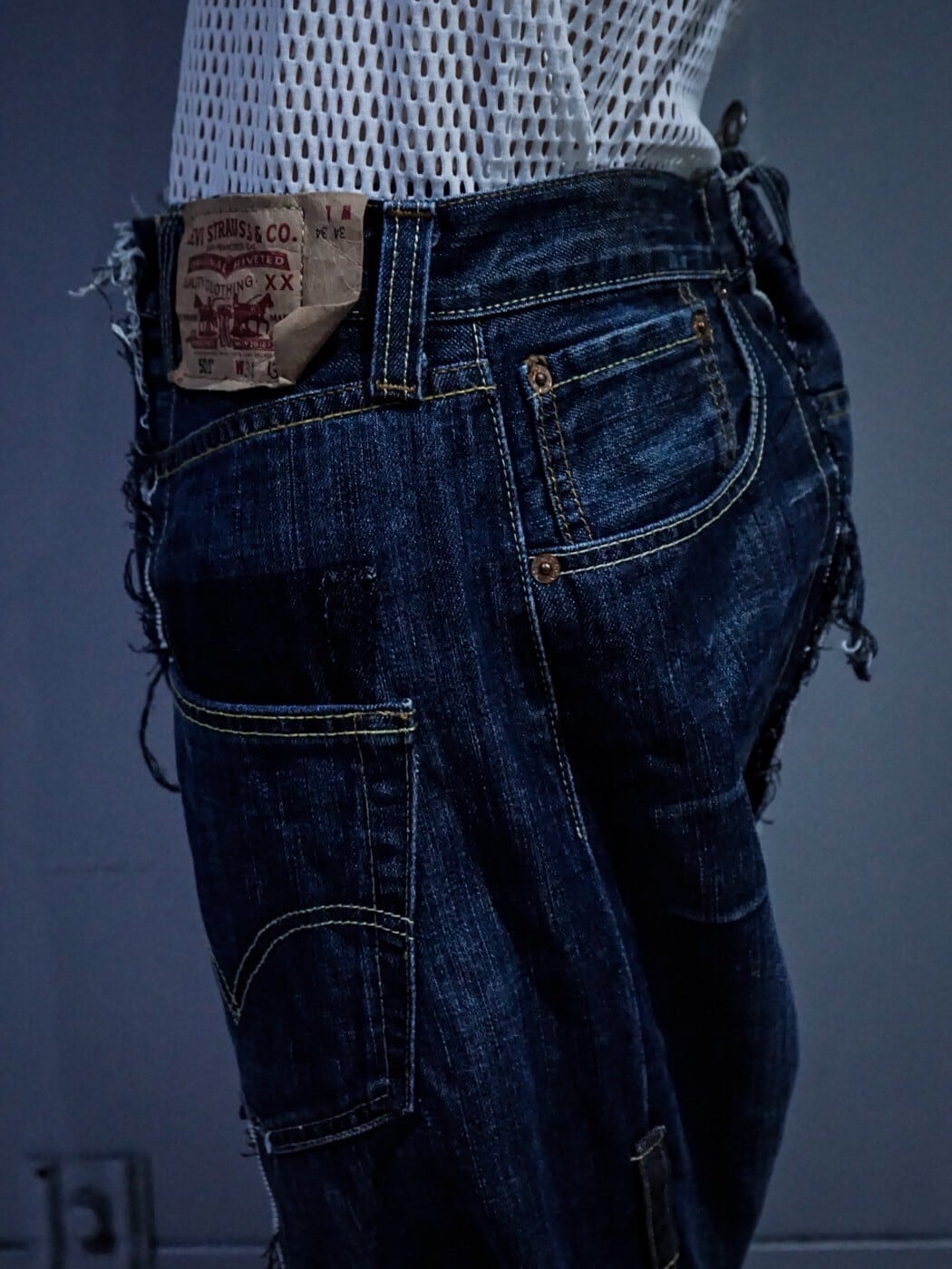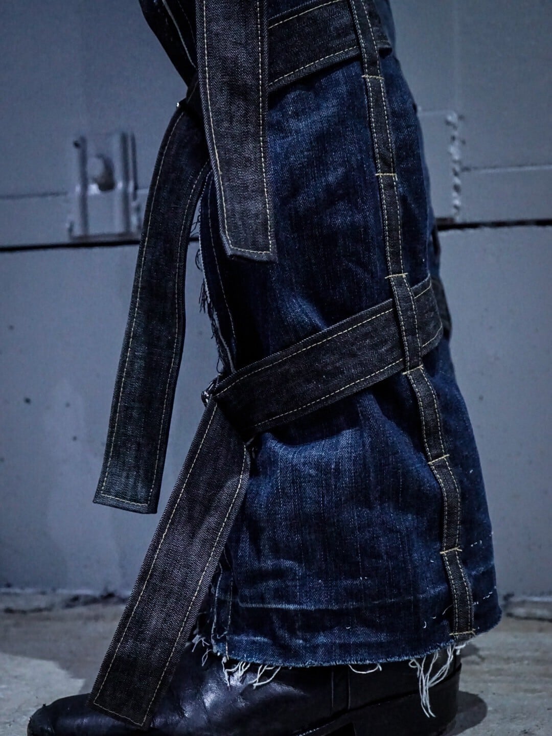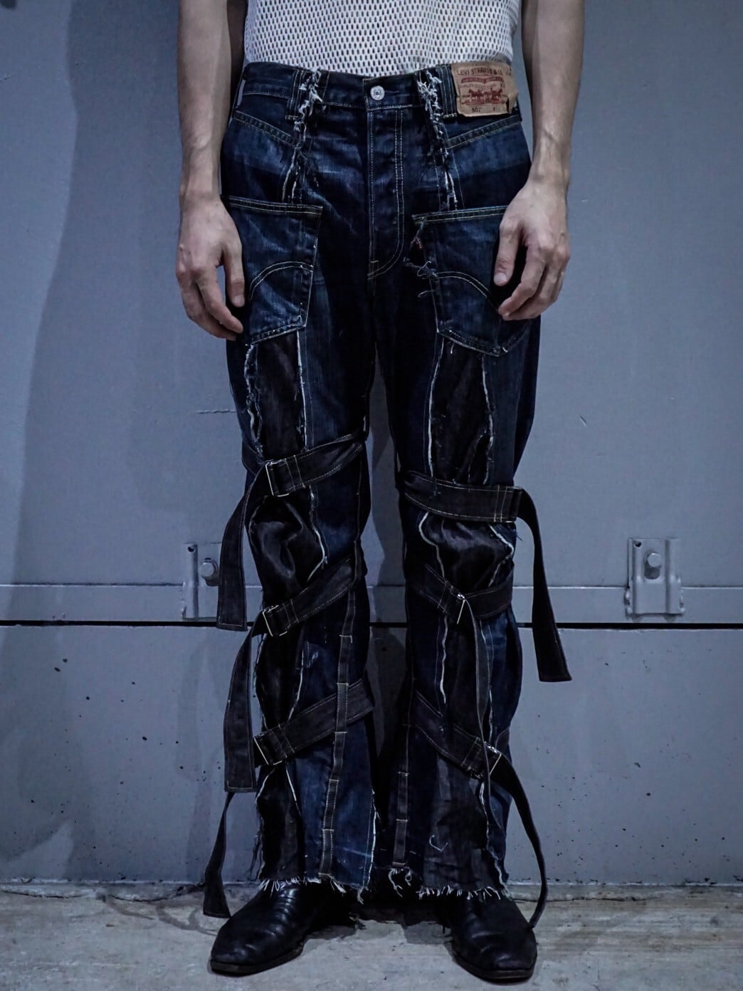 ボンテージというカルチャーを当店ならではの解釈の元、リメイクパンツへと落とし込んだ正に唯一無二な逸品。私たちが誇る“Original Remake”のスペシャルピースです。
