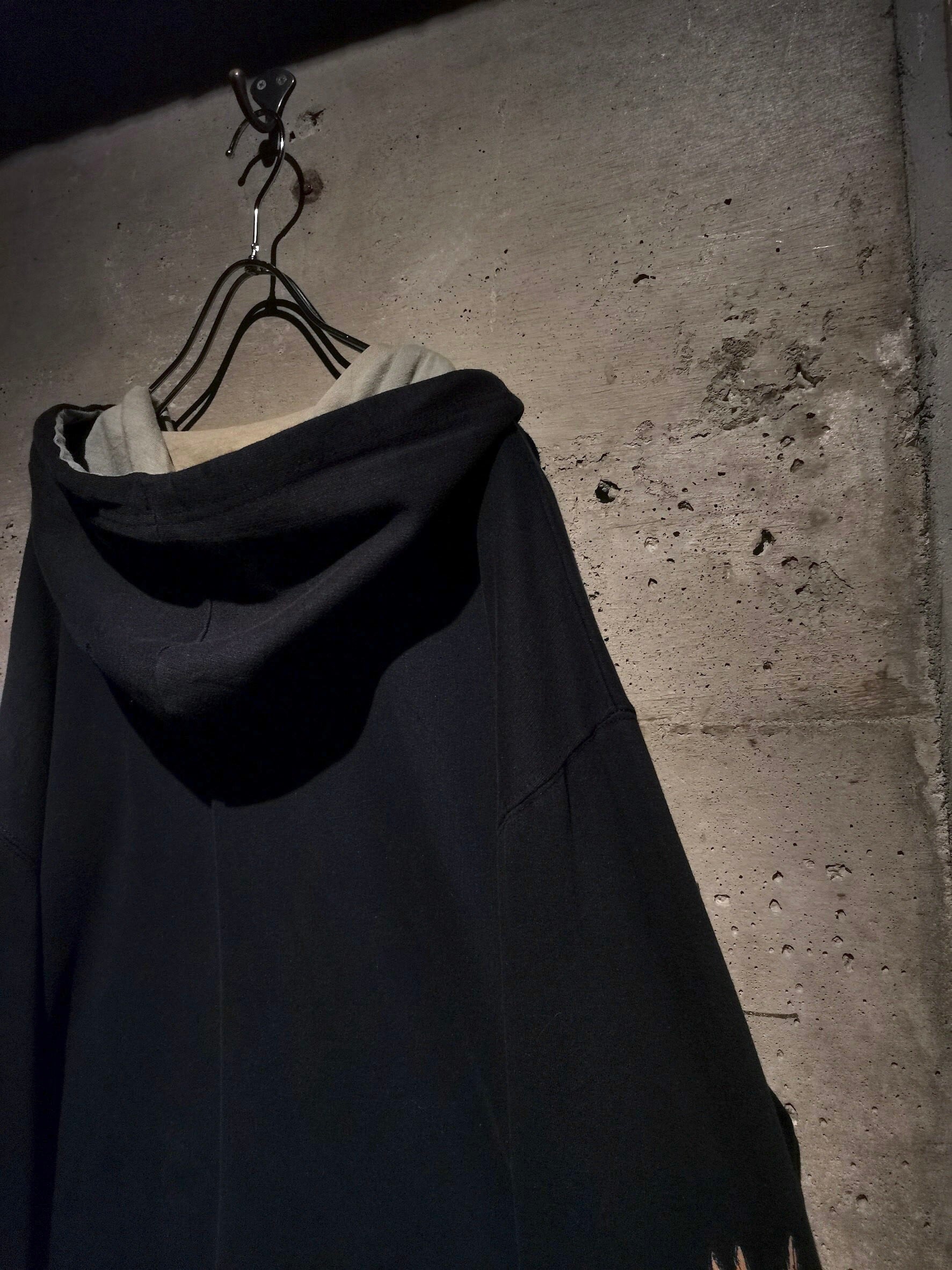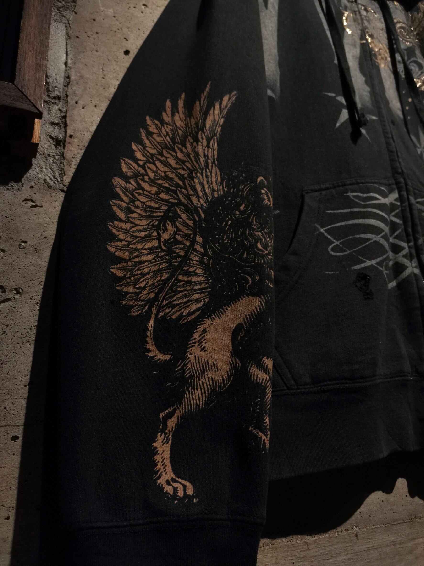 ライトなオンスのブラックボディをベースに、フロント、袖にゴシックなデザインをプリントしたジップアップフーディ。
